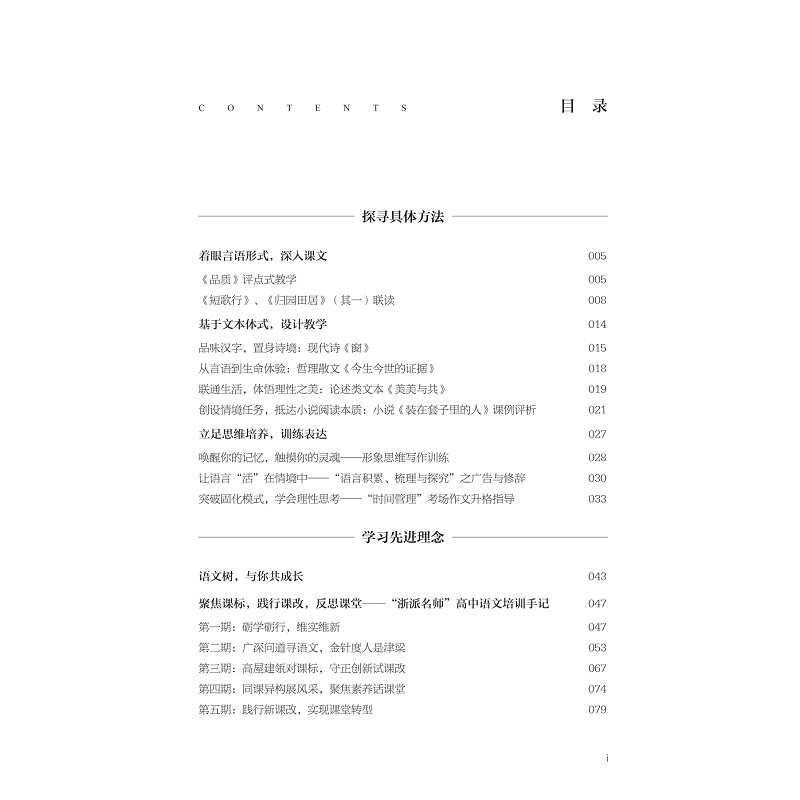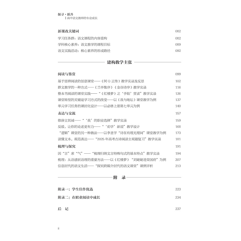 北京师范大学文学院研究员、博士生导师吴欣歆为本书作序。本书内容上分为三大部分:(一)探寻具体方法;(二)学习先进理念;(三)建构教学主张。其中“探寻具体方法”又分为“着眼言语形式”“基于文本体式”“立足思维培养”,以教学实录为核心;“学习先进理念”以“浙派名师”培训手记为重点,体现了与新课标一起成长的发展历程;“建构教学主张”分别从“阅读与鉴赏”“表达与交流”“梳理与探究”等角度,通过大量的课堂教学案例,体现了践行新课程理念的教学行动。“附录”部分精选了学生的习作,以及董一菲老师的点评文章《在职业阅读中成长》,全面客观地呈现了一位特级教师的职业追求与发展路径。