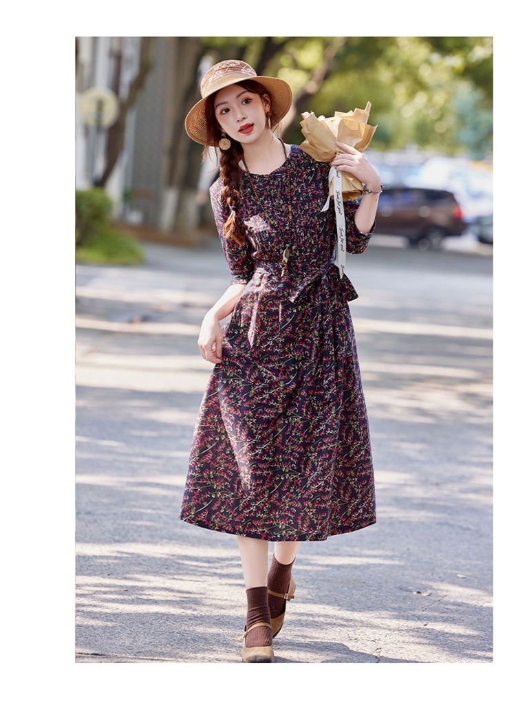 SYY2657长袖碎花连衣裙春秋季2025新款女装气质遮肚子减龄棉麻复古裙子 商品图4