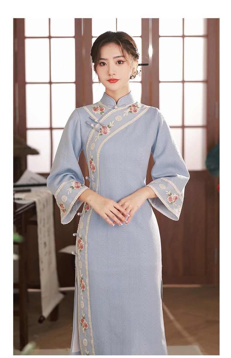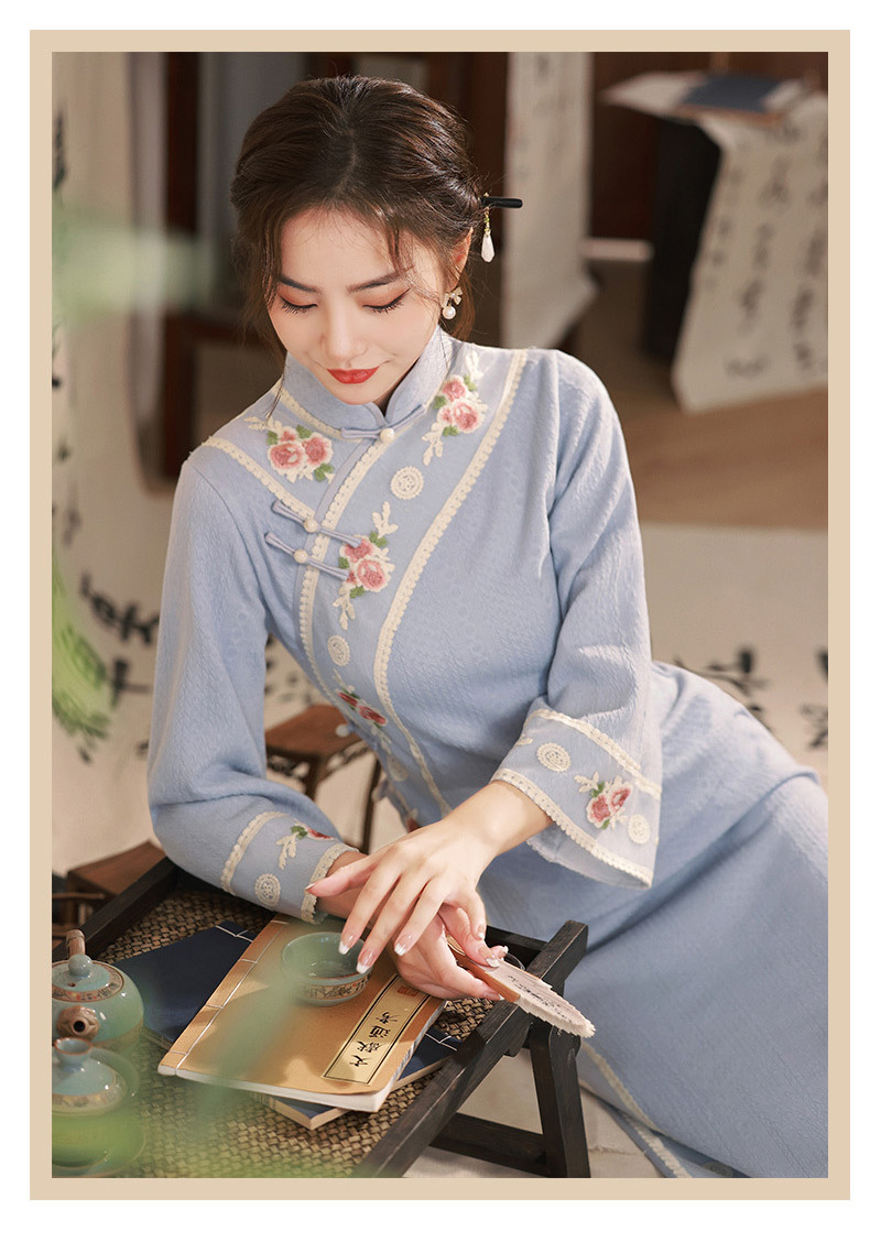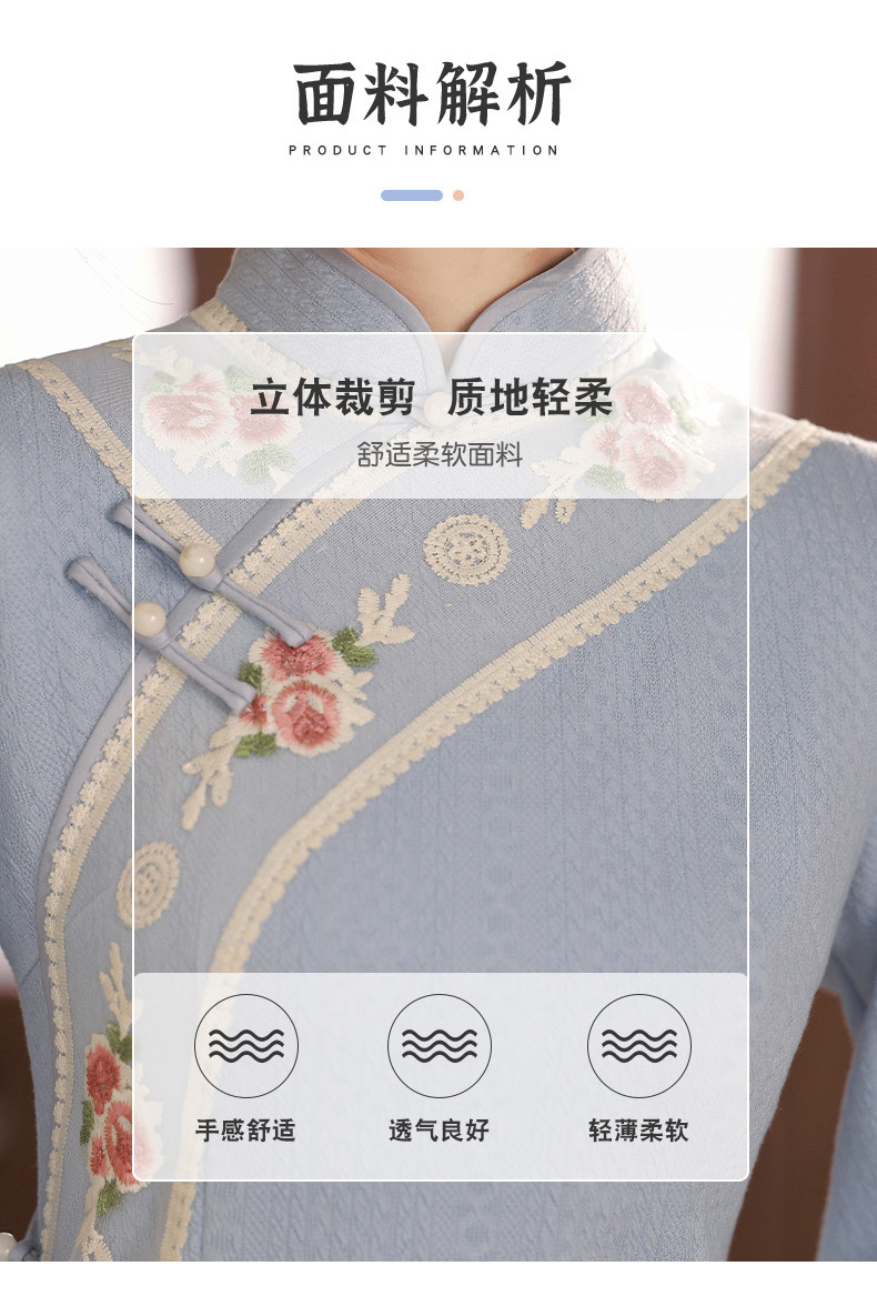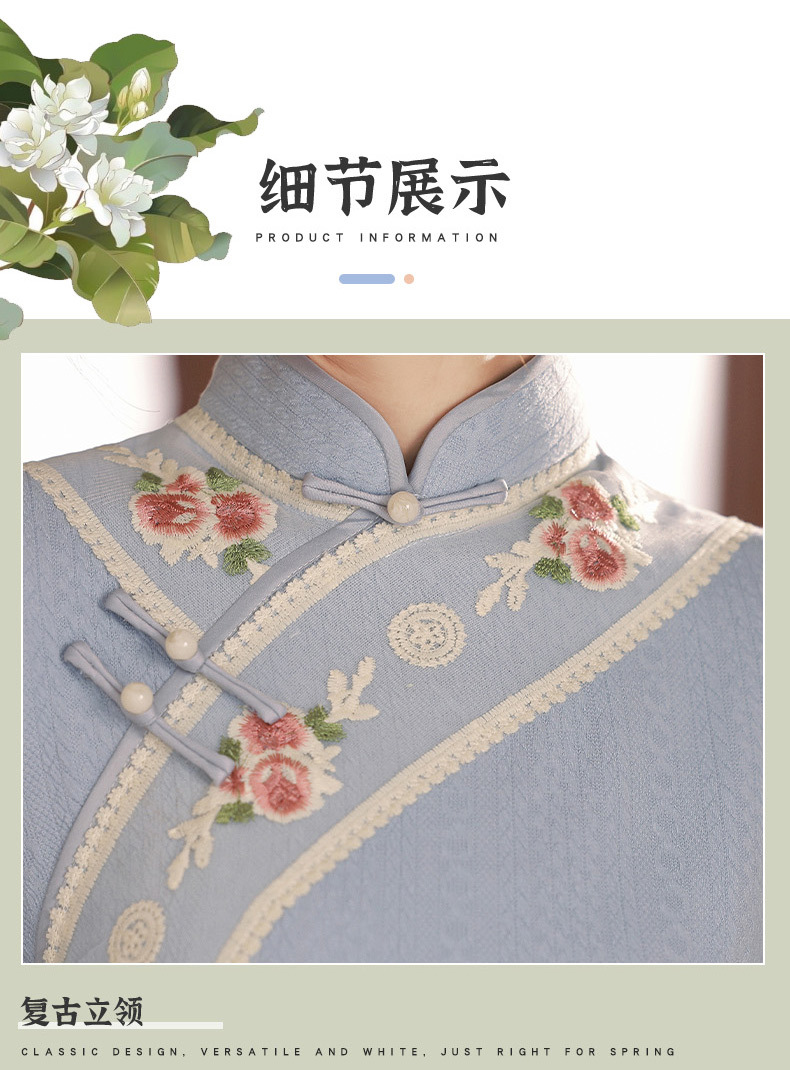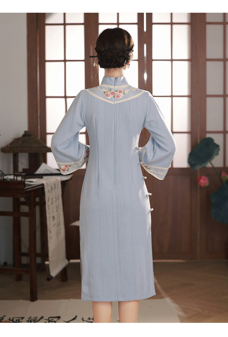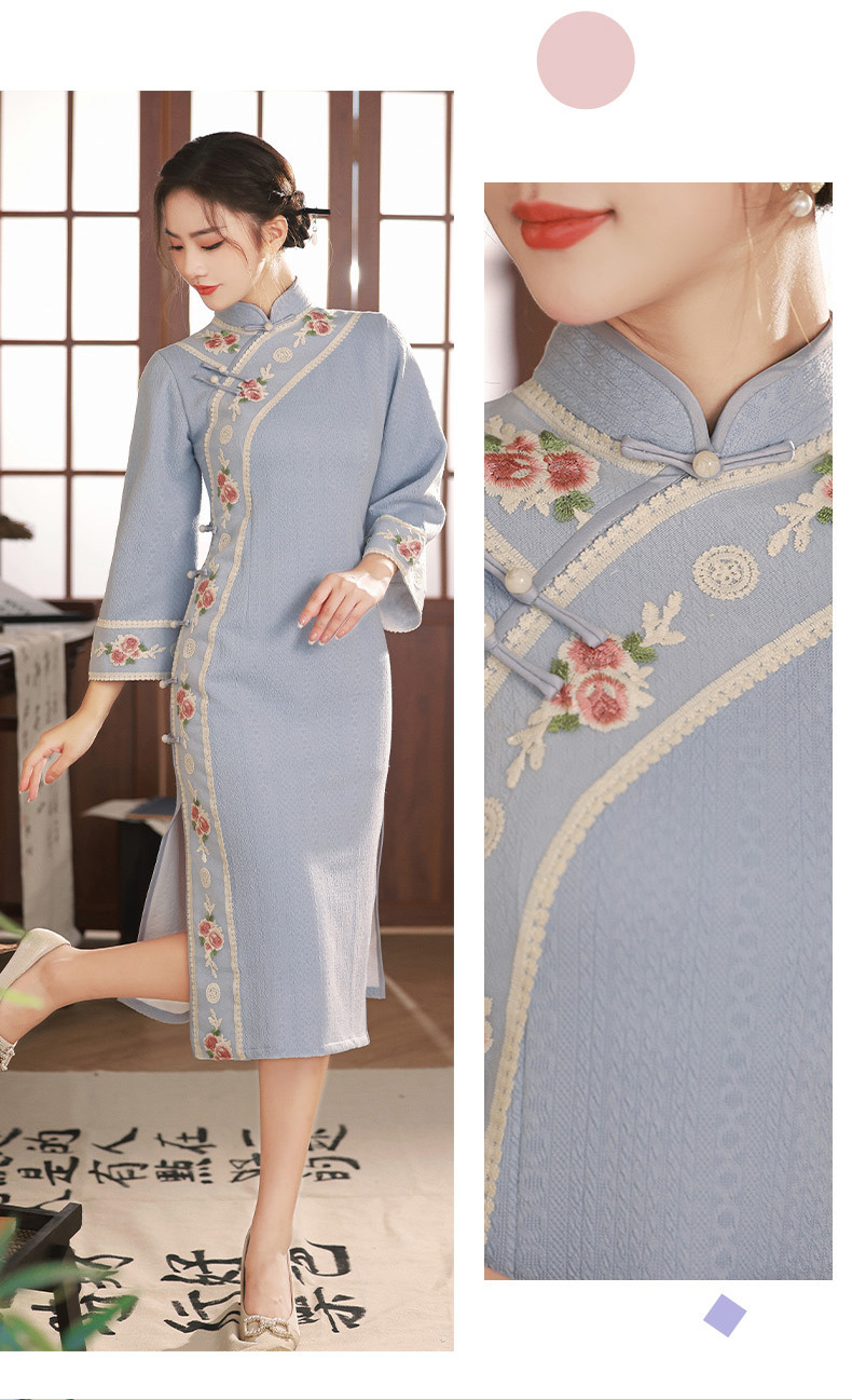 TX秋冬中长复合针织刺绣蕾丝花边日常显瘦旗袍连衣裙