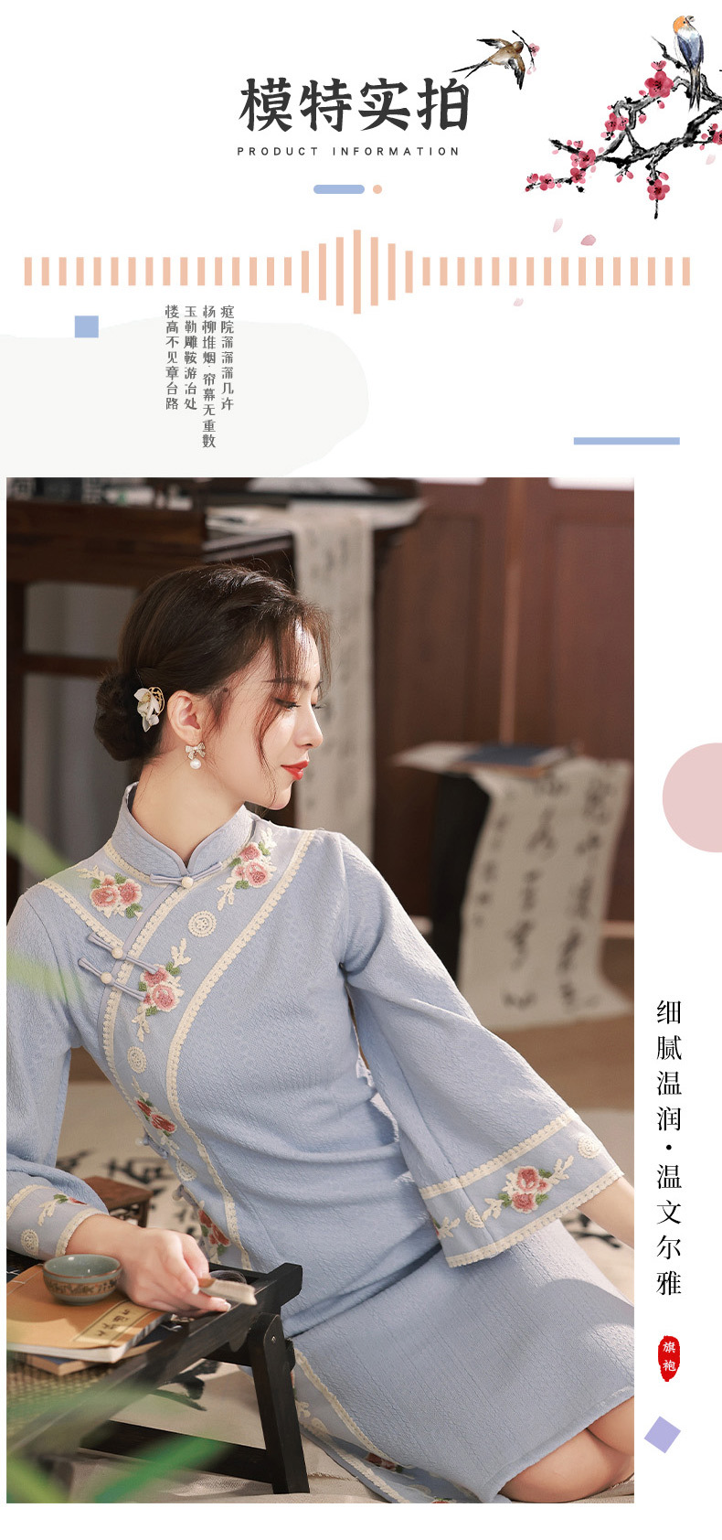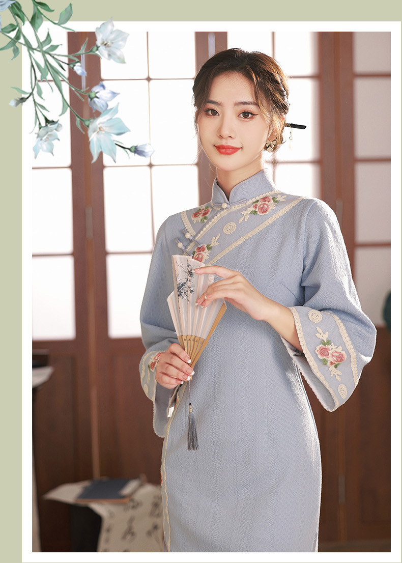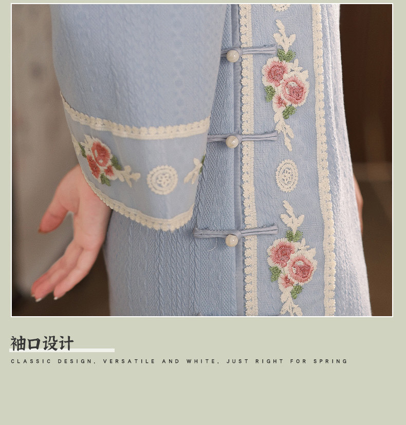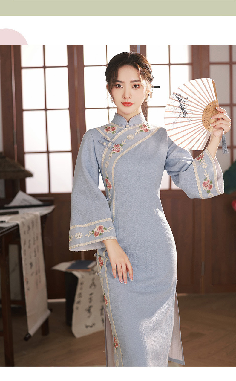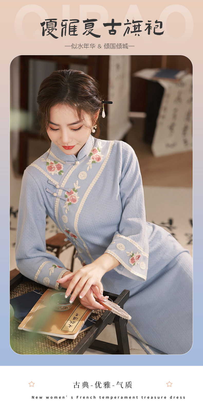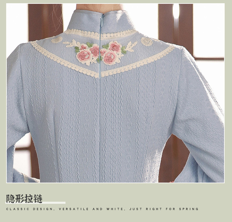 TX秋冬中长复合针织刺绣蕾丝花边日常显瘦旗袍连衣裙