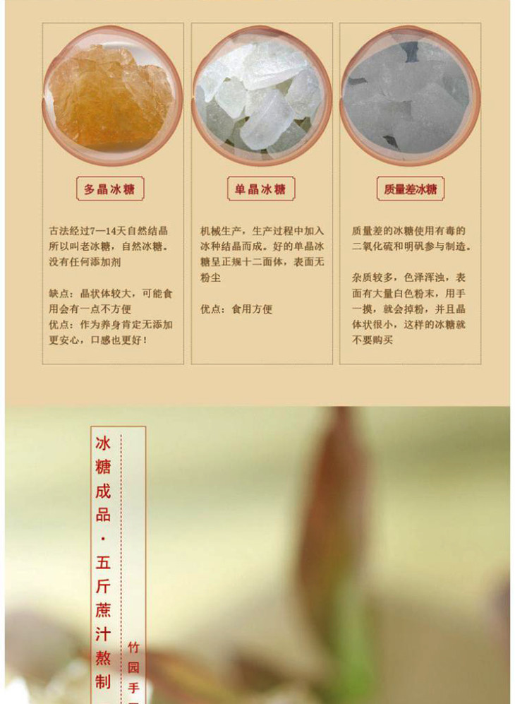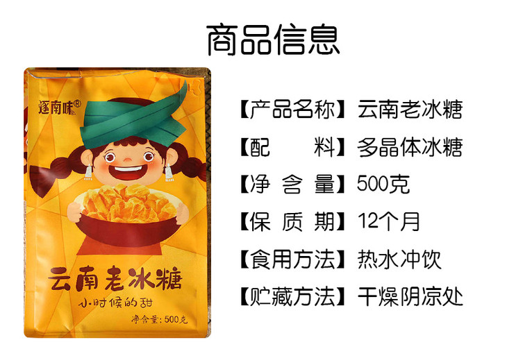 小贴士:由于老冰糖结晶块较大,为方便取用,咱们老冰糖均为人工敲碎发货。晶体一旦碎解后,快递过程中的颠簸可能会出现碎糖粉末,这并不影响食用,也并非以次充好,介意的亲请慎拍哦~