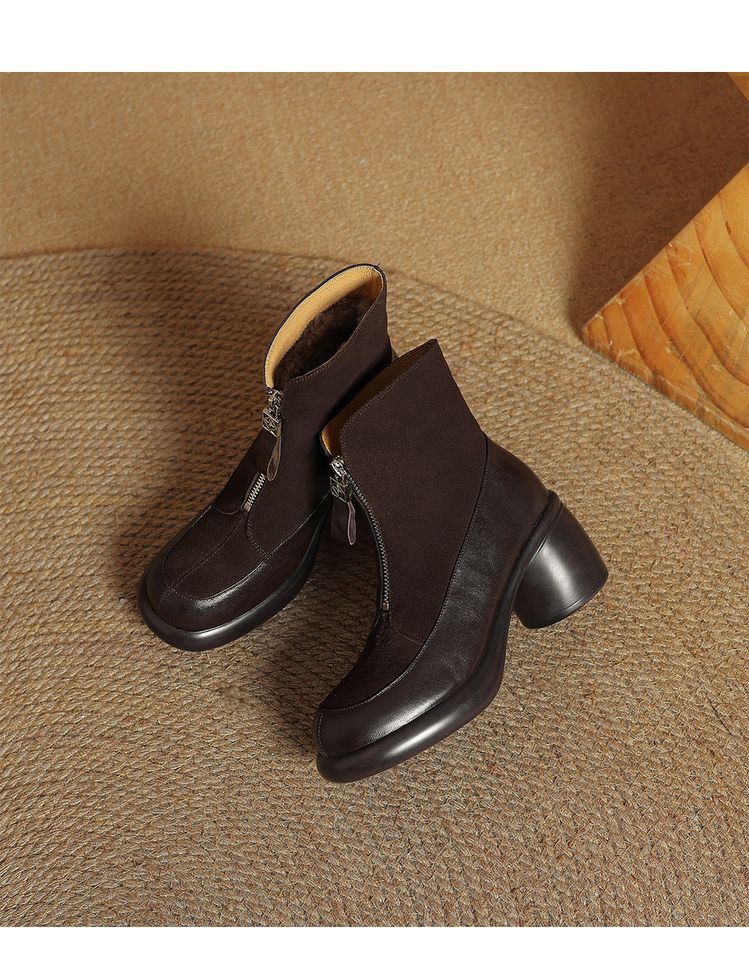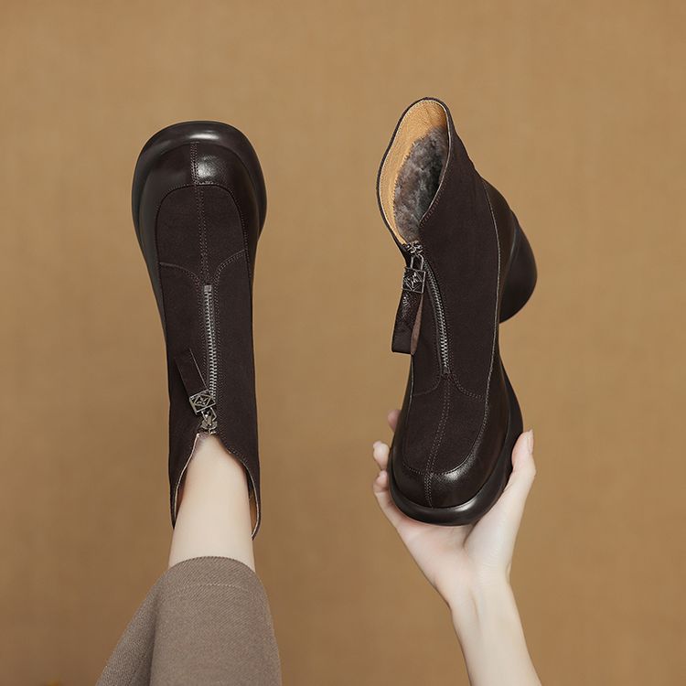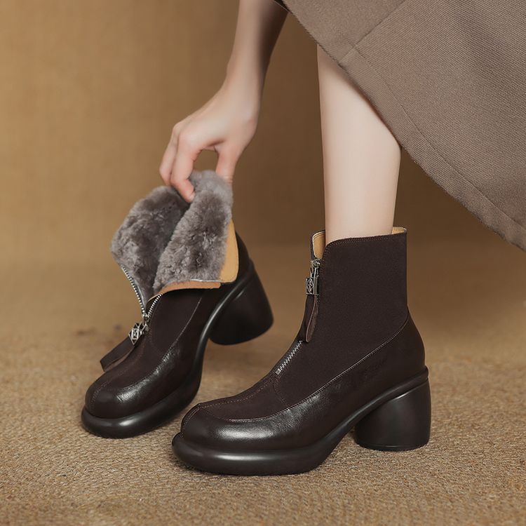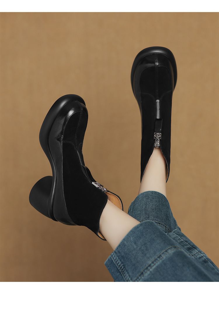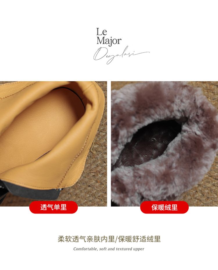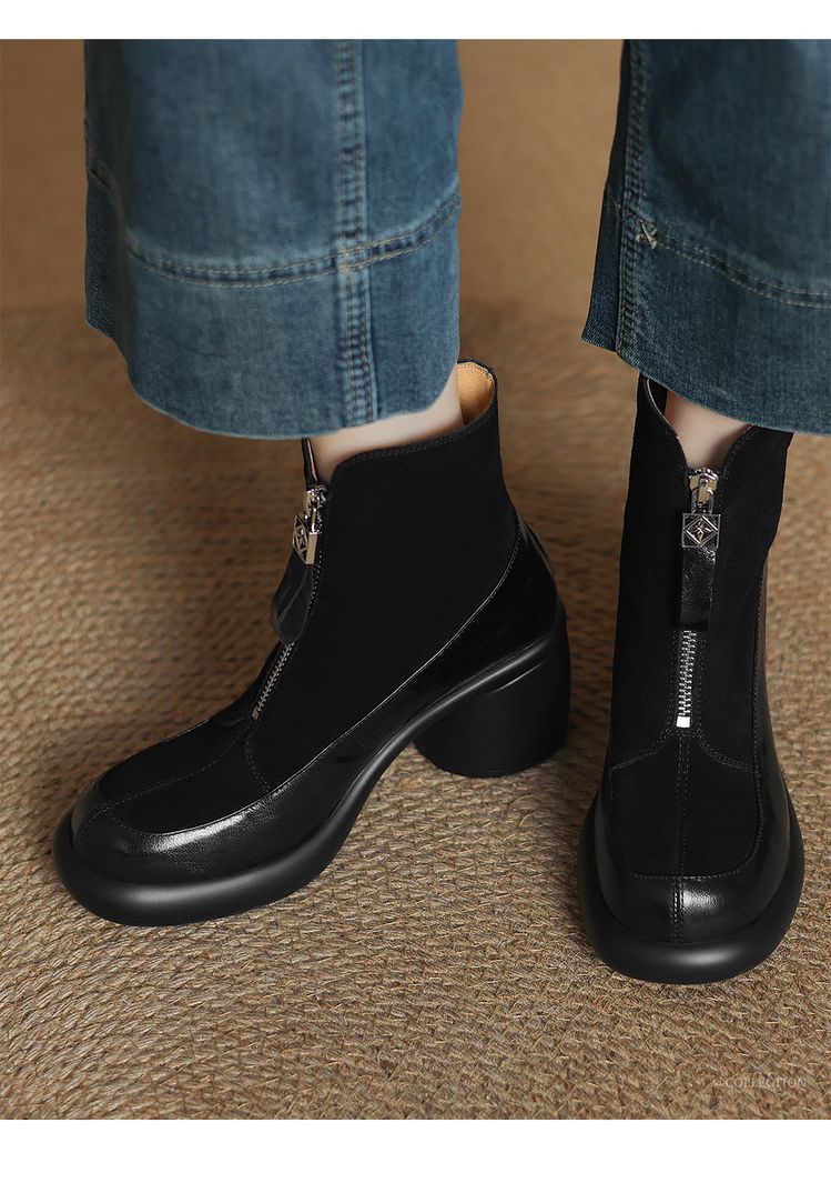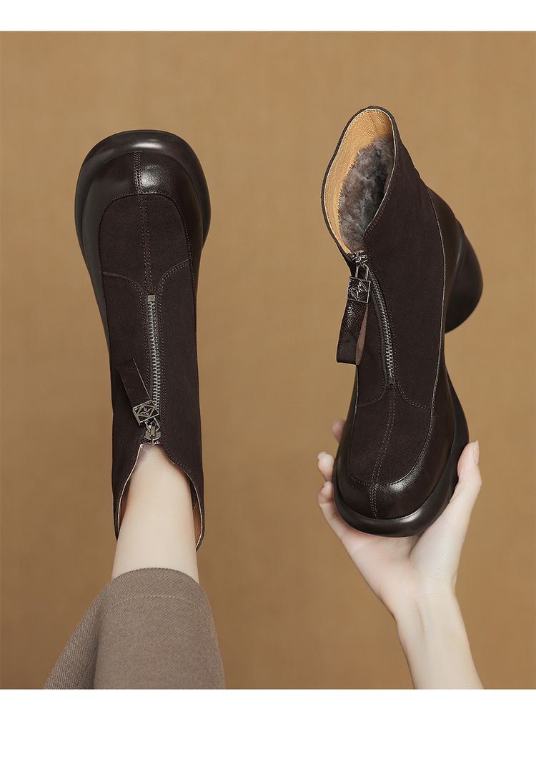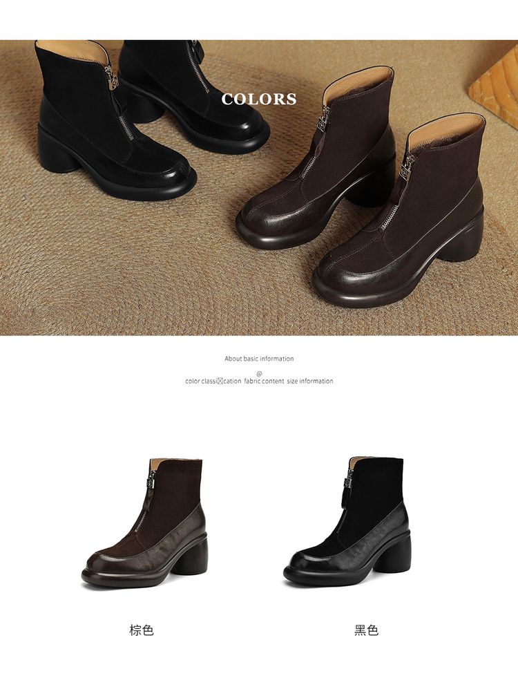 【预售5天】超轻超软加厚毛毛雪地靴秋冬季厚底牛翻皮绒面拼接粗高跟前拉链保暖短靴女ZYY&A1056-1