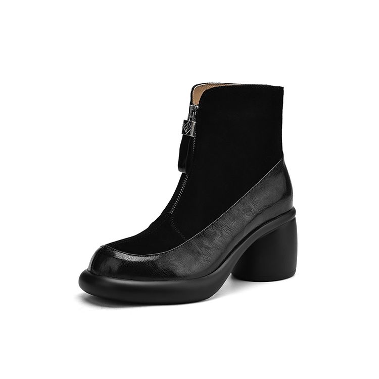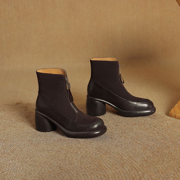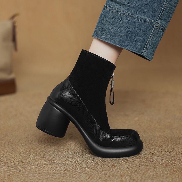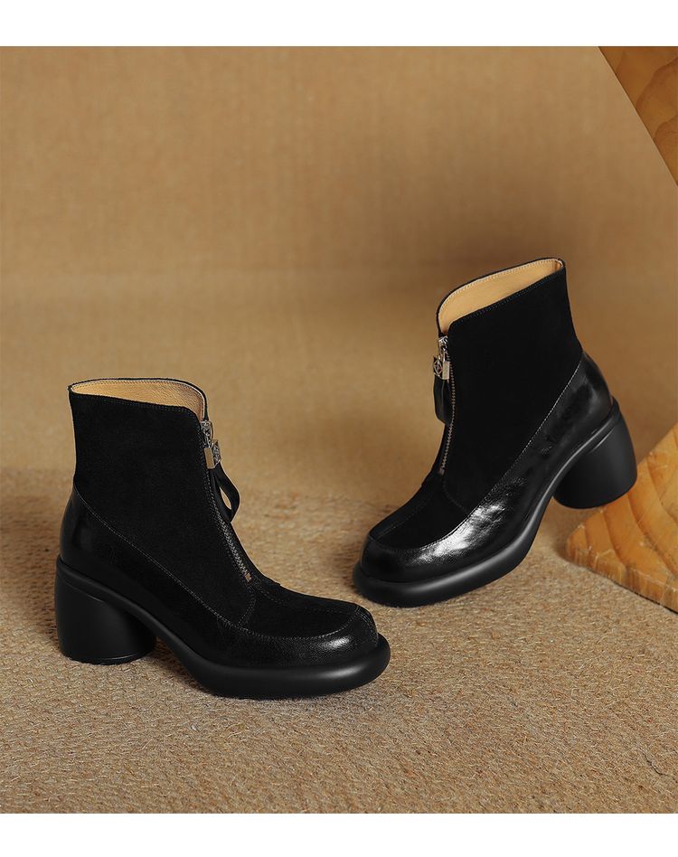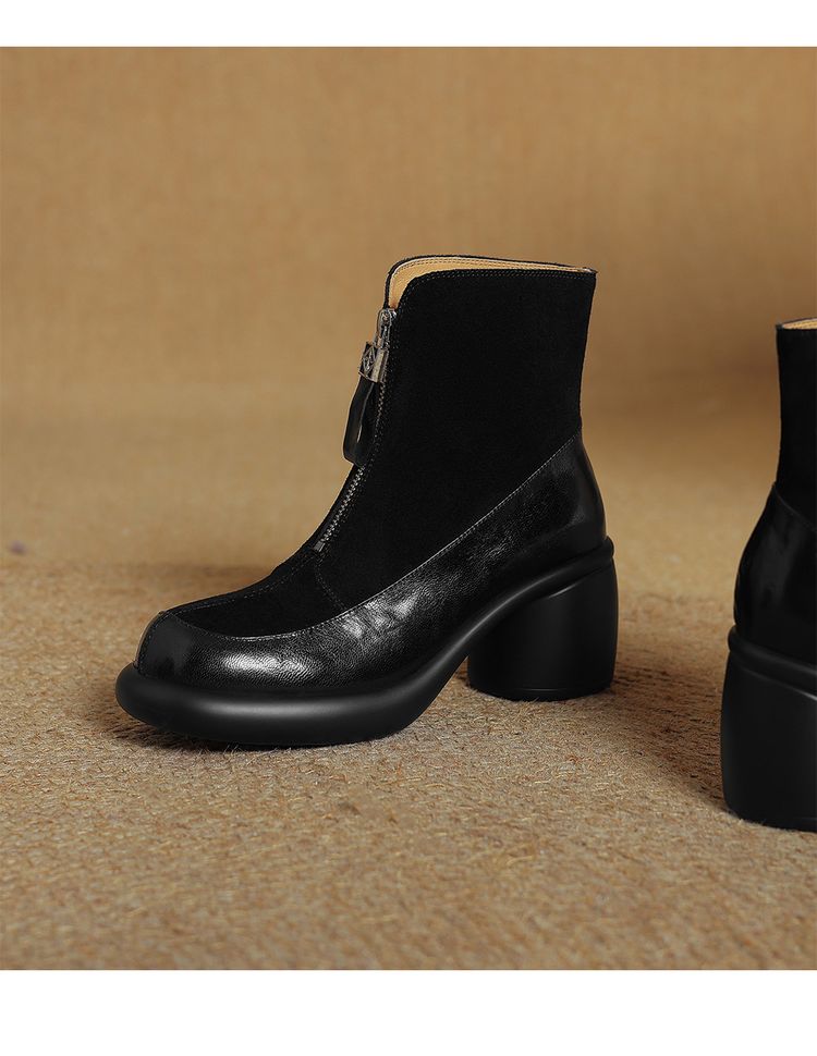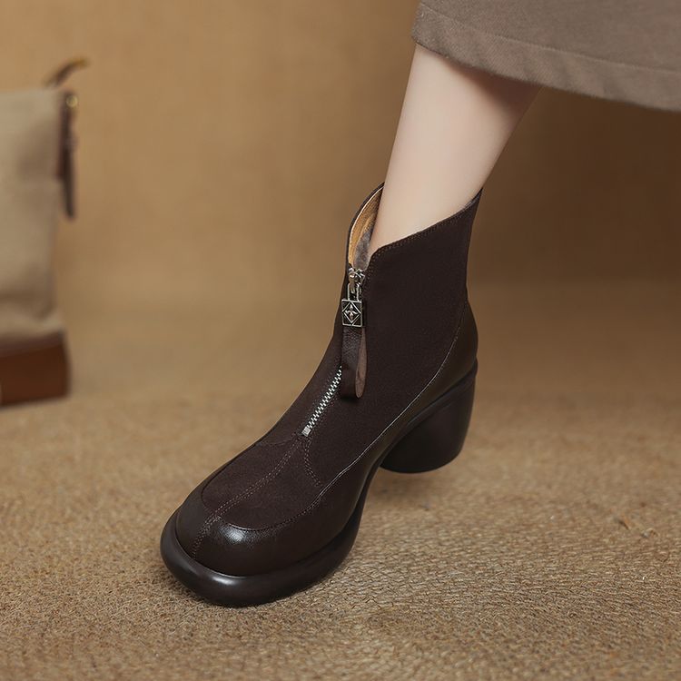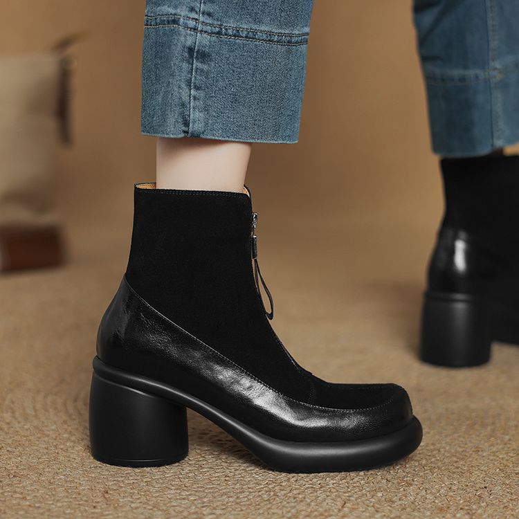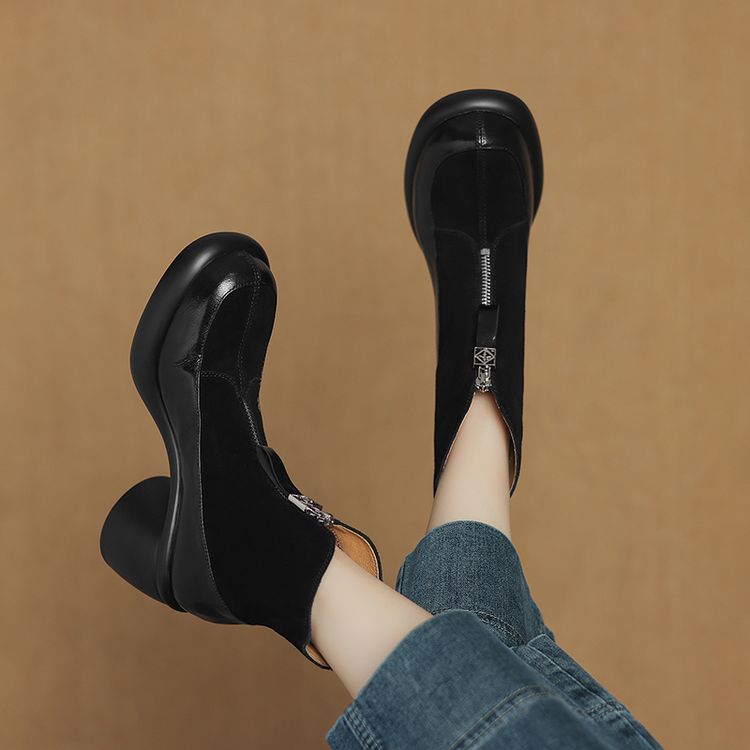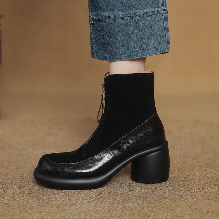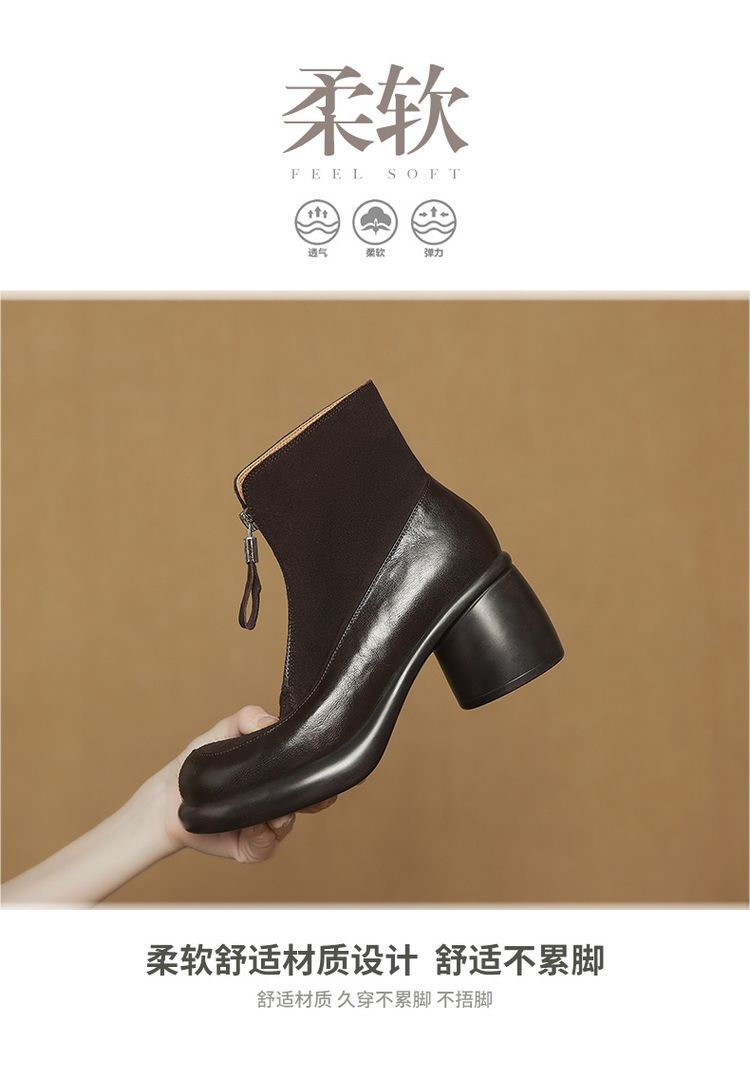 【预售5天】超轻超软加厚毛毛雪地靴秋冬季厚底牛翻皮绒面拼接粗高跟前拉链保暖短靴女ZYY&A1056-1