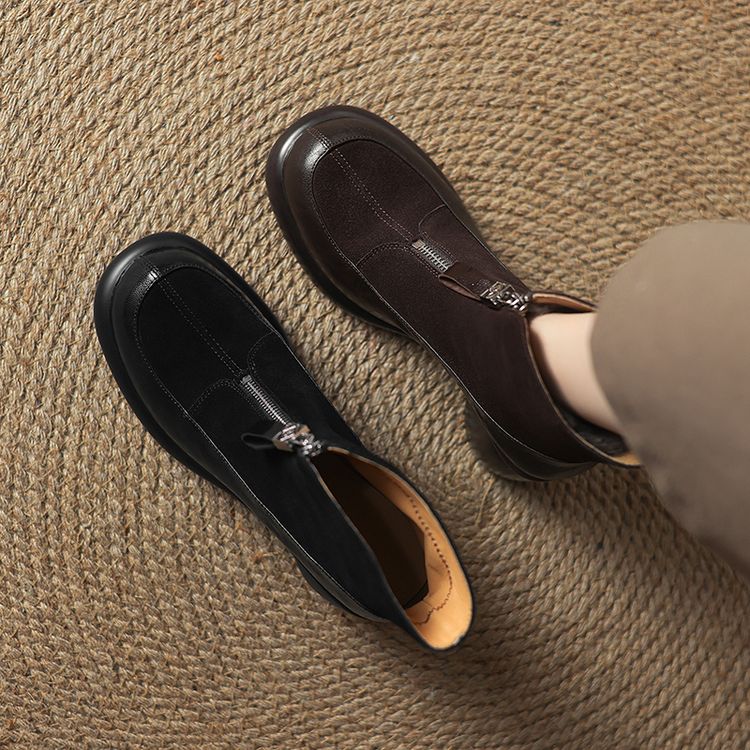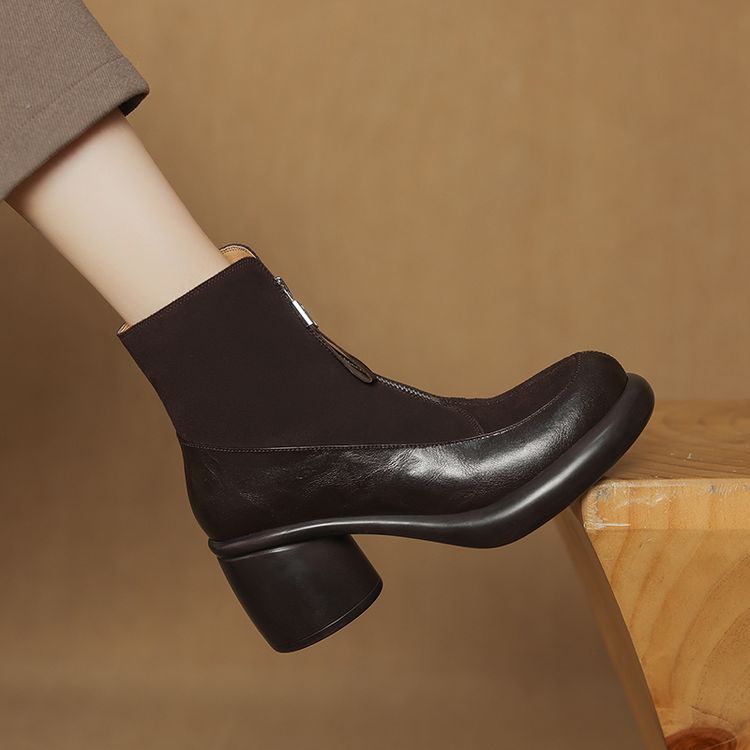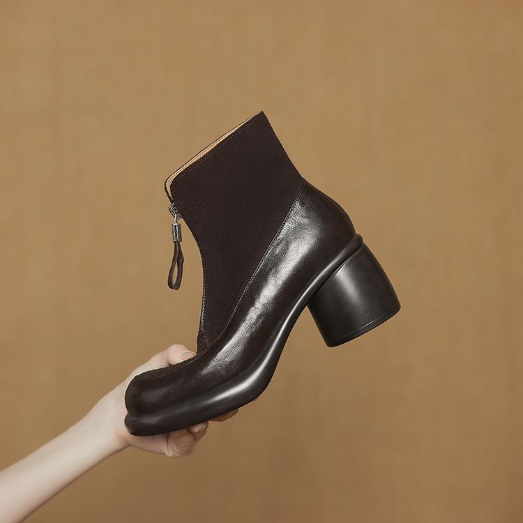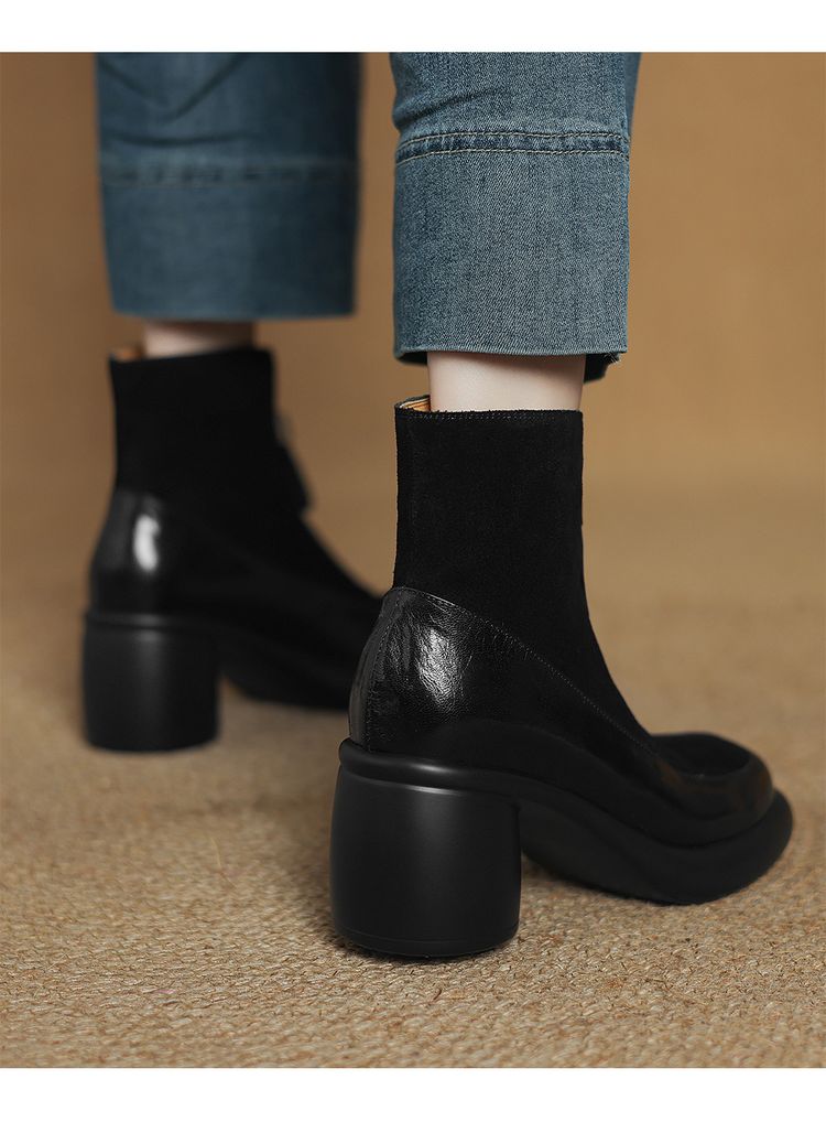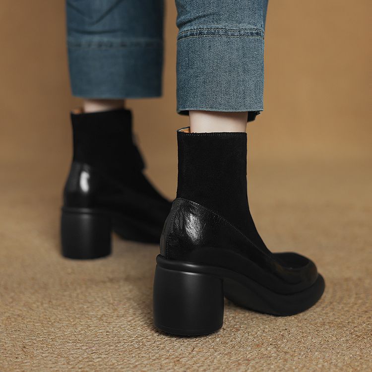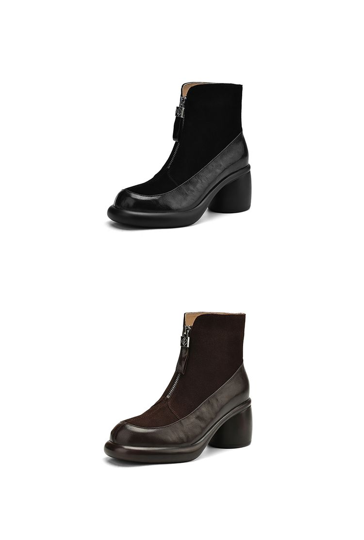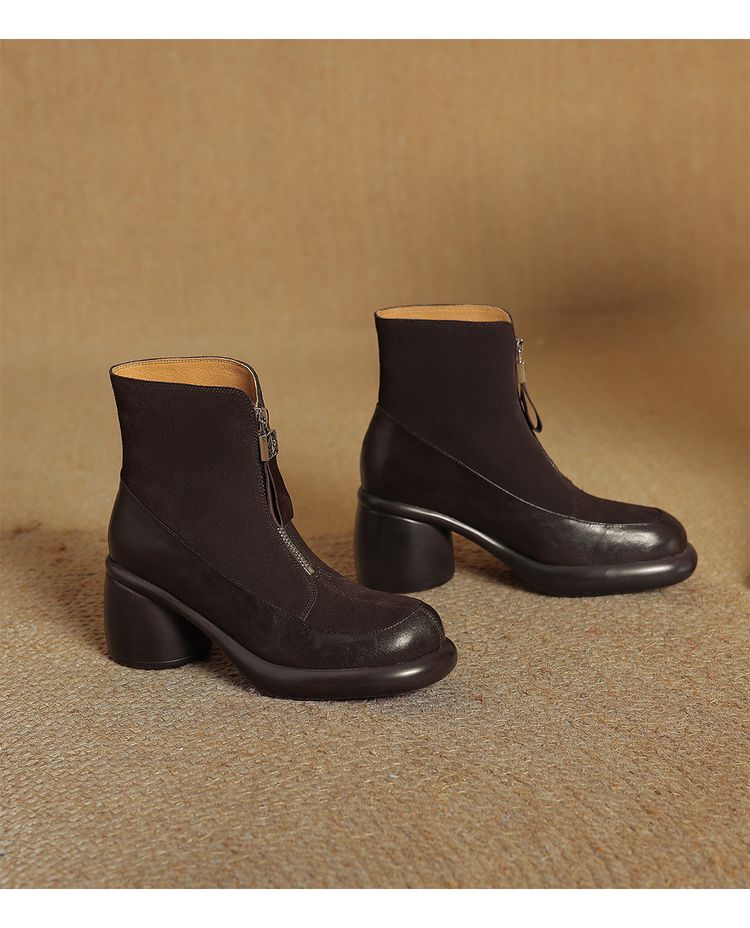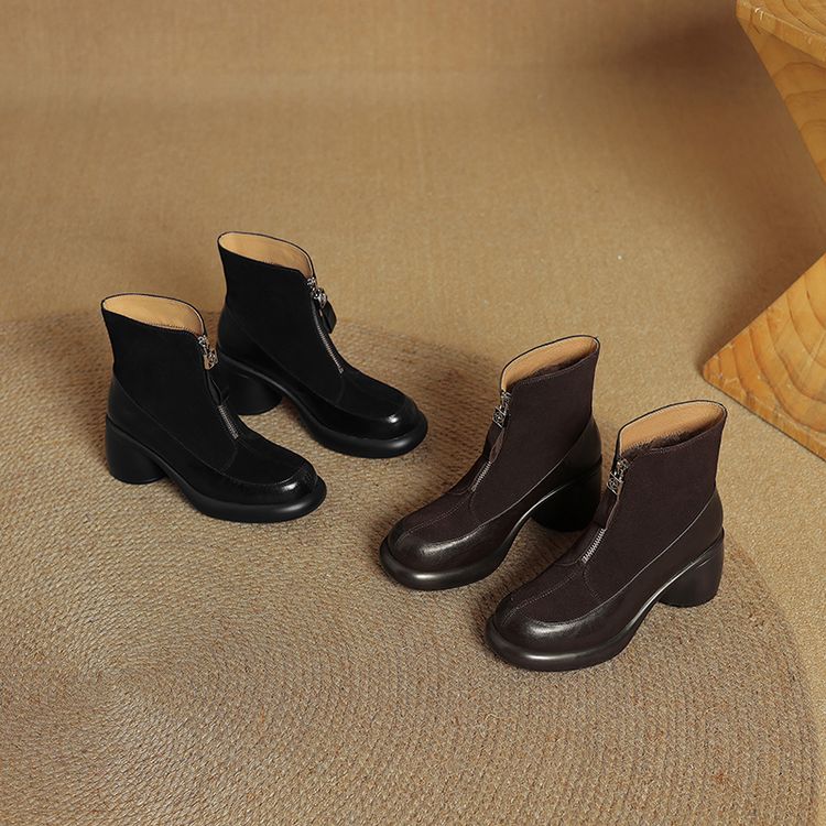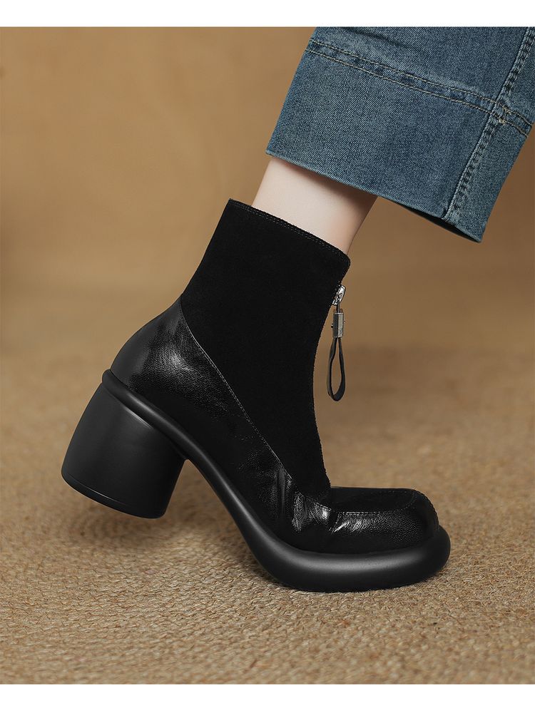 【预售5天】超轻超软加厚毛毛雪地靴秋冬季厚底牛翻皮绒面拼接粗高跟前拉链保暖短靴女ZYY&A1056-1