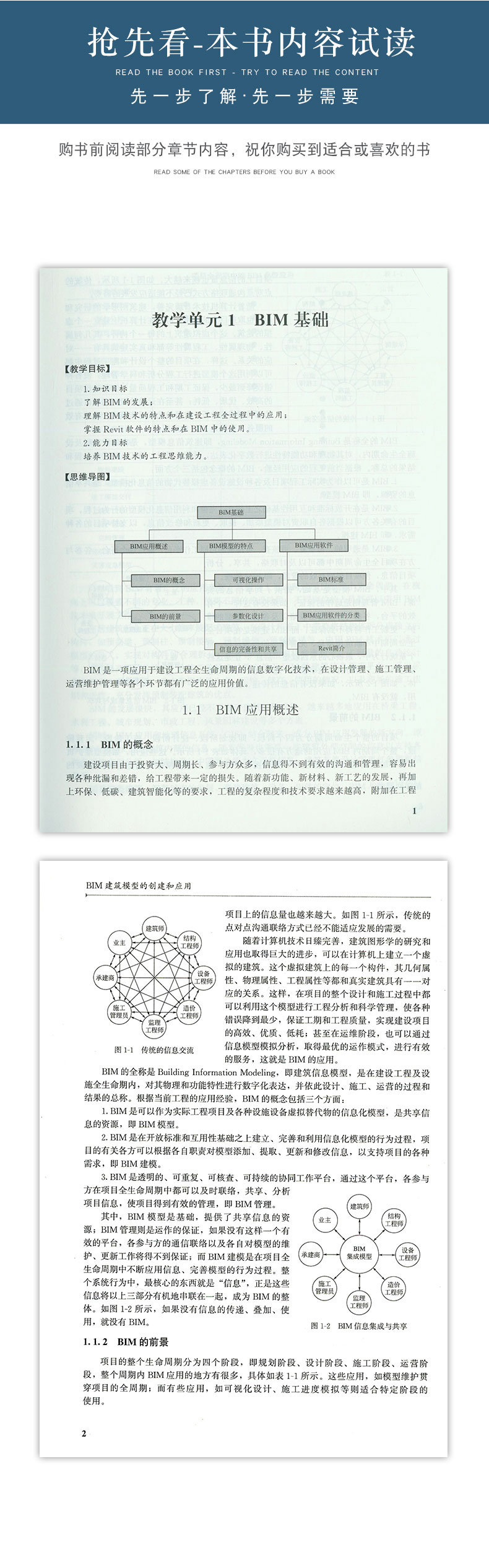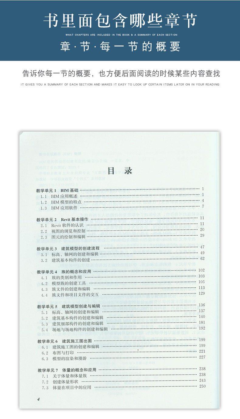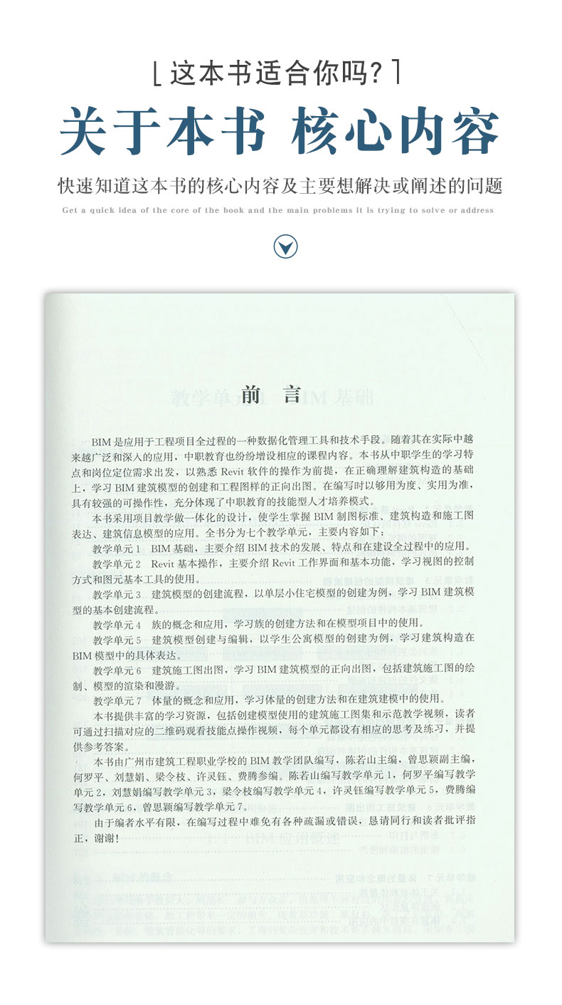 本书采用项目教学做一体化的设计,使学生掌握BIM制图标准、建筑构造和施工图表达、建筑信息模型的应用。 全书分为七个教学单元,主要内容包括:BIM基础,主要介绍BIM技术的发展、特点和在建设全过程中的应用; Revit基本操作,主要介绍Revit工作界面和基本功能,学习视图的控制方式和图元基本工具的使用;建筑模型的创建流程,以单层小住宅模型的创建为例,学习BIM建筑模型的基本创建流程;族的概念和应用,学习族的创建方法和在模型项目中的使用;建筑模型创建与编辑,以学生公寓模型的创建为例,学习建筑构造在BIM模型中的具体表达;建筑施工图出图,学习BIM建筑模型的正向出图,包括建筑施工图的绘制、模型的渲染和漫游;体量的概念和应用,学习体量的创建方法和在建筑建模中的使用。