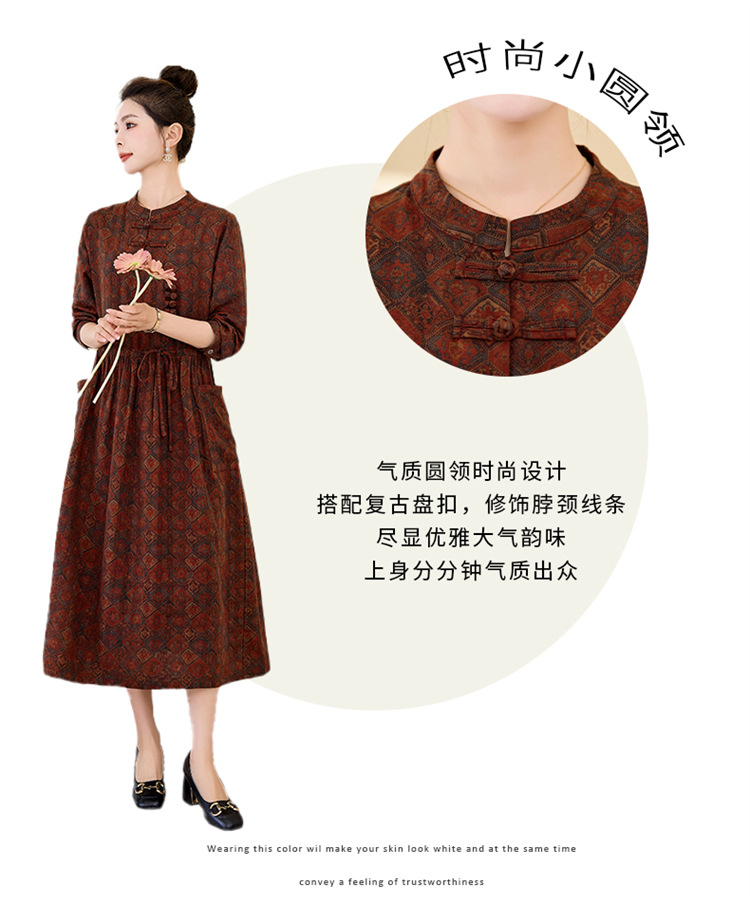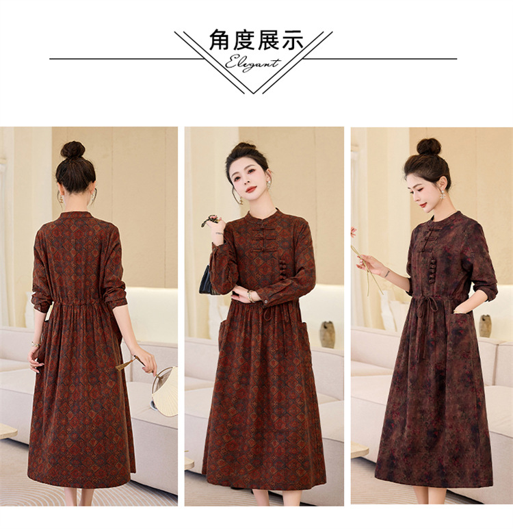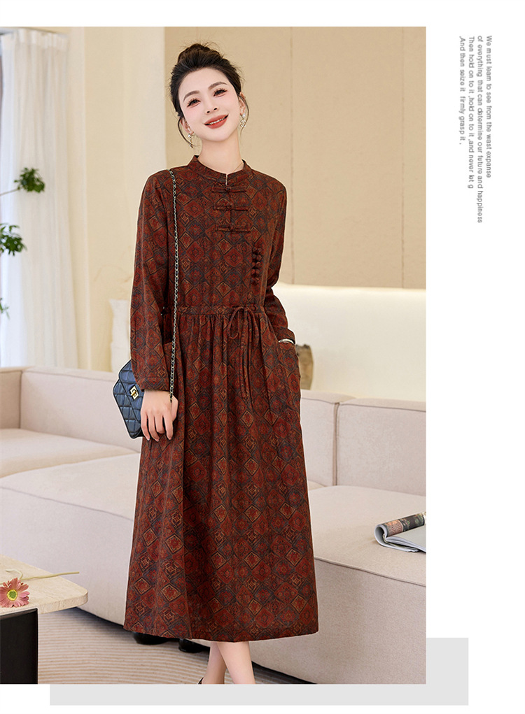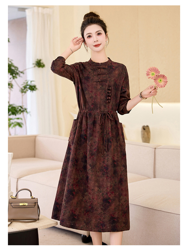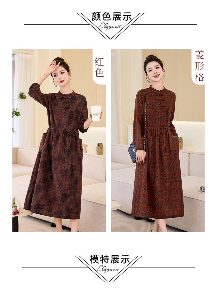 韩国绒印花长款修身长袖旗袍,复古中国风中老年女士旗袍SYK179402