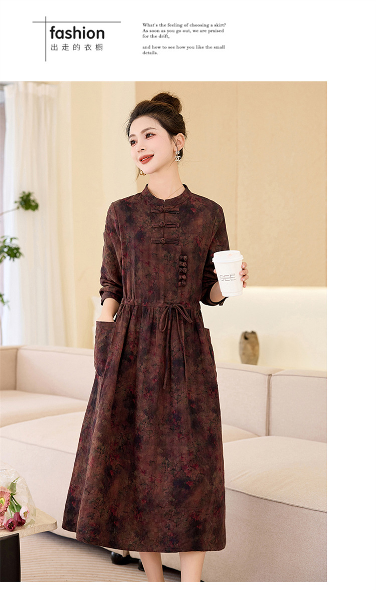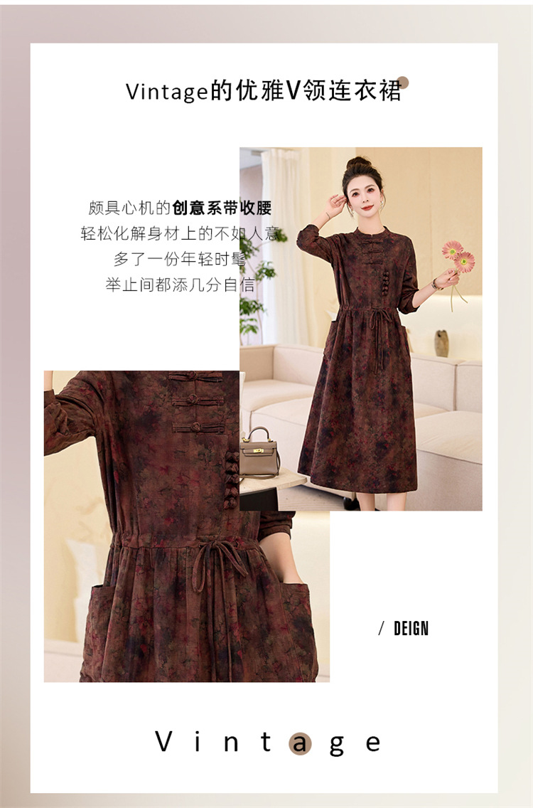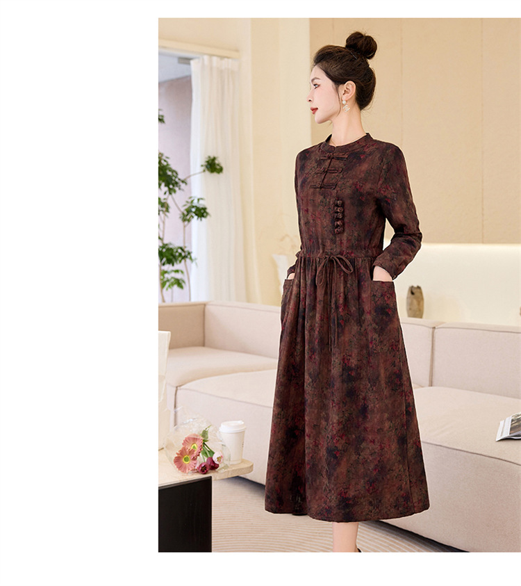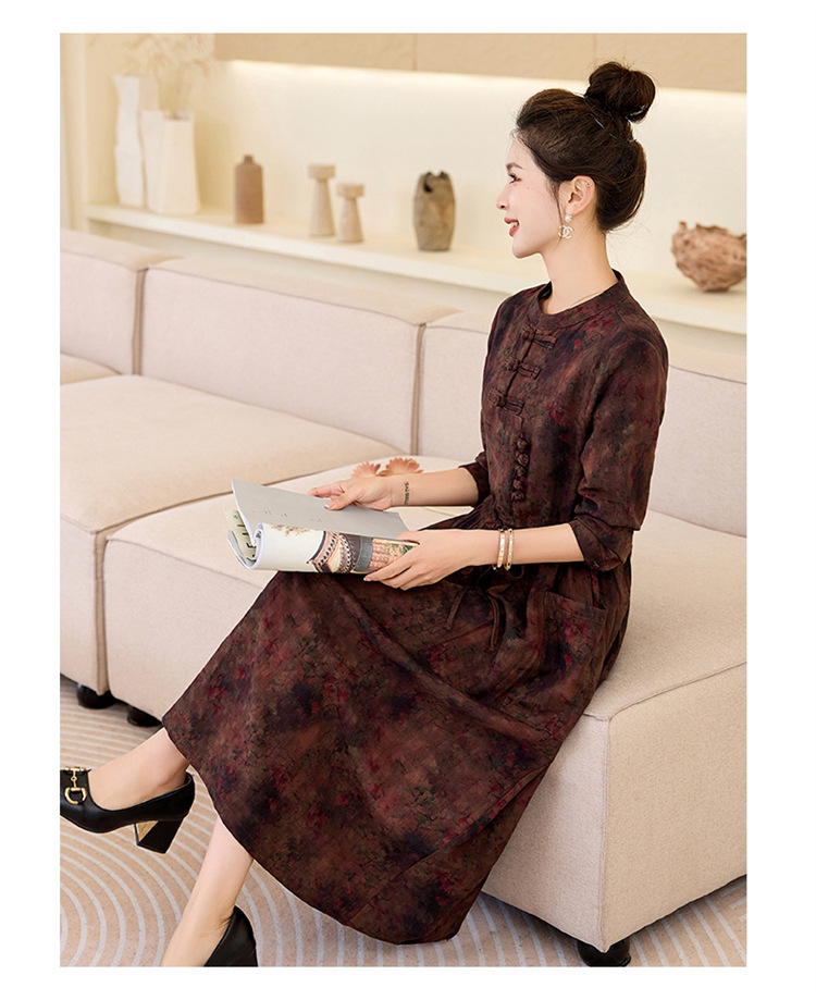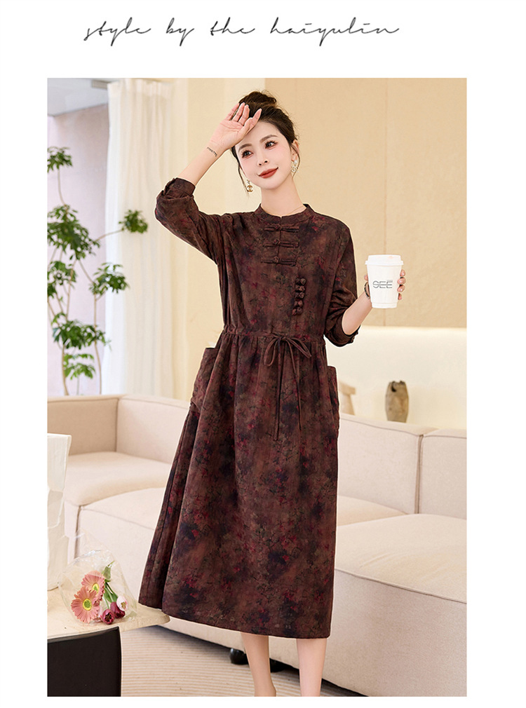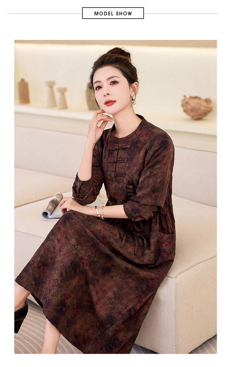 新中式复古盘扣碎花连衣裙,抽绳收腰气质棉麻长裙子HR-NYMYZ3307