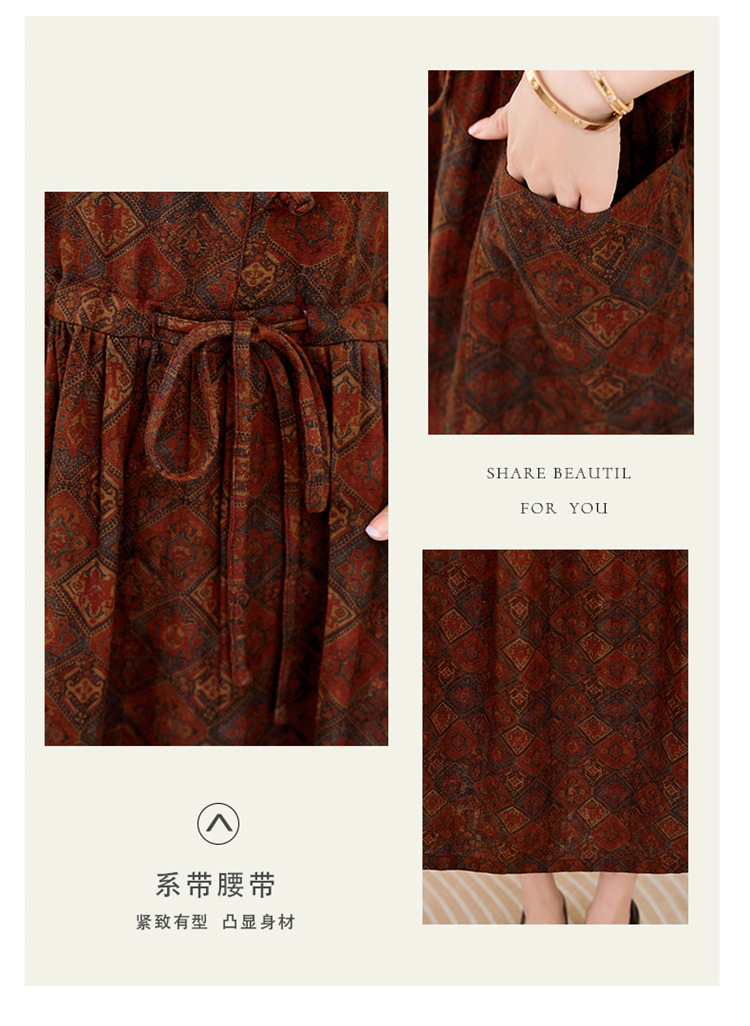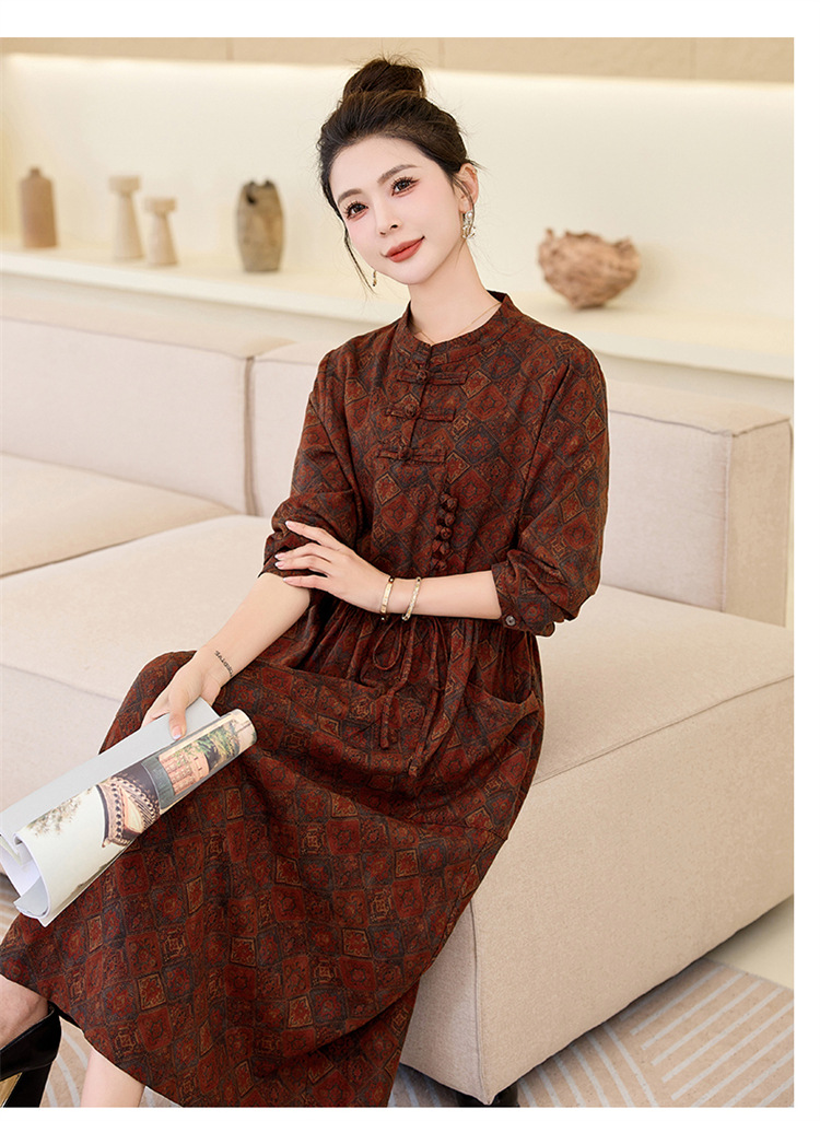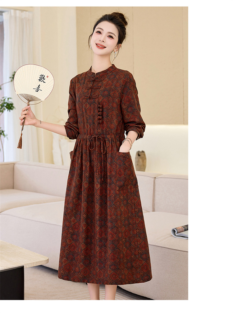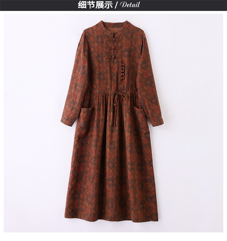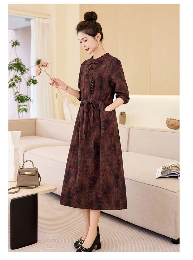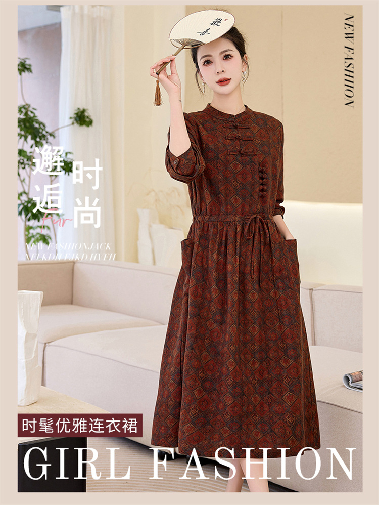 新中式复古盘扣碎花连衣裙,抽绳收腰气质棉麻长裙子HR-NYMYZ3307