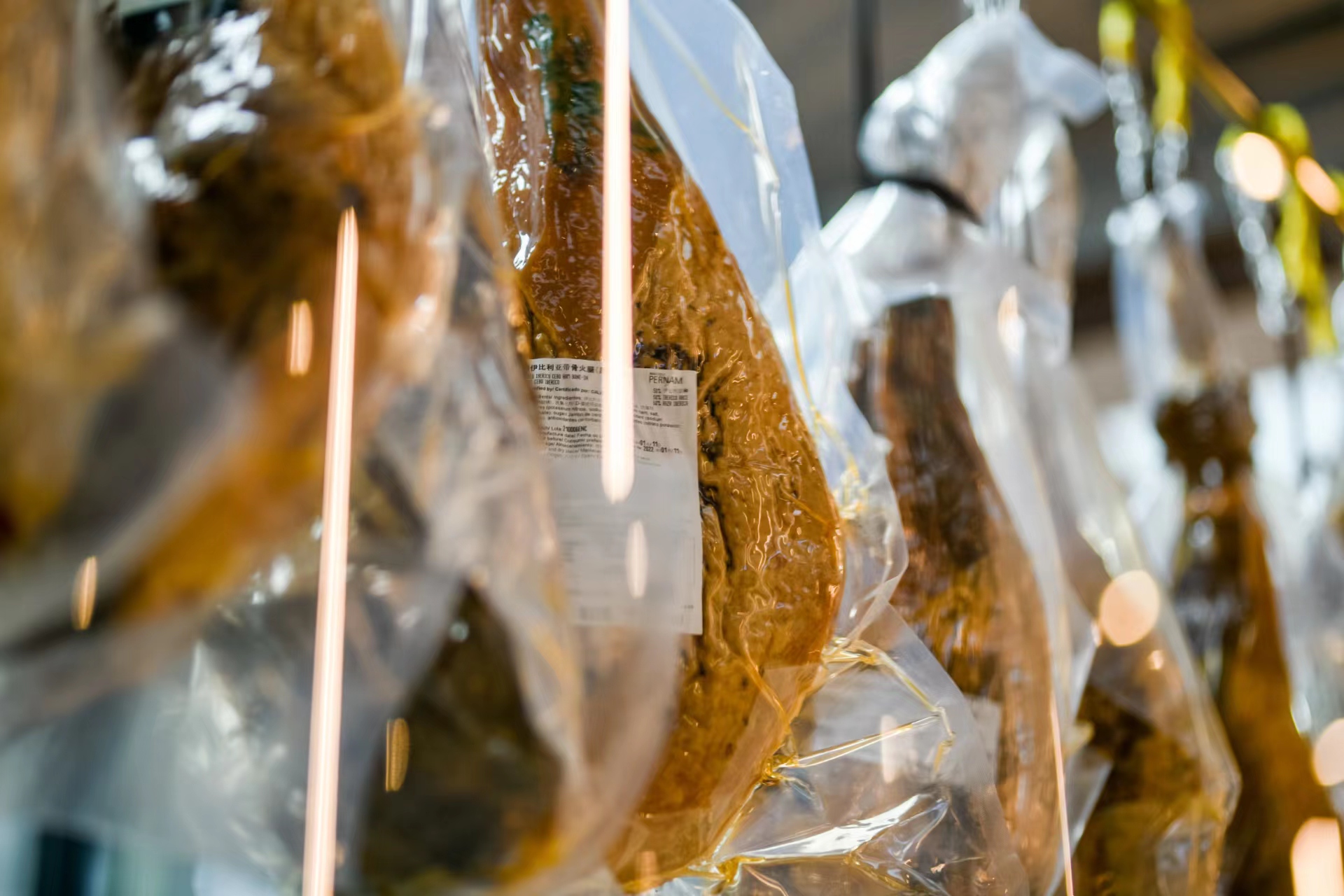 一排排的火腿与一整面墙的美酒佳酿带来的视觉震撼