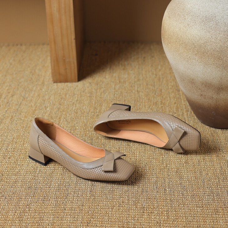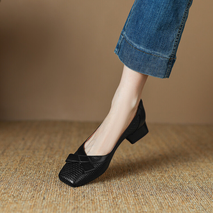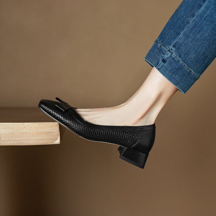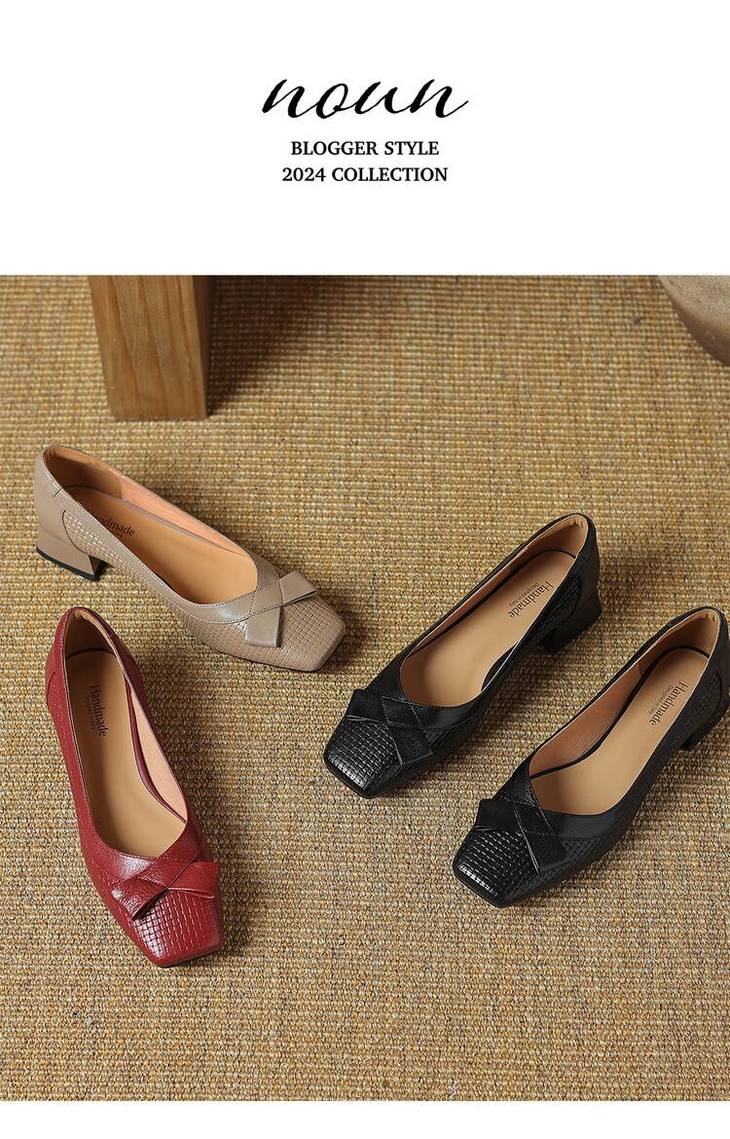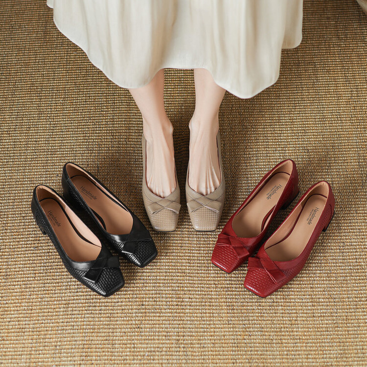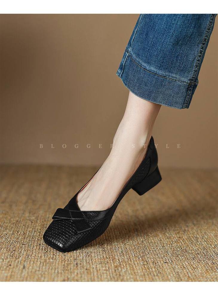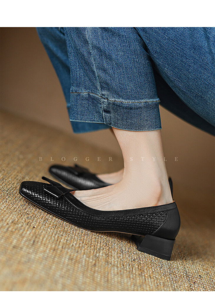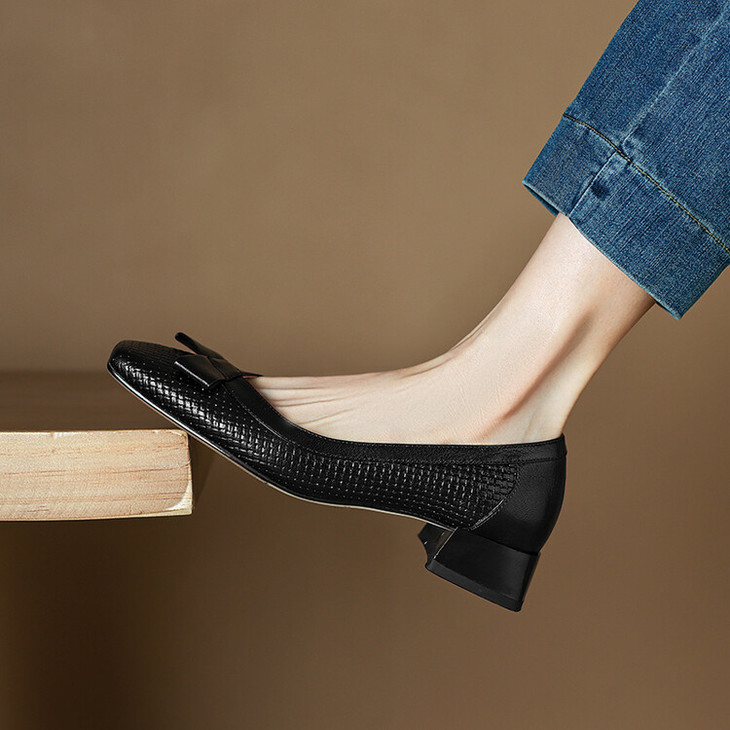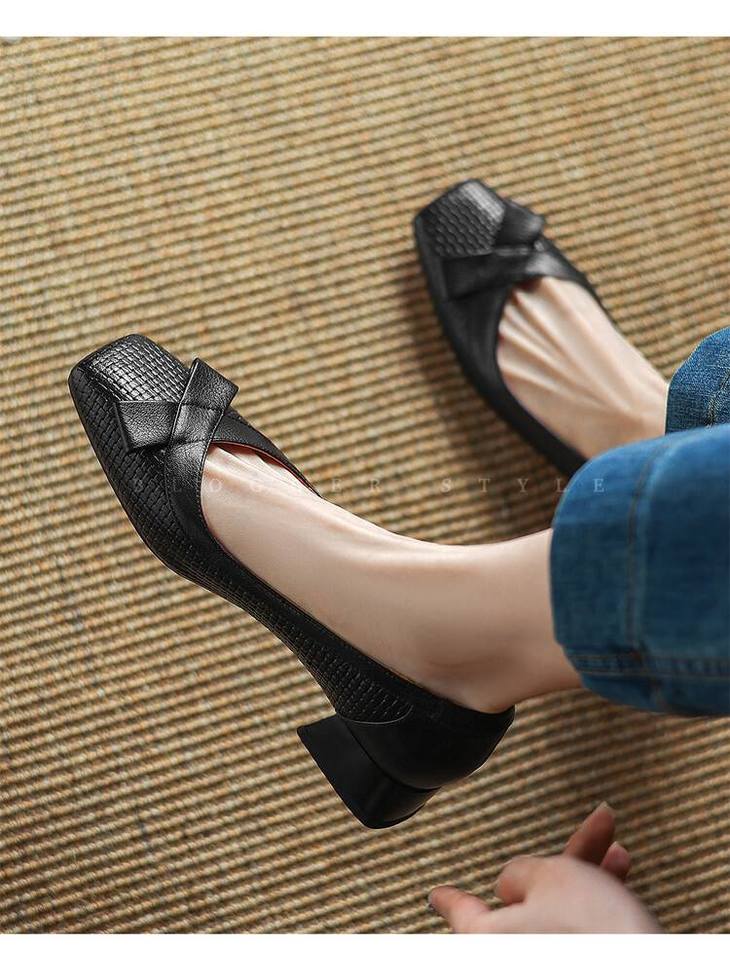 【预售5天】蝴蝶结方头粗跟高跟鞋,新款浅口中跟黑色单鞋LD&6850