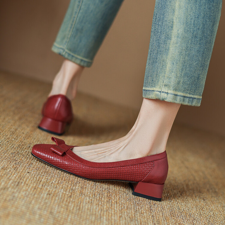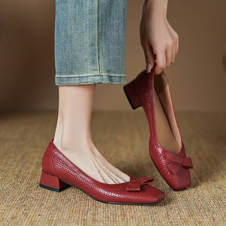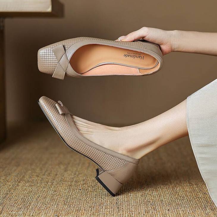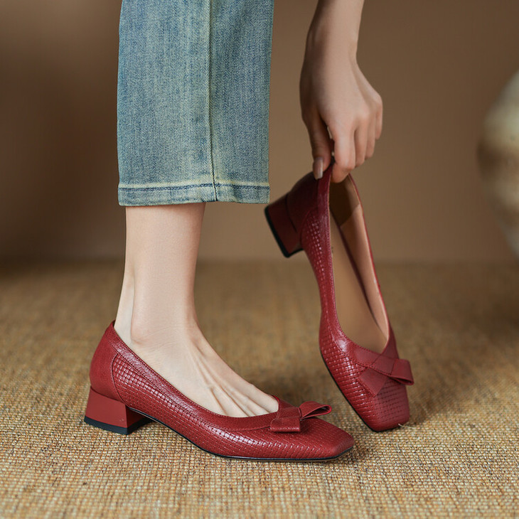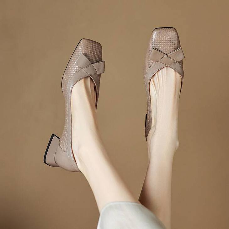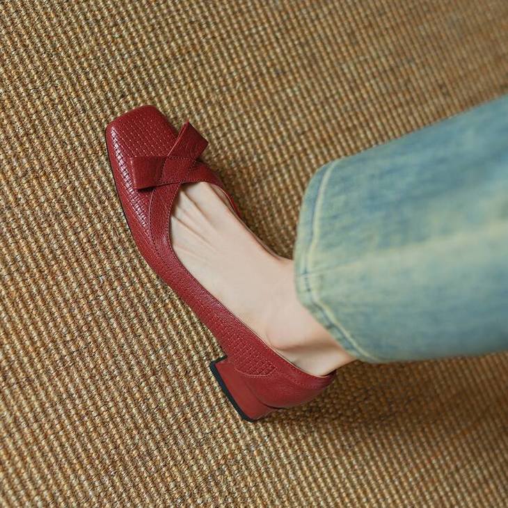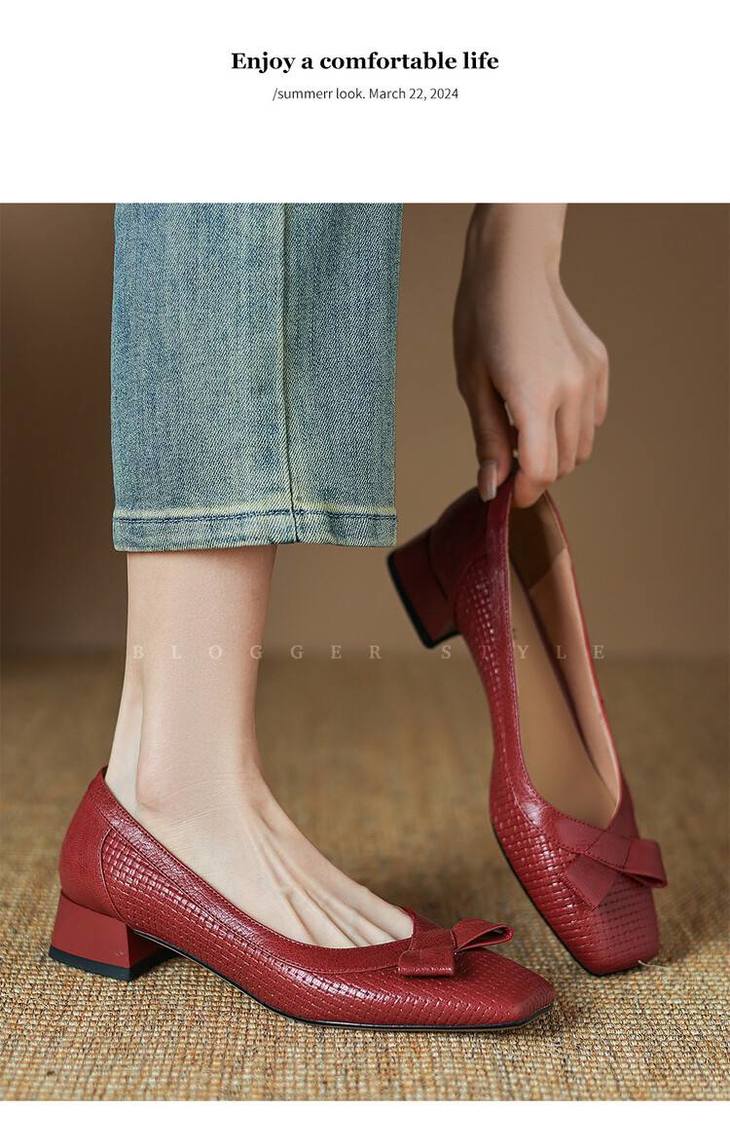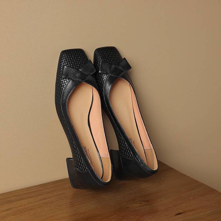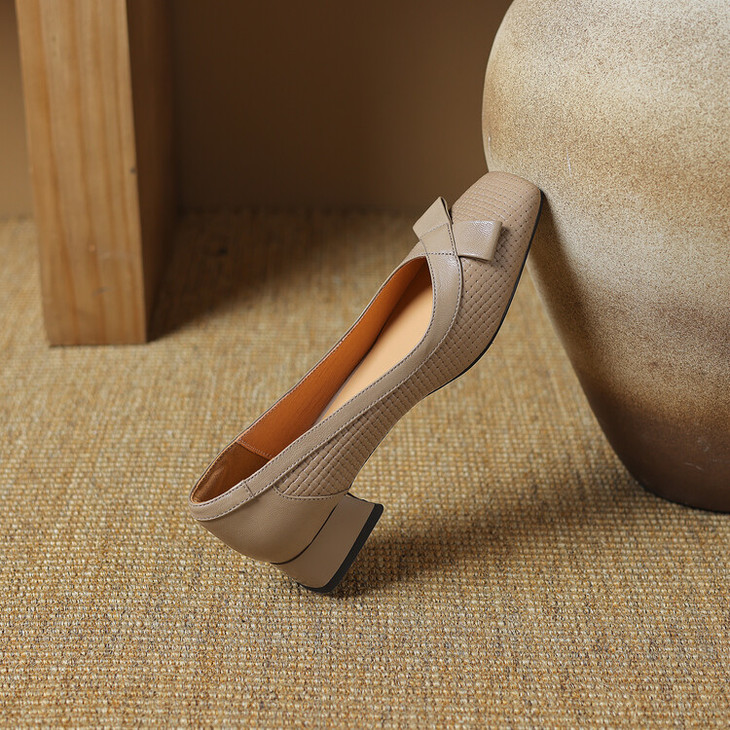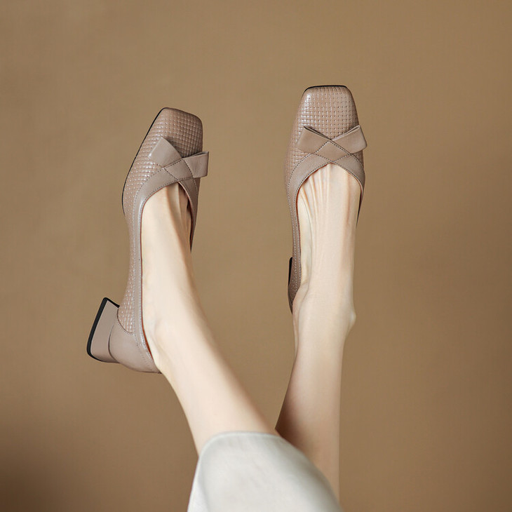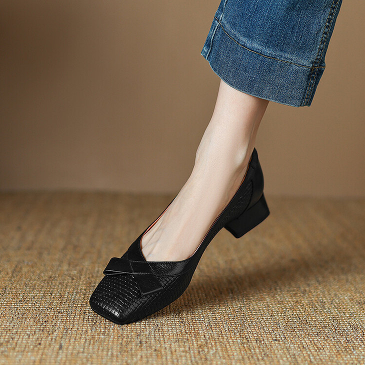 【预售5天】蝴蝶结方头粗跟高跟鞋,新款浅口中跟黑色单鞋LD&6850