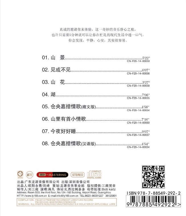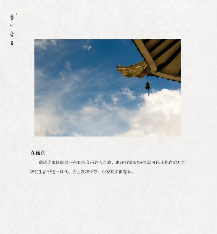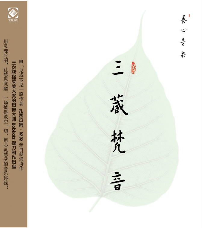 用音乐滋养心灵,一张梵音养心音乐唱片,不仅要有氛围,音乐性也是不可或缺的部分,用音乐超越声音的好坏,超越耳朵的感受,透过乐音去感知内心,是这张专辑的意义所在。没有过于复杂的编配与花哨的唱腔,每一个音符,每一个律动都可以带来刹那间舒适放松的幸福感受。