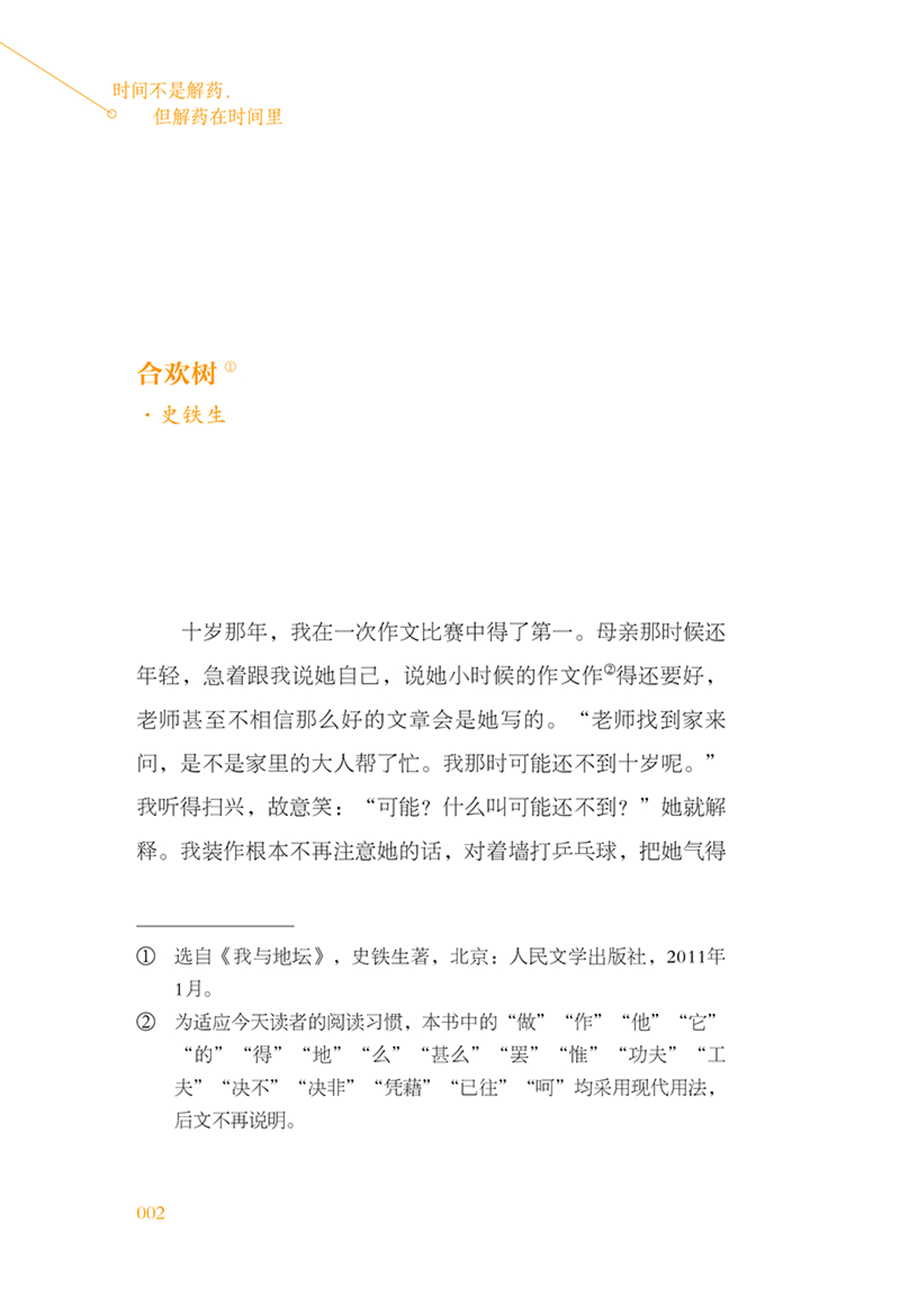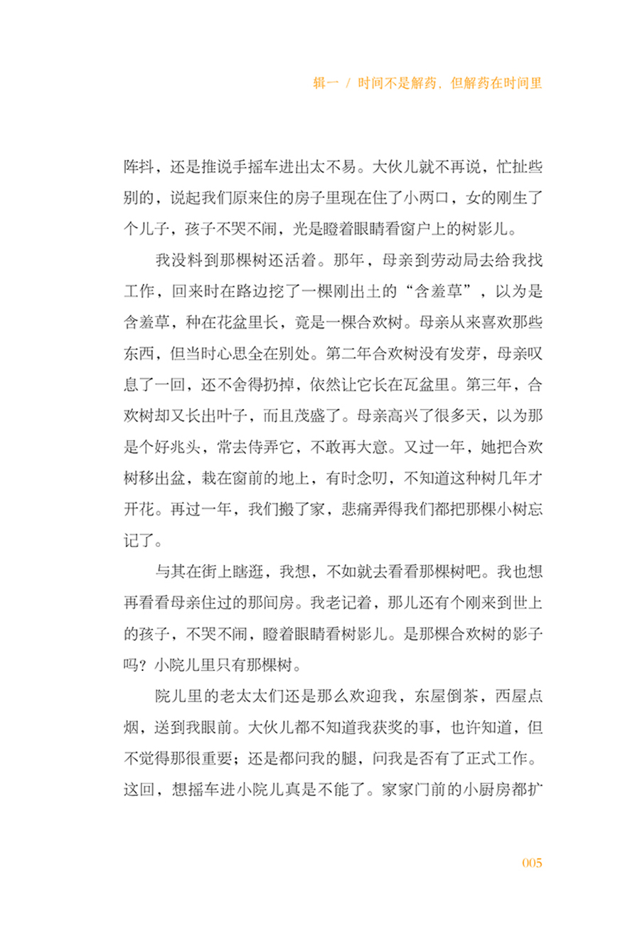 4.本书将大主题“治愈”细分为六个小主题,每个小主题对应一个方面:对父母的眷恋(如《合欢树》《老海棠树》《秋天的怀念》《祖父死了的时候》)、对师友的怀念(《忆沈从文》《老舍先生》《宗月大师》《悼志摩》)、对妻子的挚爱(《给亡妇》《我爱过一个正当最好年龄的你》《醒来觉得甚是爱你》)、对子女的怜爱(《有了小孩以后》《儿女》《给我的孩子们》)、对生活的切身体会(《养花》《猫的故事》)、对人生的深刻感悟(《无事此静坐》《快乐》《匆匆》)。正是这些复杂的滋味,让我们的人生变得丰沛而饱满,深沉而宽广。