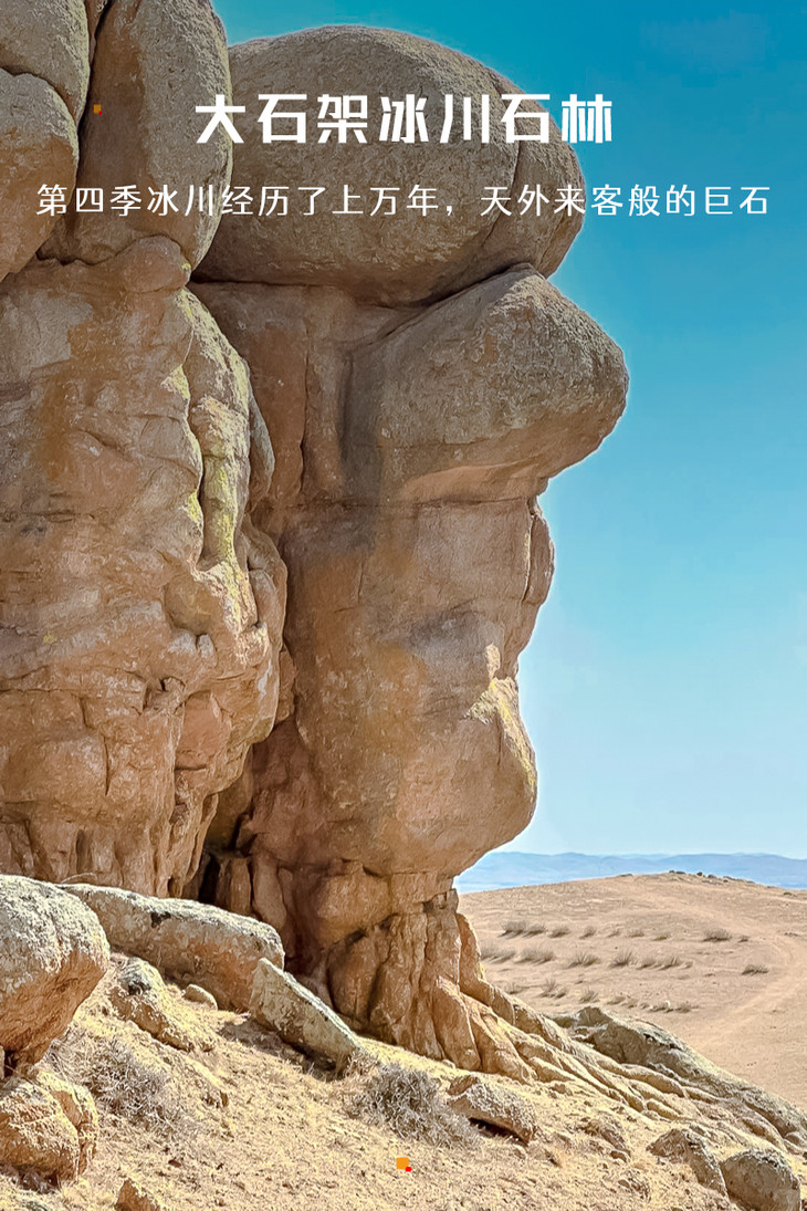 大石架冰川石林主要是冰盖和冰川的侵蚀,冰川融化时形成的大量冰川融水的侵蚀形成的。这里有壮丽的花岗岩峡谷、险峰和独特的高山草甸草原。每到夏天,谷底溪水潺潺,绿树成荫,山、水、树、草美不胜收。主峰西端的石架高达八九层。从西边看,这个石架就像一只即将展翅高飞的雄鹰。站在石台的底部,抬头望去,头顶悬着的巨石令人望而生畏,我害怕那些大石头会随着一声巨响而散落滚落下来。