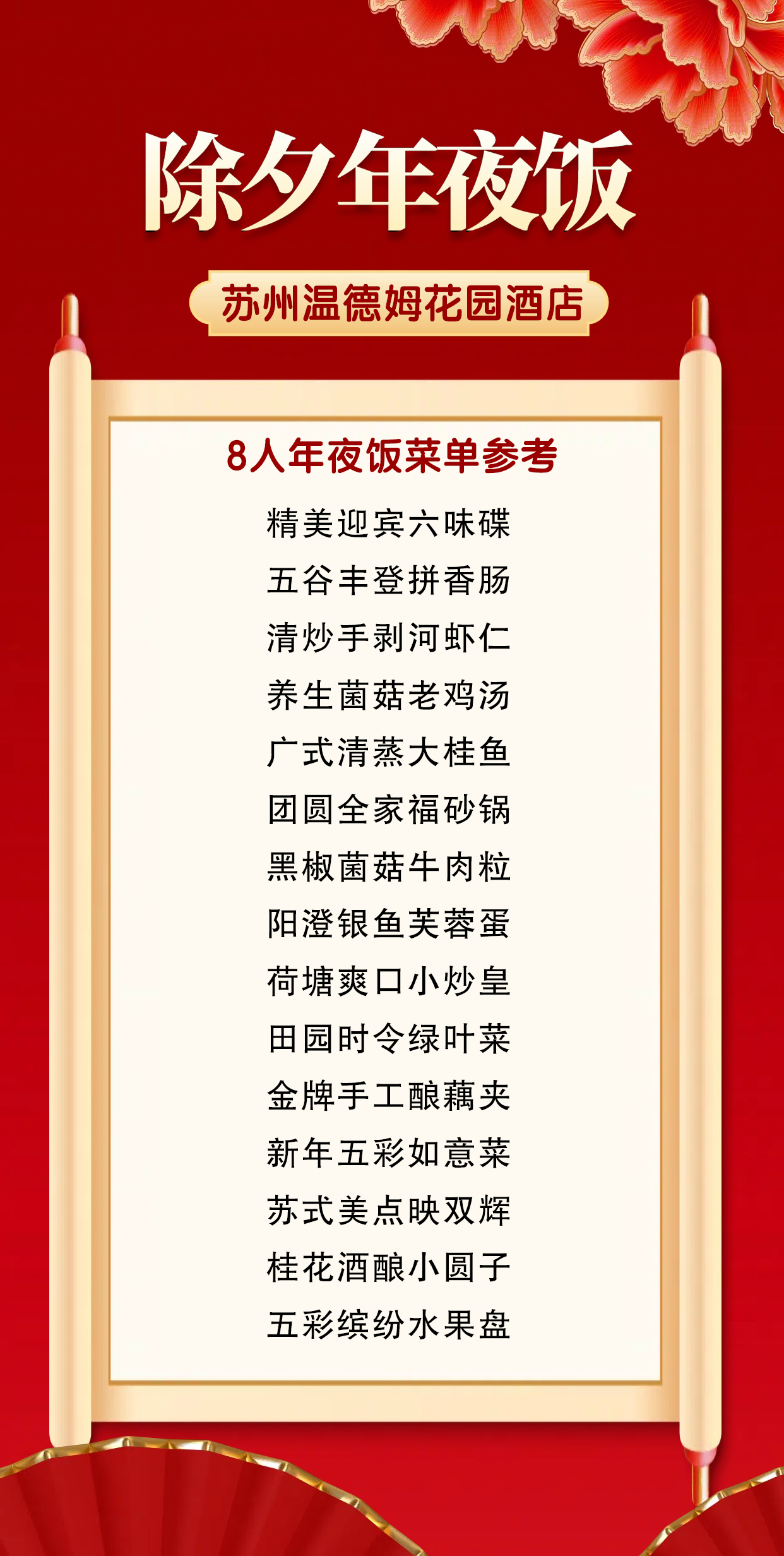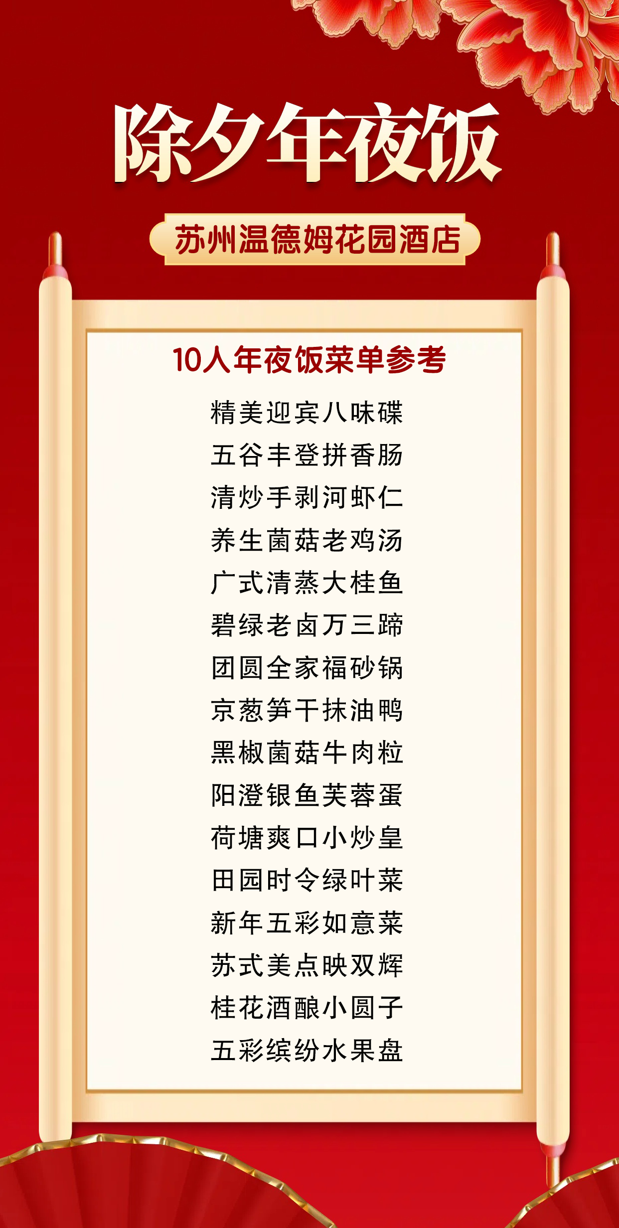 ★江苏年夜饭★¥899起/人 3天2晚【苏州温德姆花园酒店】豪华房+双早,除夕年夜饭+年初一自助晚餐,8人/10人套餐可选!背靠观前街,东临平江路!2026年2月16日专享