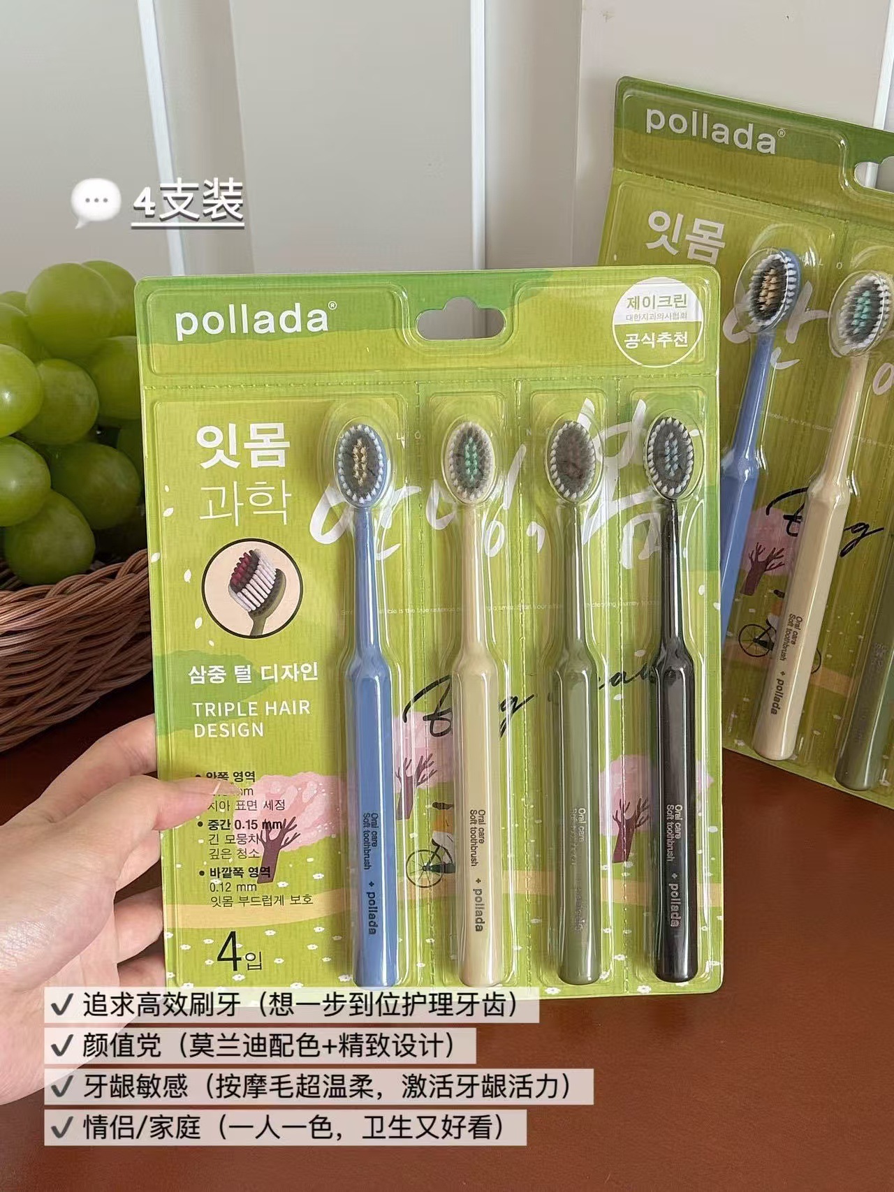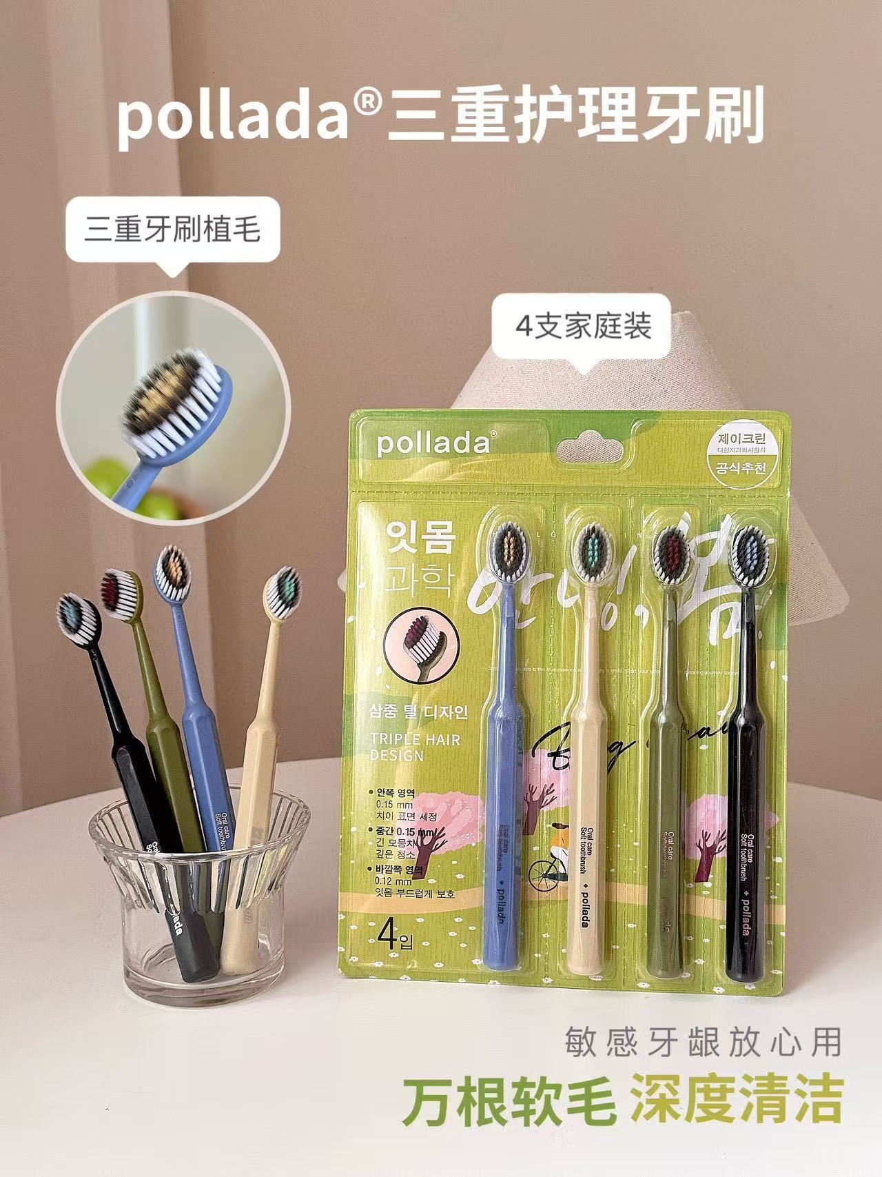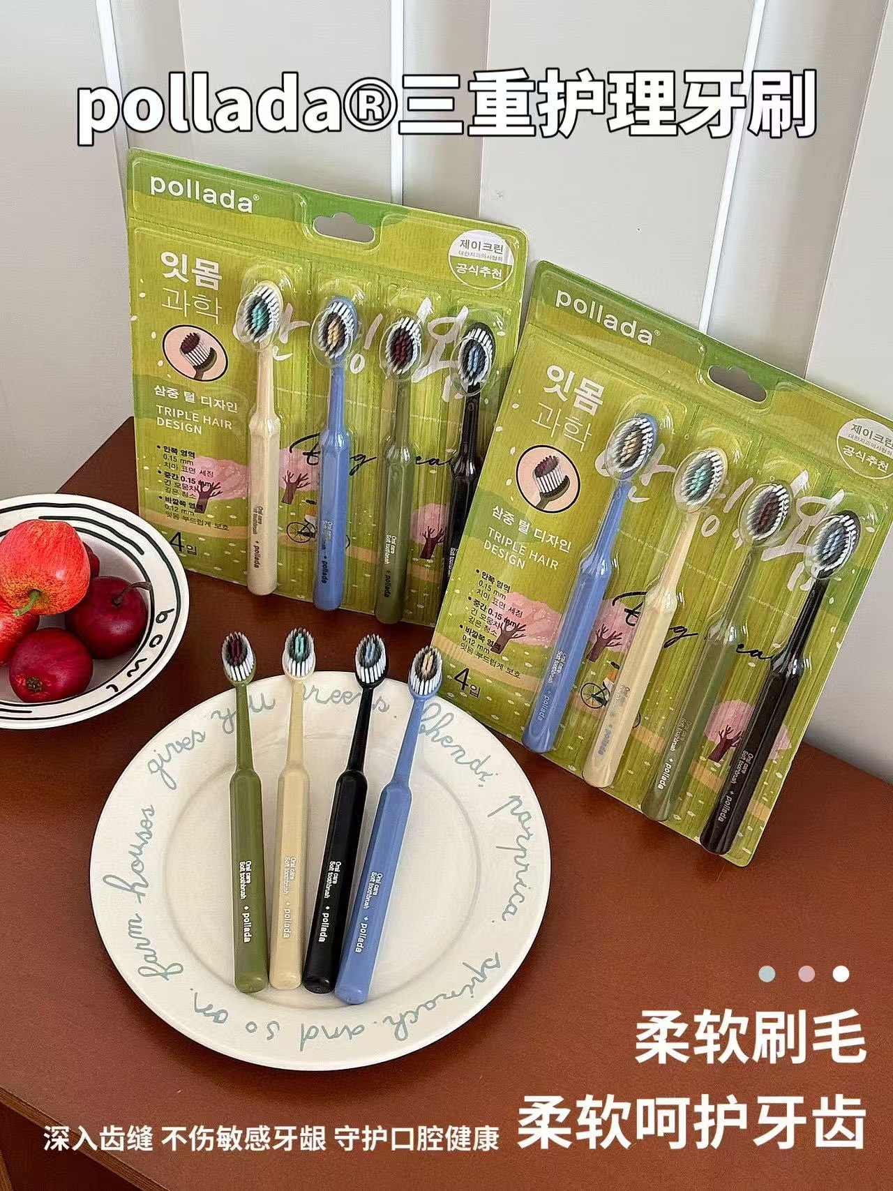 清仓到手3盒12支【出口韩国pollada三重护理牙刷】万根软毛 深度清洁 外侧软毛清洁牙缝残渣中间按摩毛激发活力 三重植毛设计:清洁、按摩、亮白分区护理