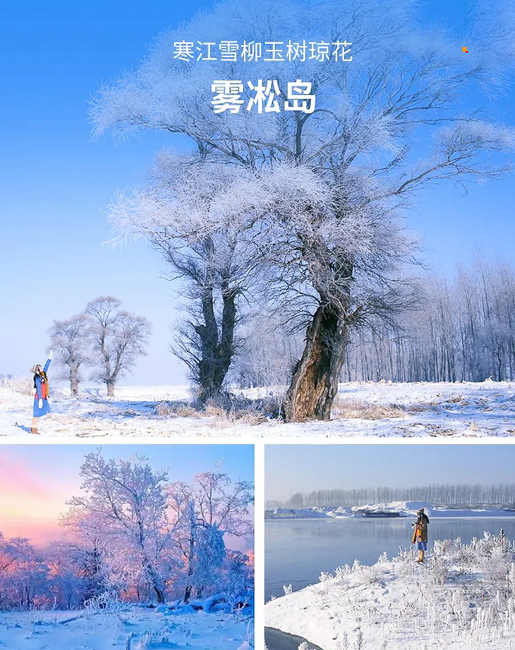 雾松岛是松花江上冲击而成的江中小岛,因雾凇多且美丽而得名,常能拍出风光大片,受到大批摄影爱好者的追捧。每到寒冬,不冻的江水中升腾的水雾遇冷,在树上凝结为霜花,从远处看正是传说中的玉树琼花,美不胜言。