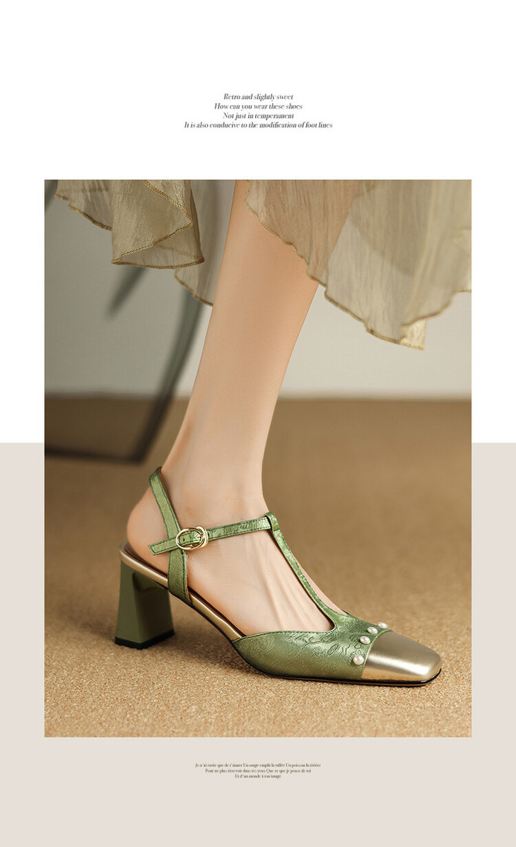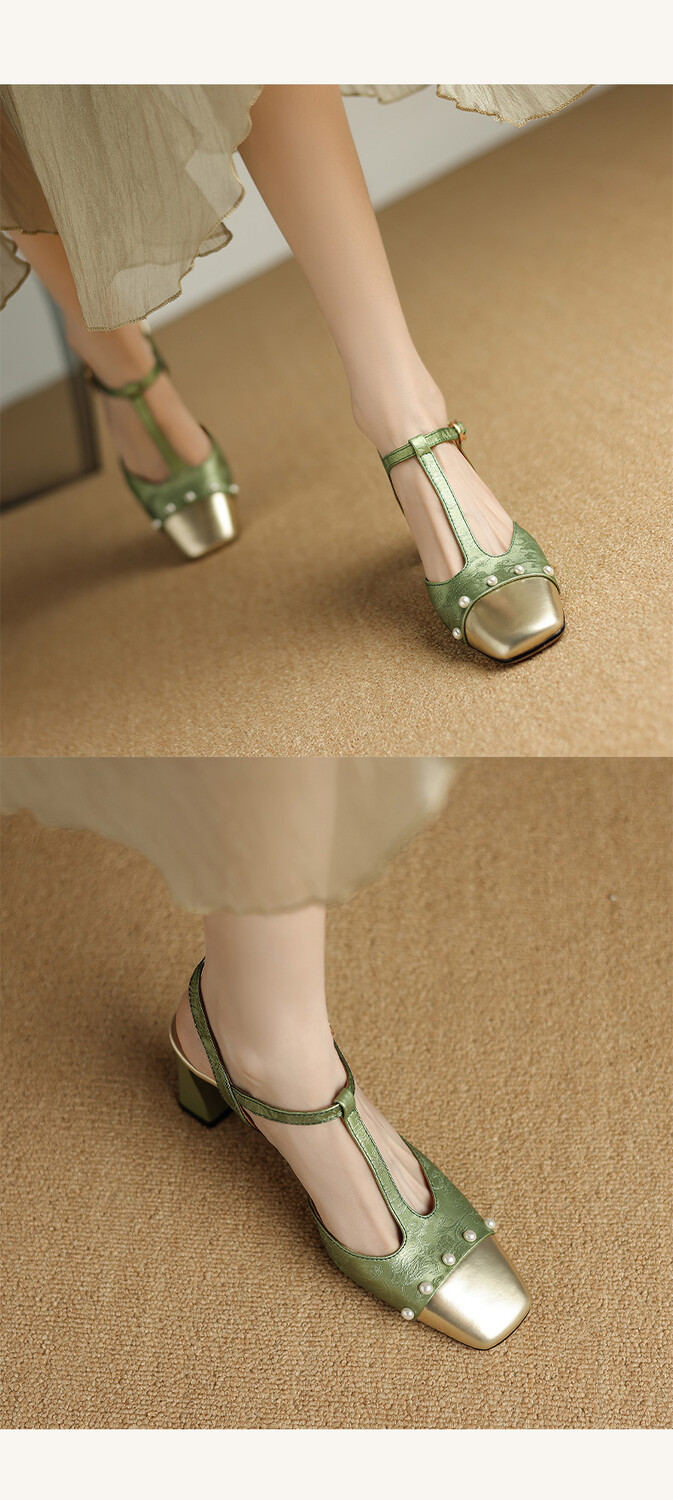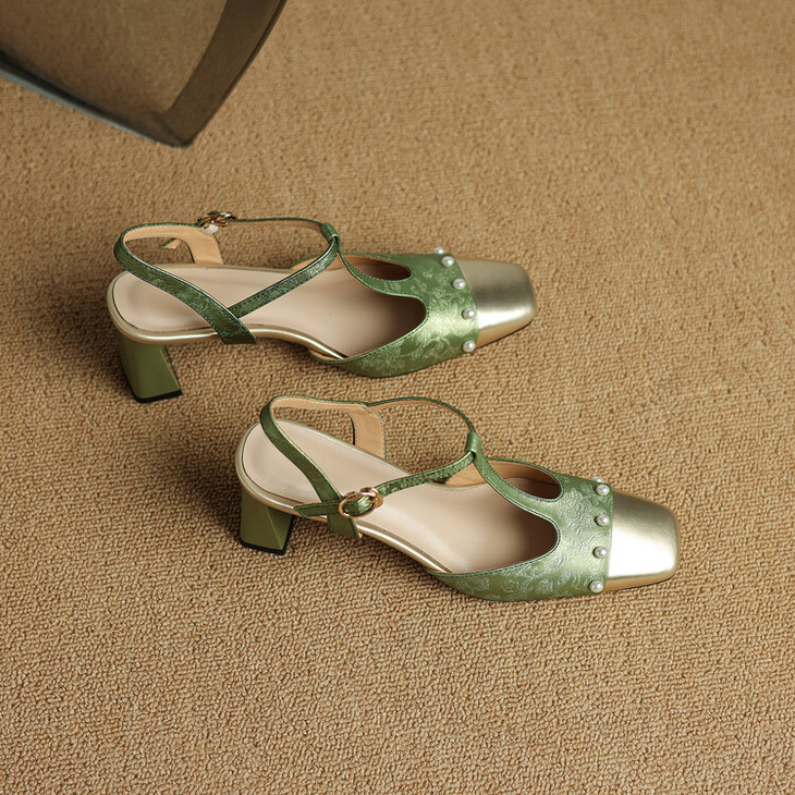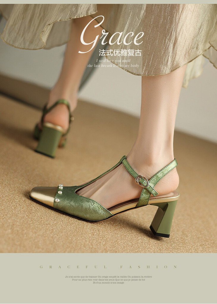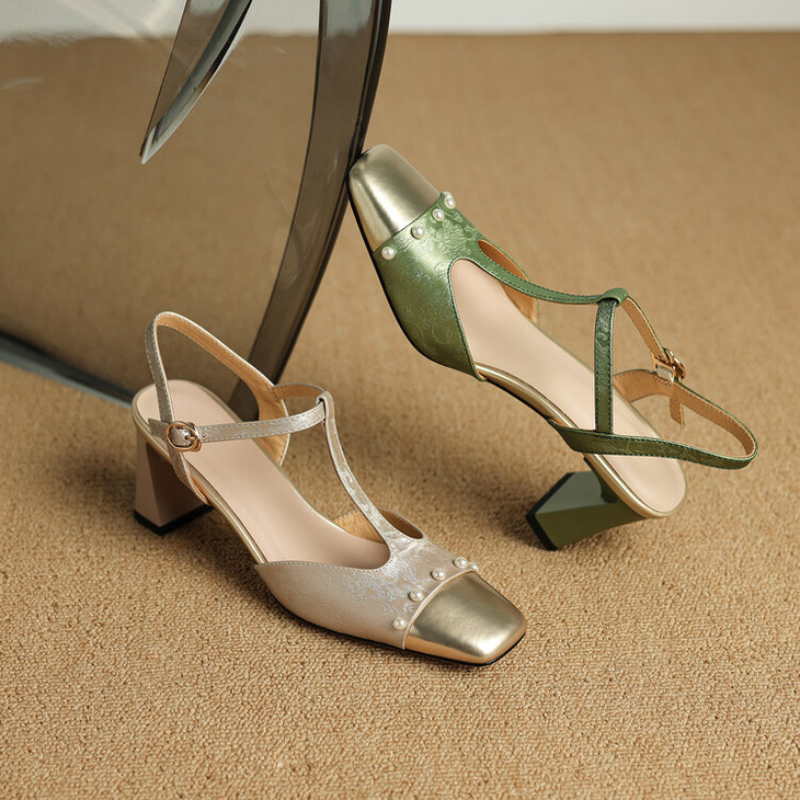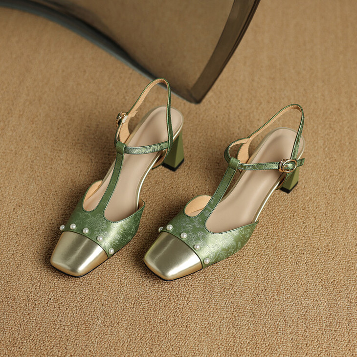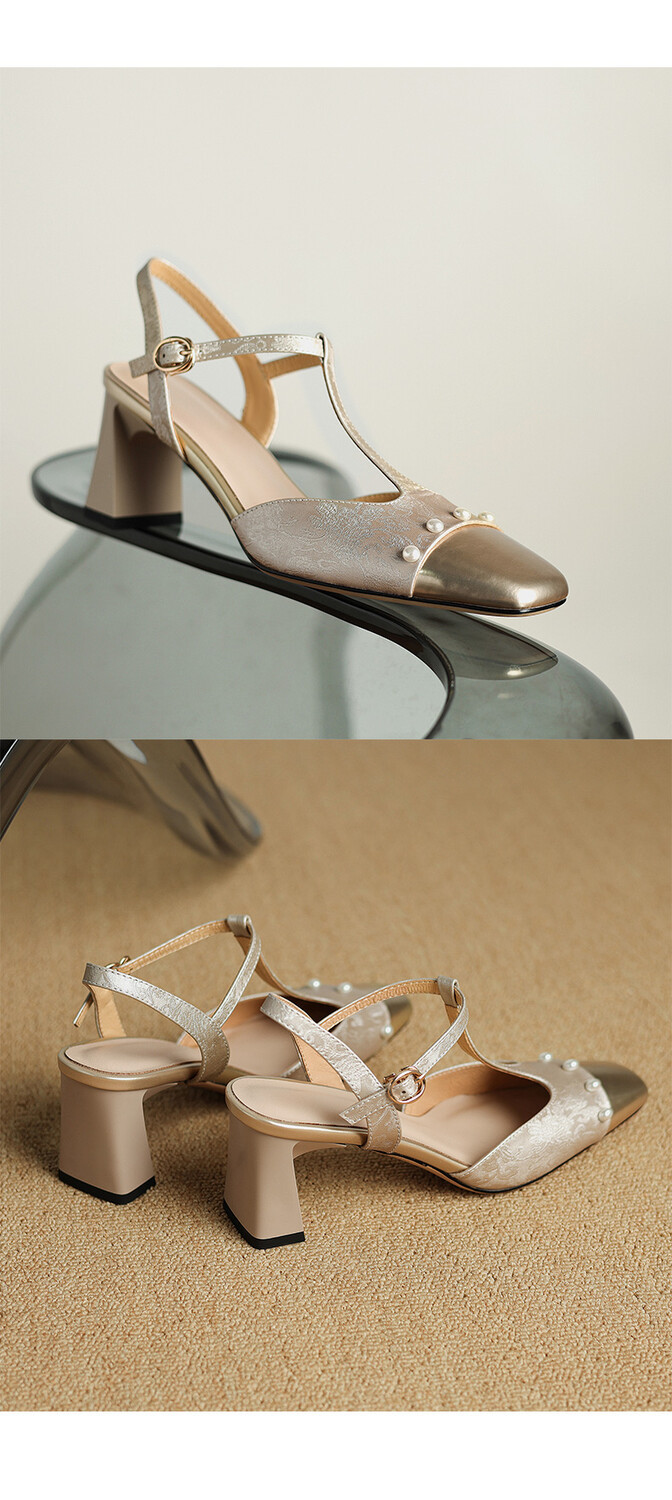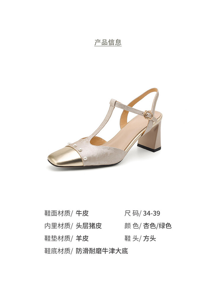 【预售5天】法式全皮拼色国风珍珠T字带包头凉鞋女方头后空玛丽珍粗高跟鞋GDY&3170