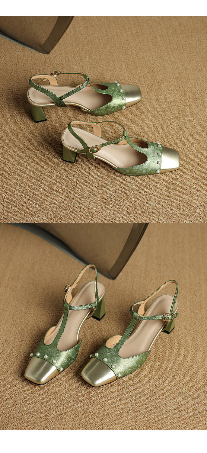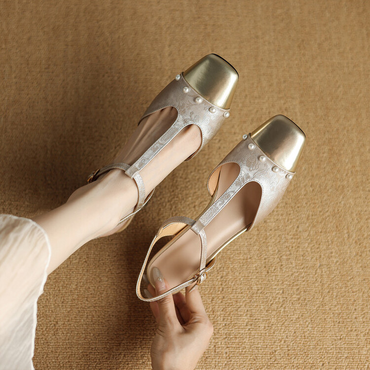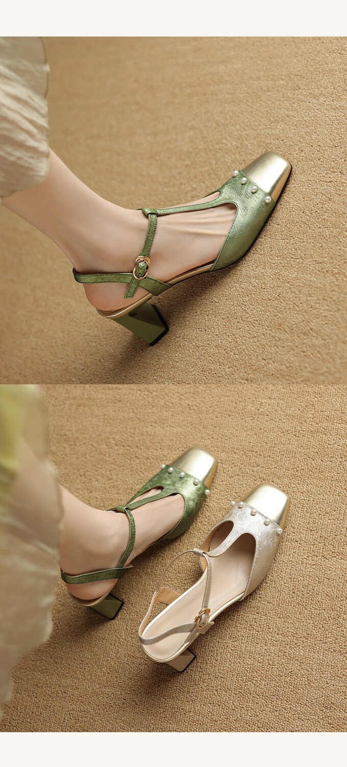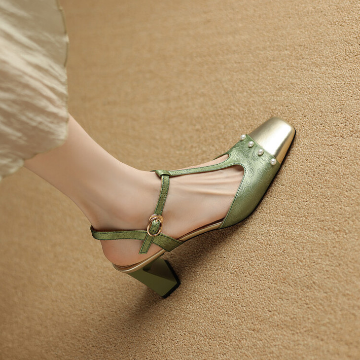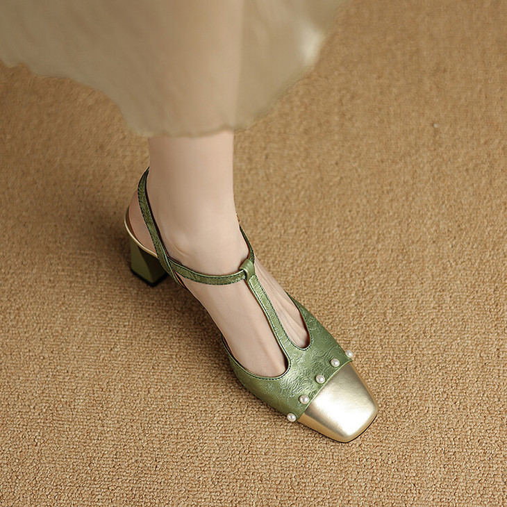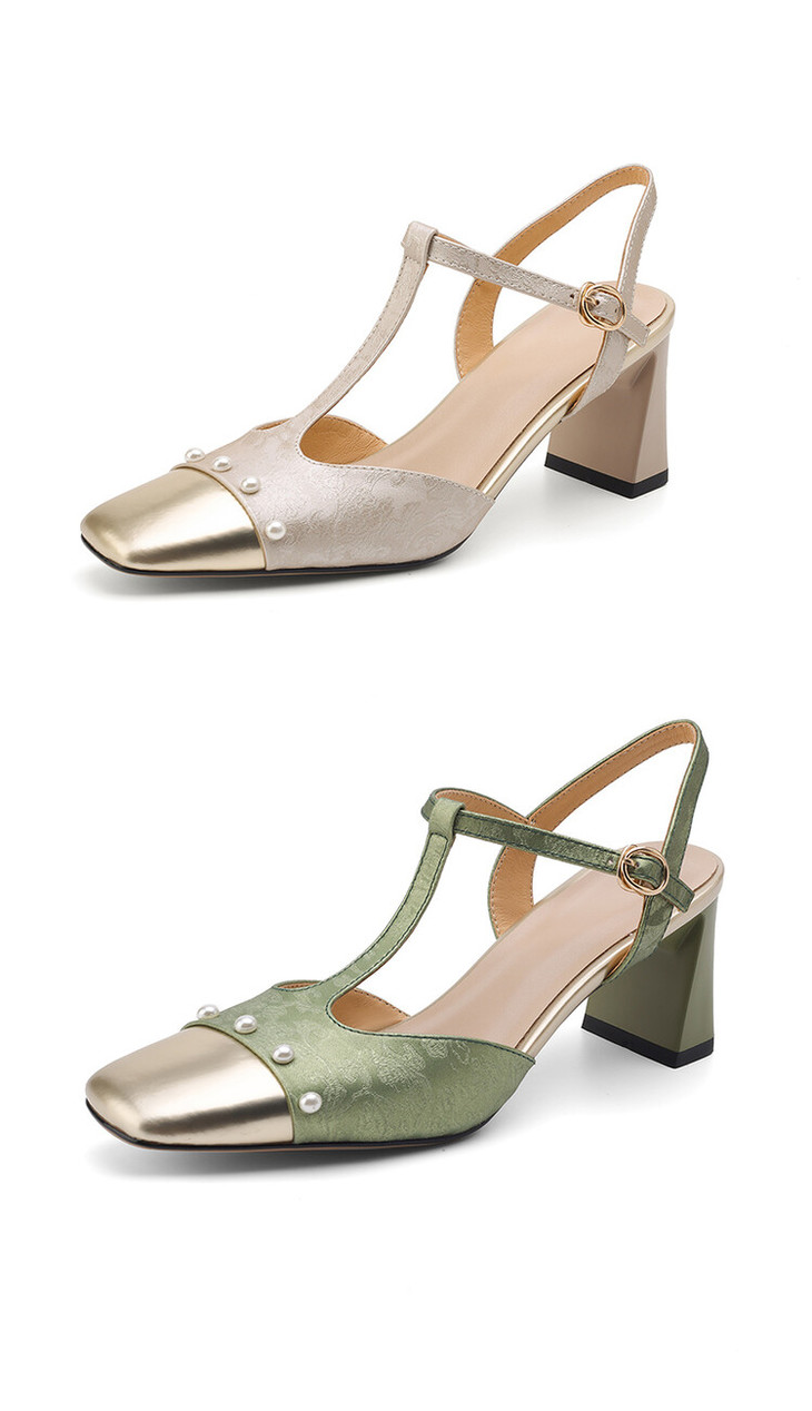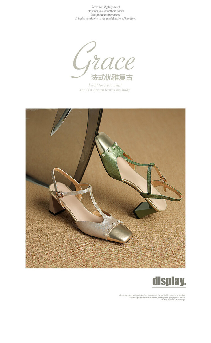 【预售5天】法式全皮拼色国风珍珠T字带包头凉鞋女方头后空玛丽珍粗高跟鞋GDY&3170