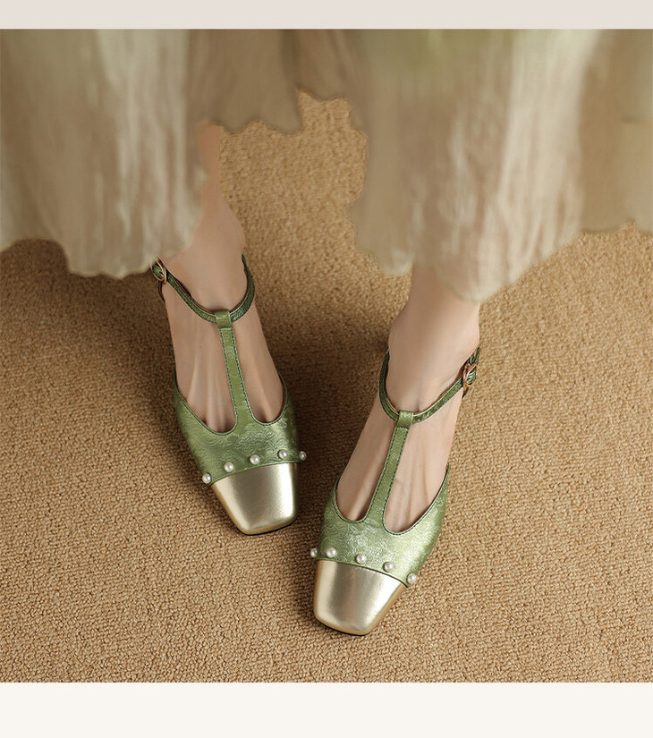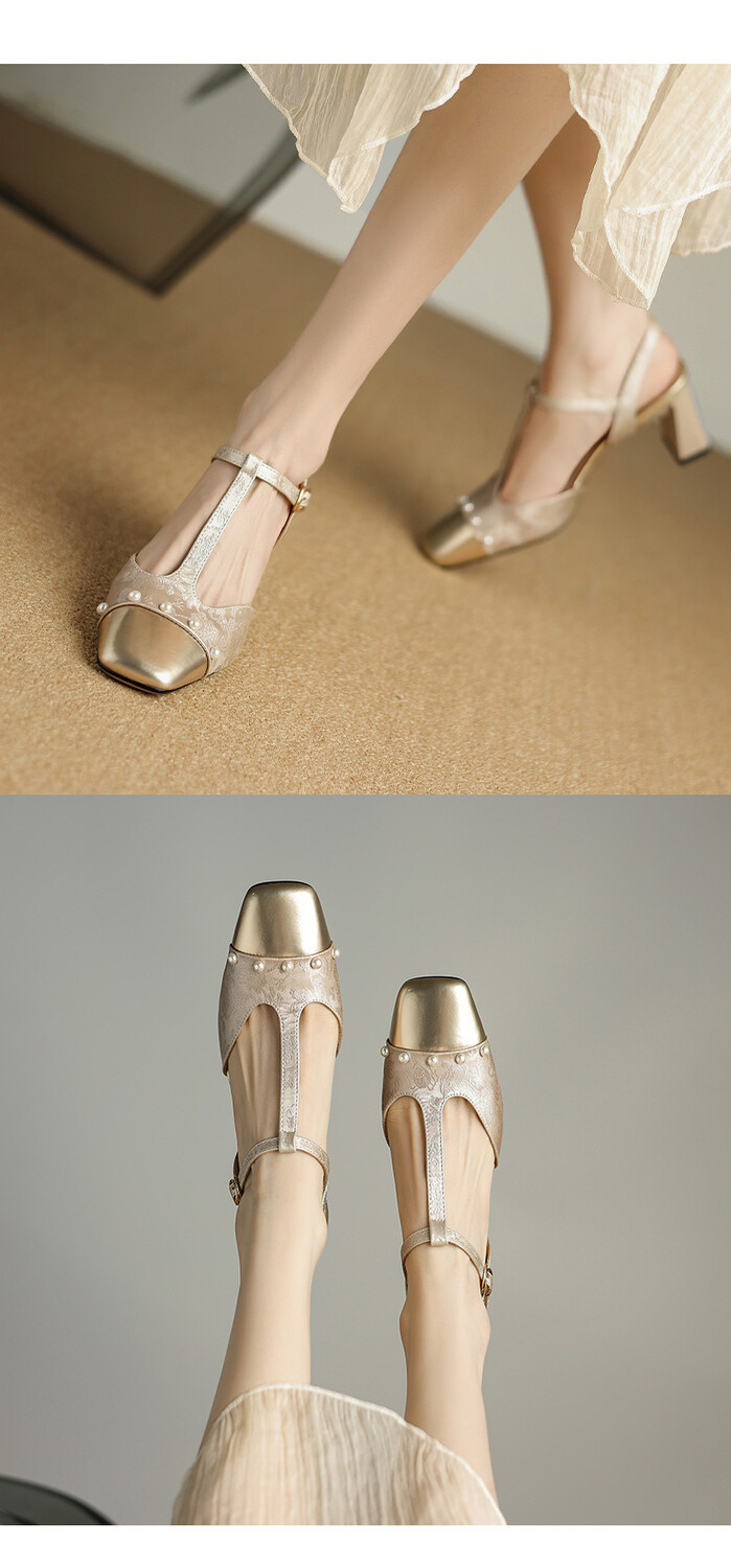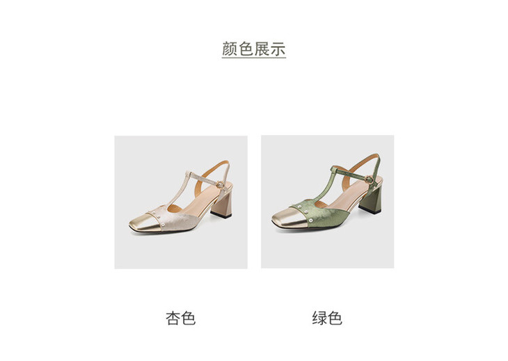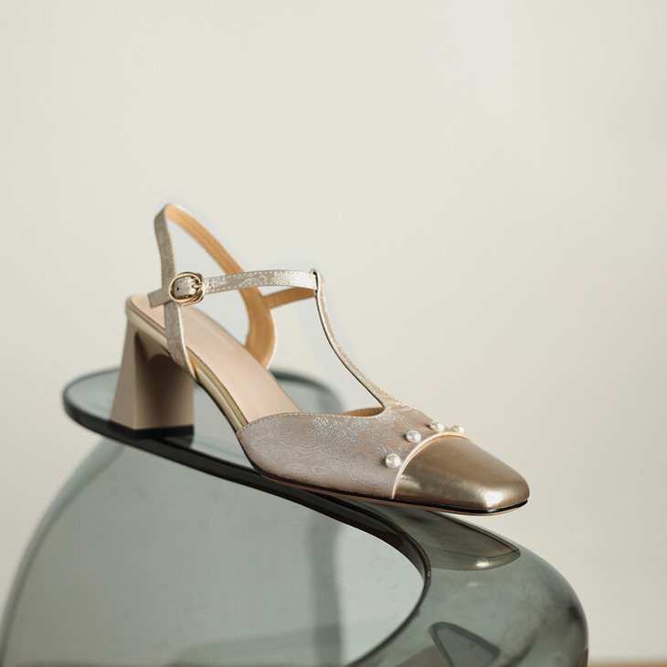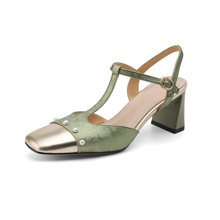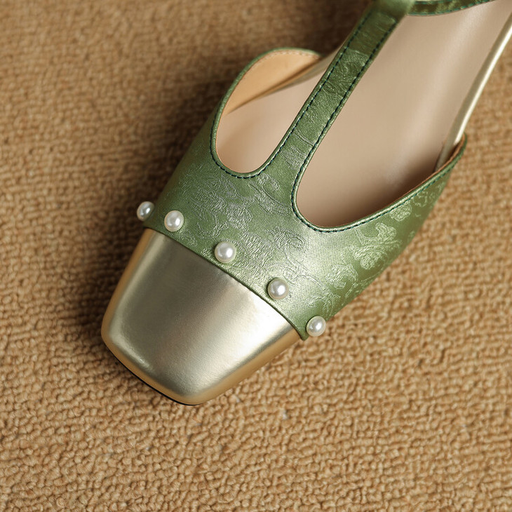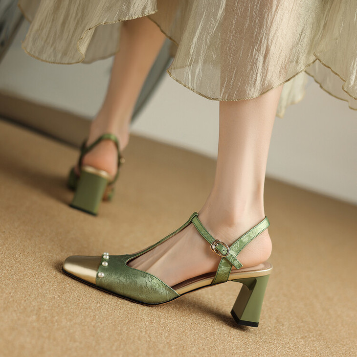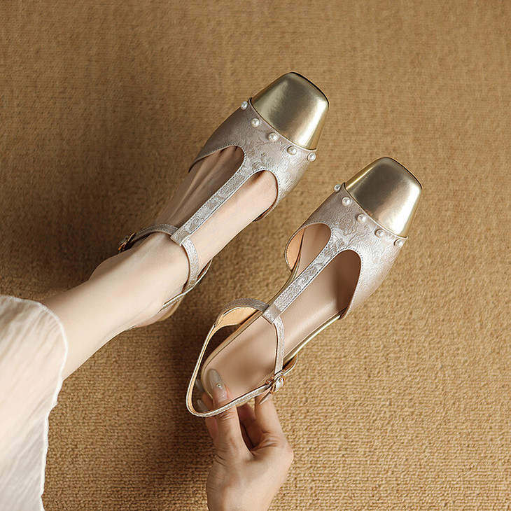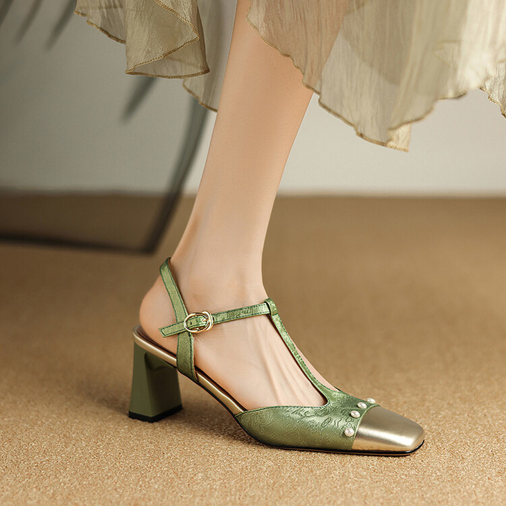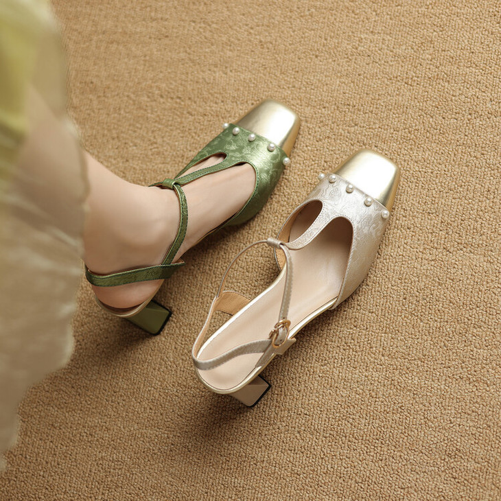 【预售5天】法式全皮拼色国风珍珠T字带包头凉鞋女方头后空玛丽珍粗高跟鞋GDY&3170