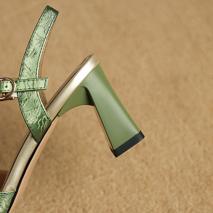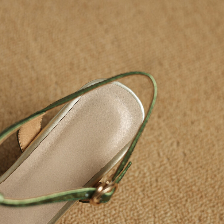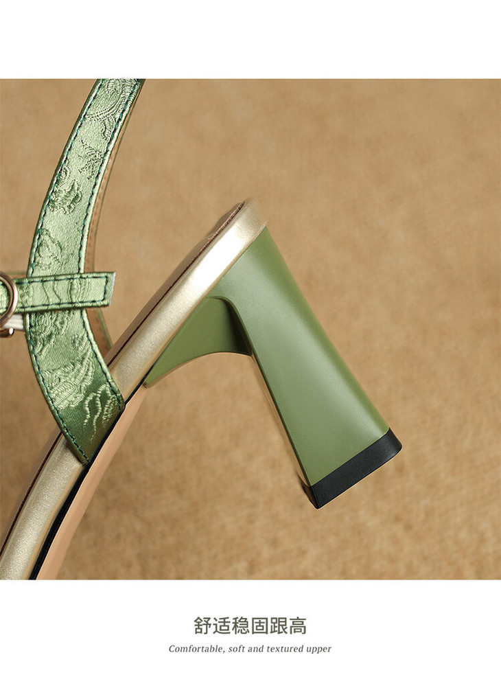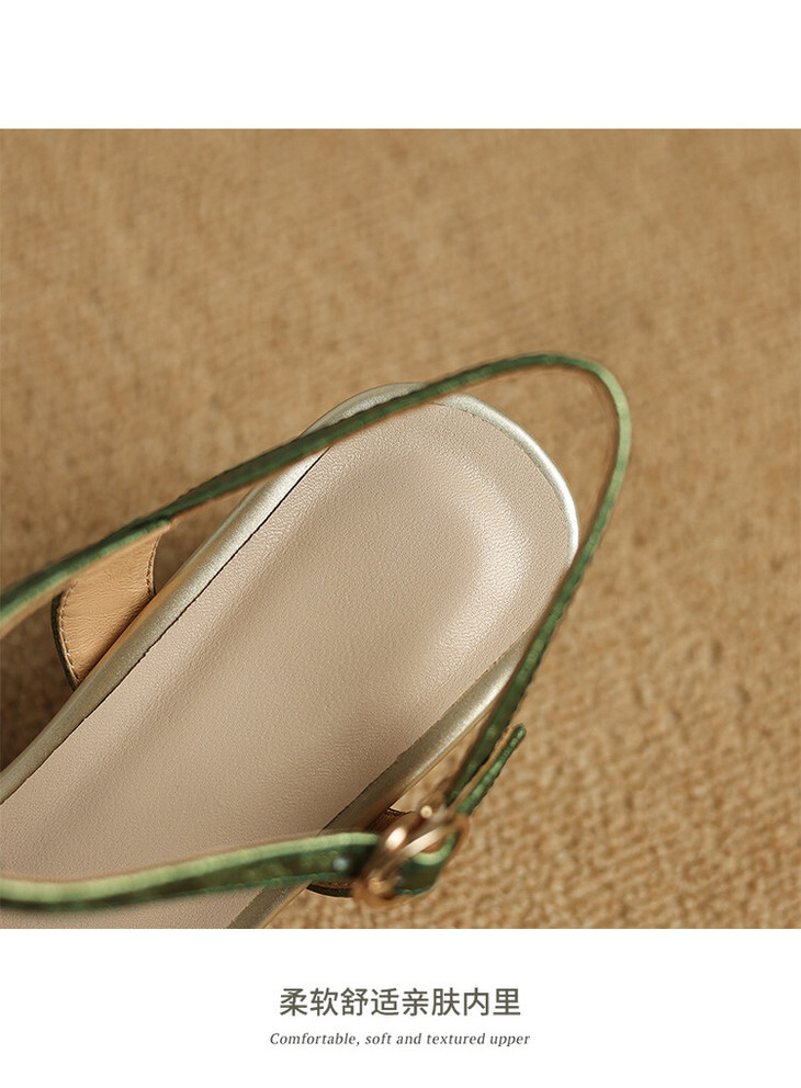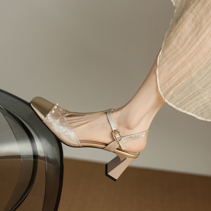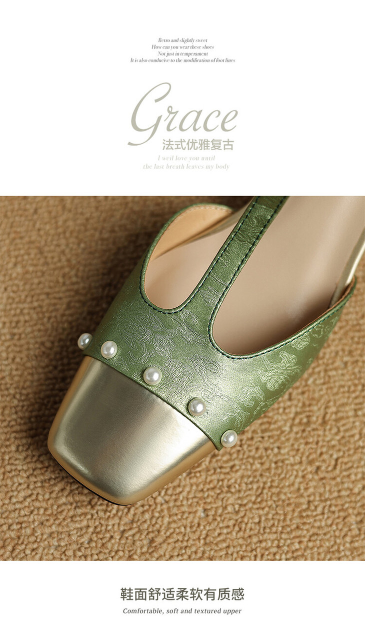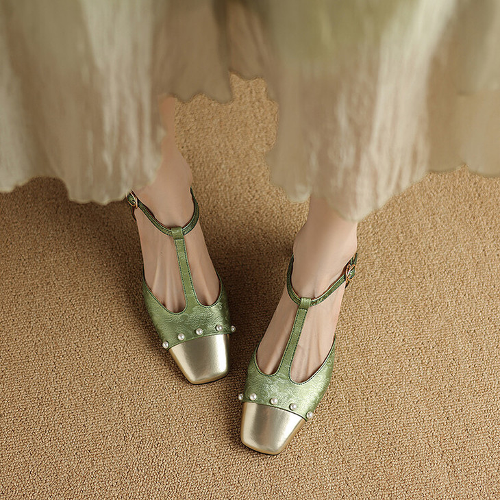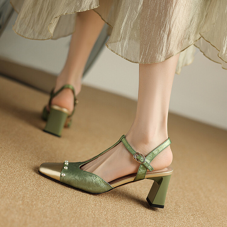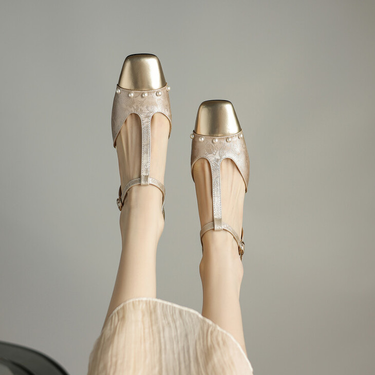 【预售5天】法式全皮拼色国风珍珠T字带包头凉鞋女方头后空玛丽珍粗高跟鞋GDY&3170