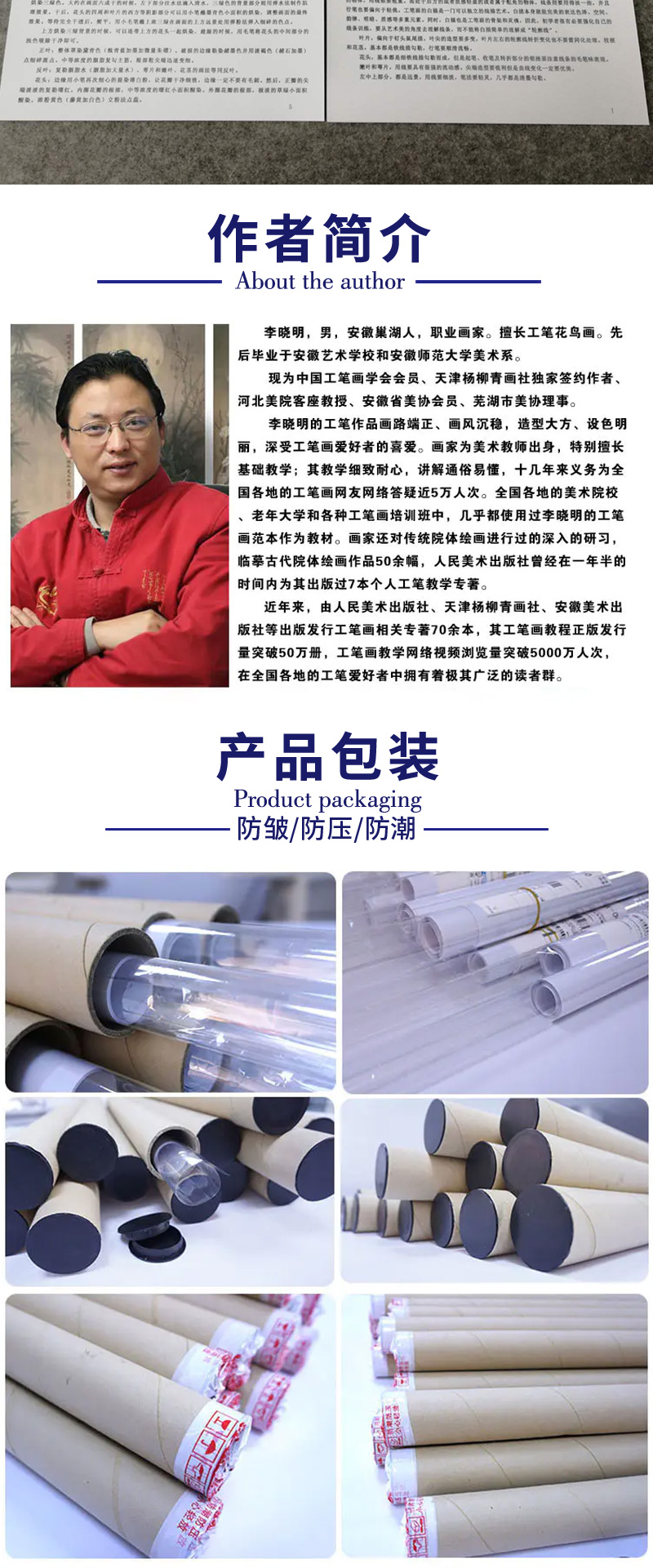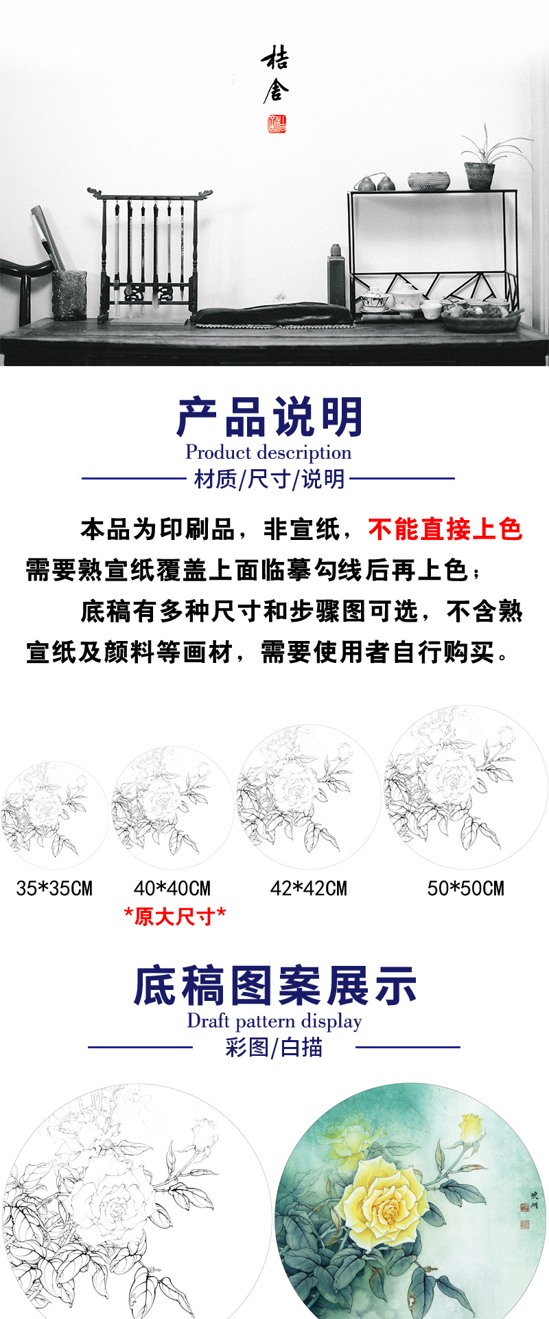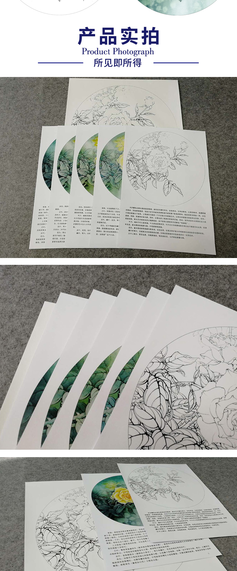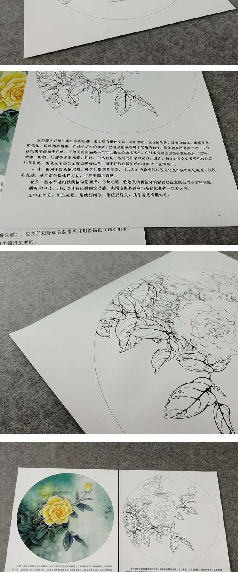 【有步骤、大彩图】李晓明工笔画白描底稿圆形小品《月季写真图》月季临摹勾线花鸟线稿KB05