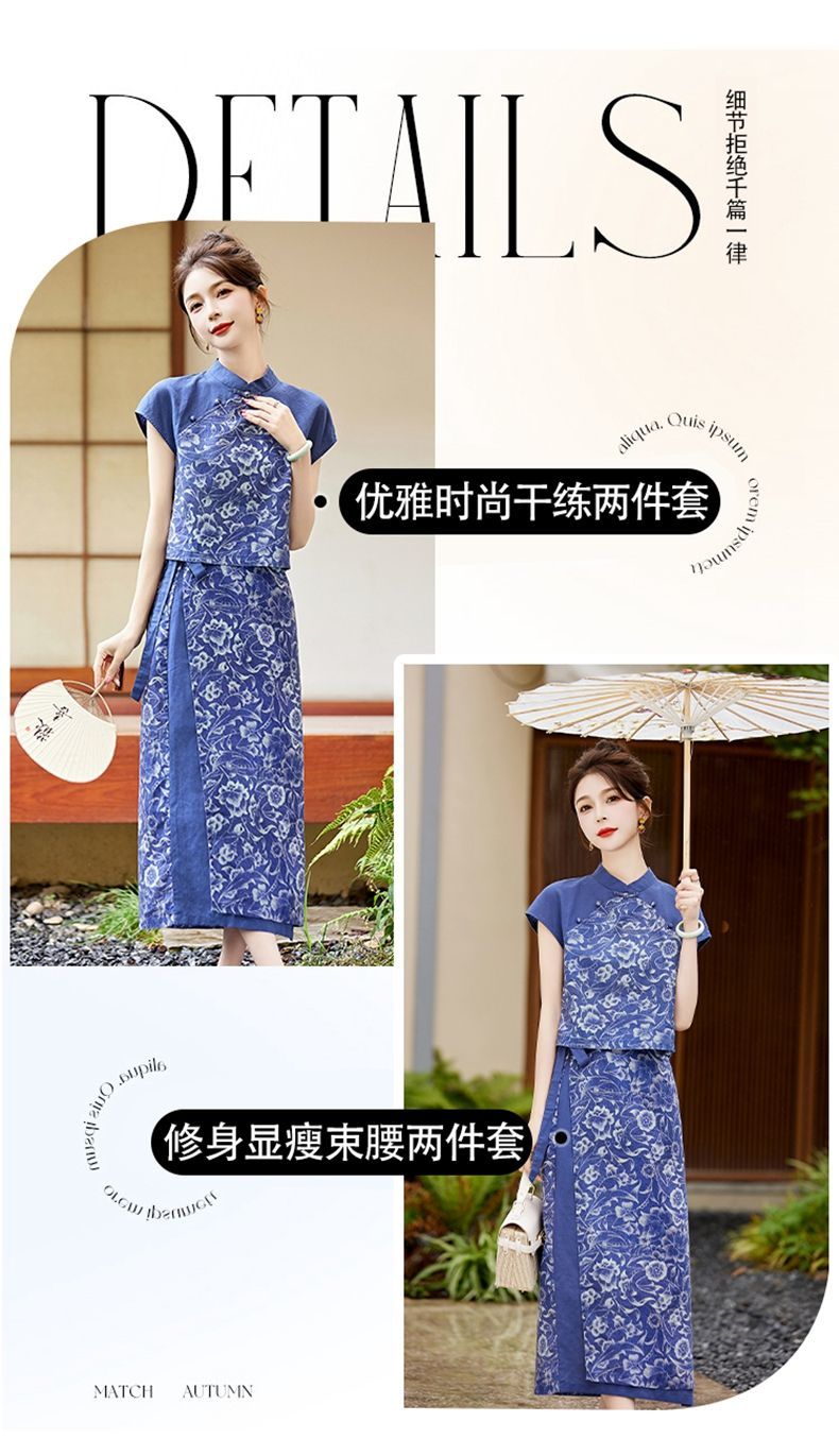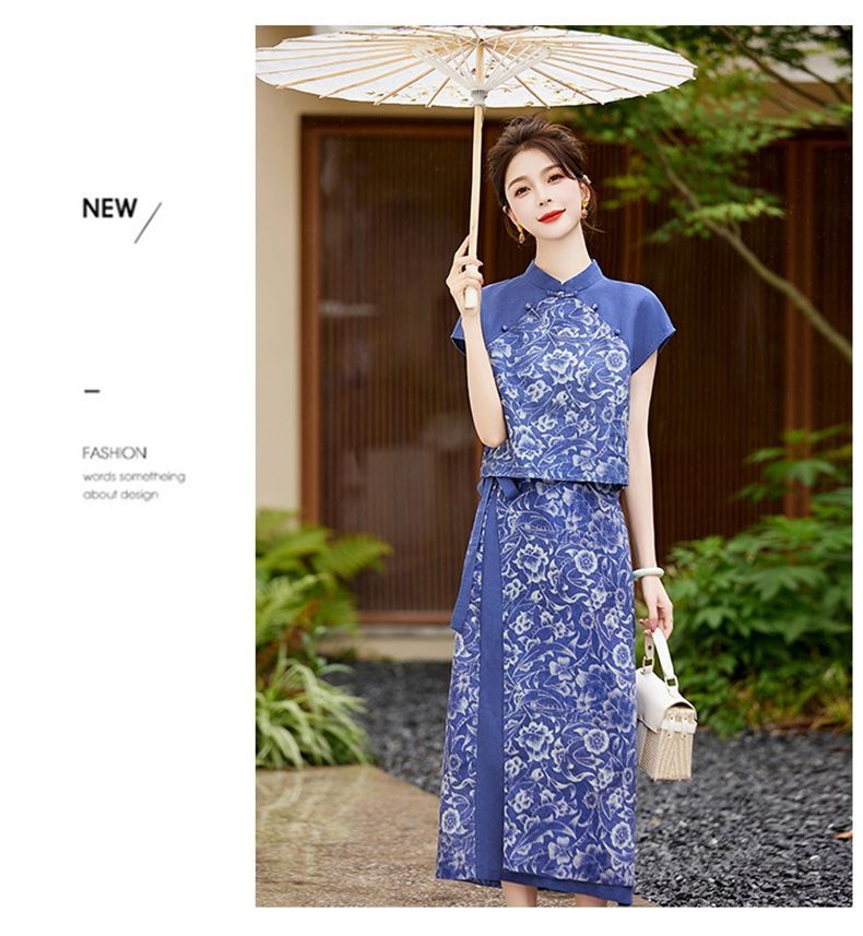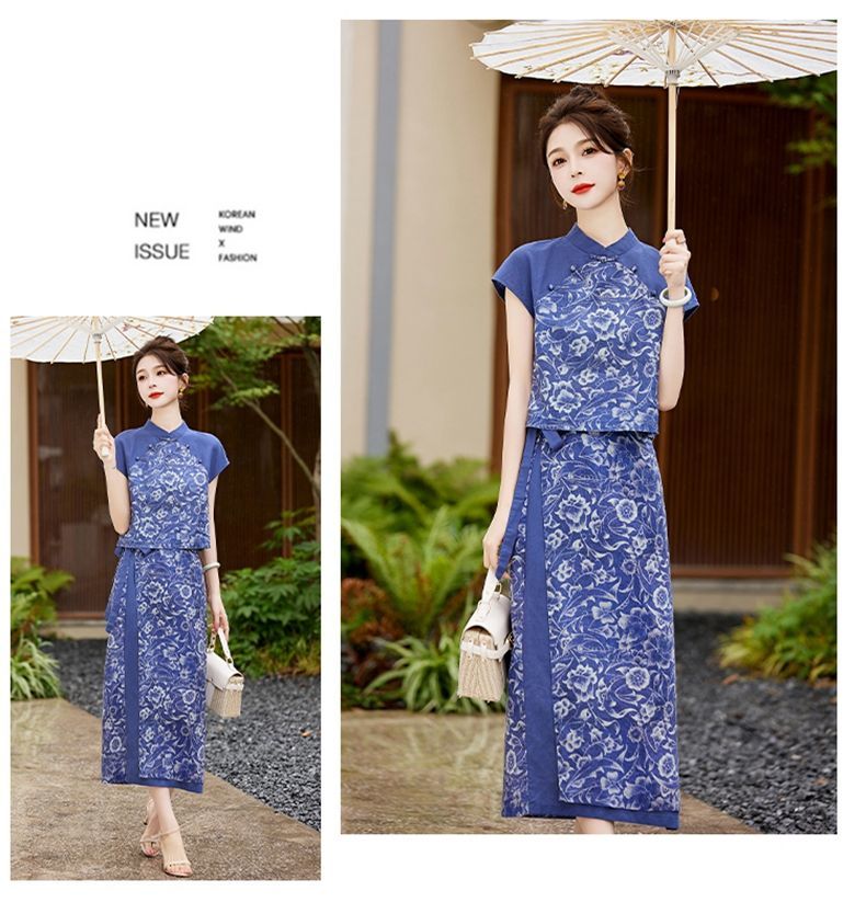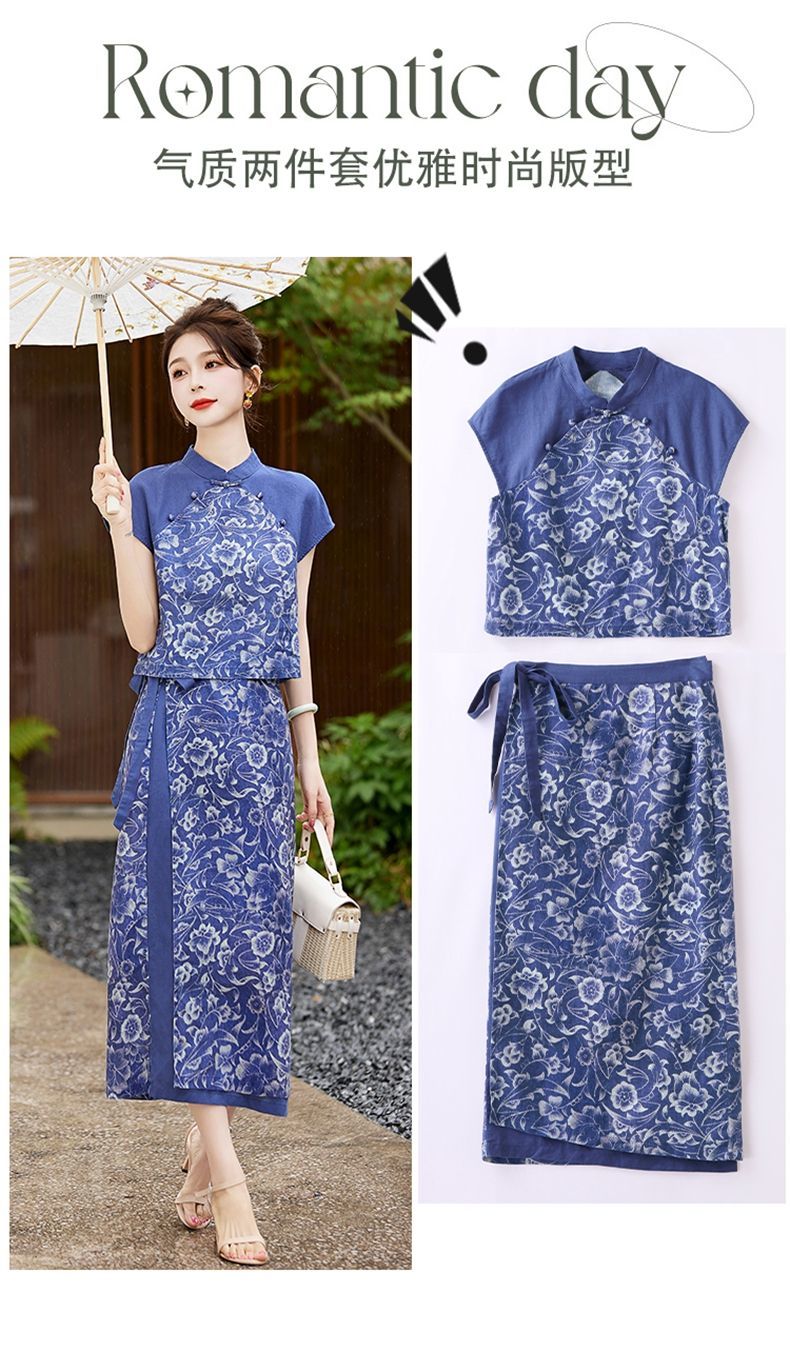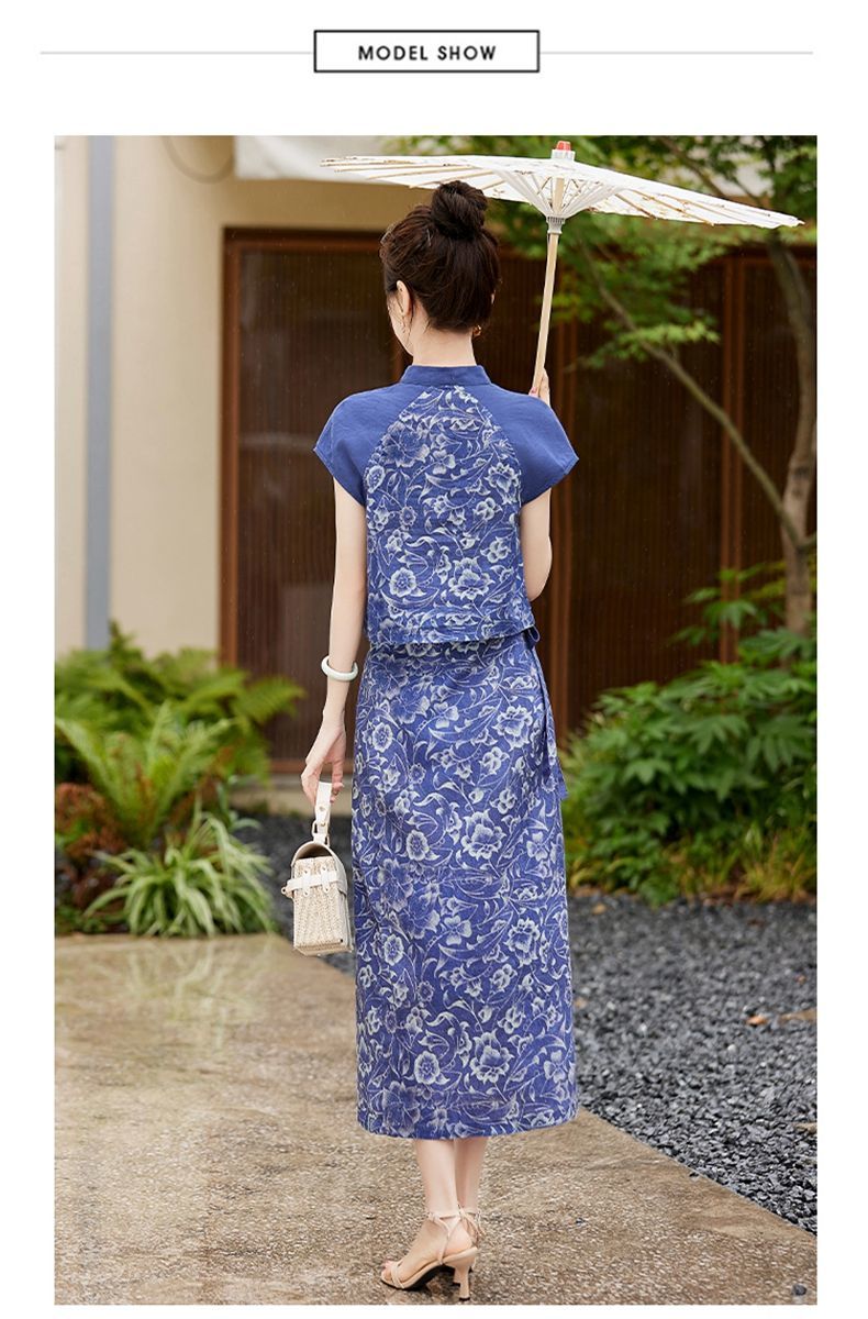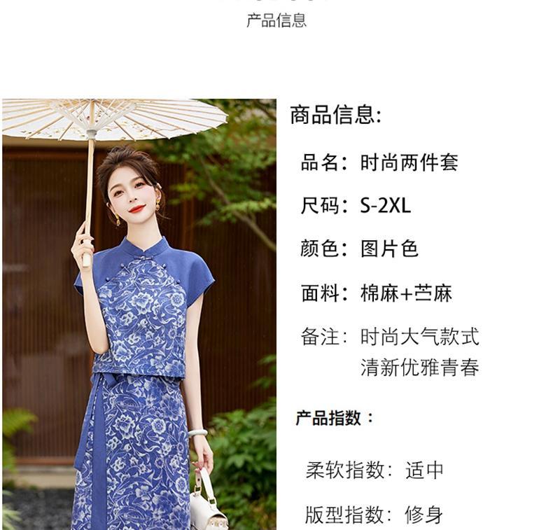 YRX888966 国风盘扣短袖印花上衣套装女2023夏季新款设计感减龄半身裙两件套