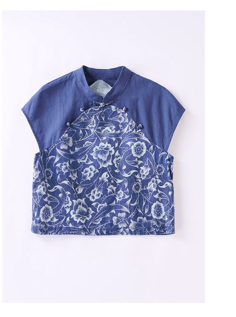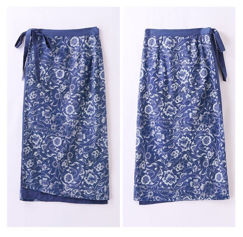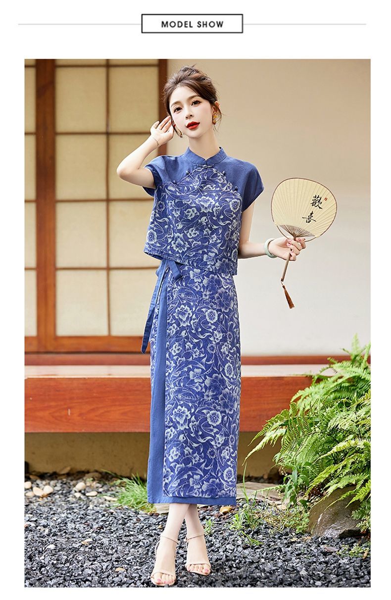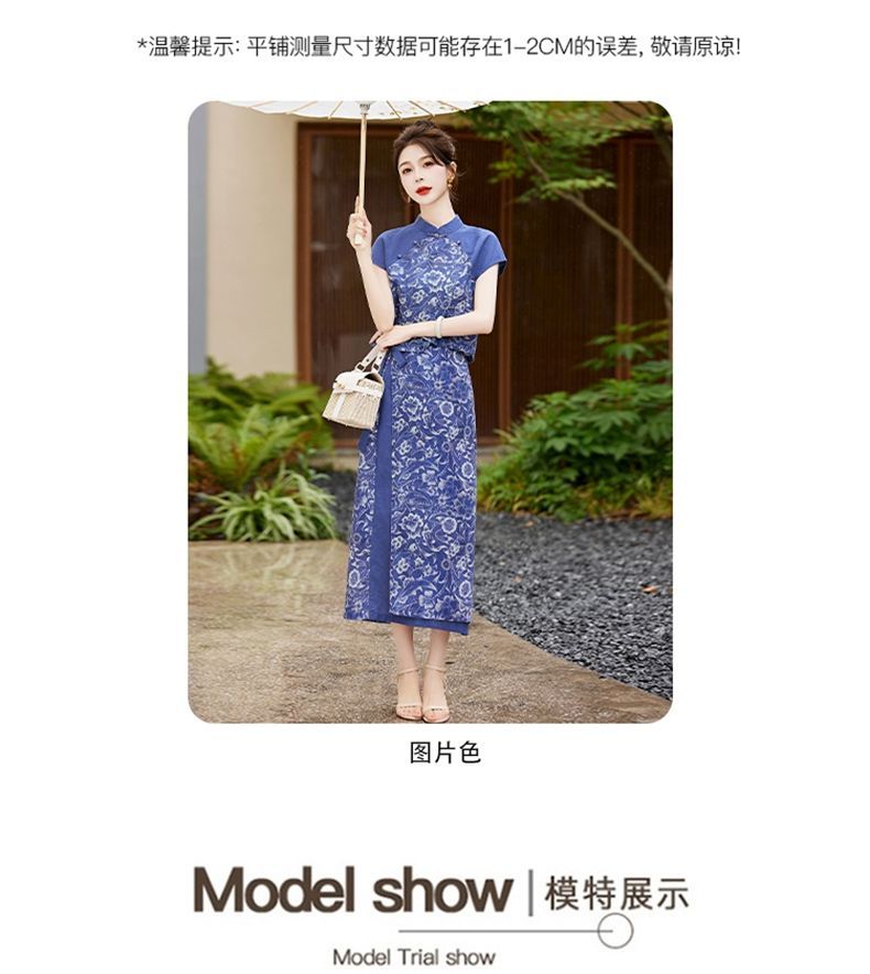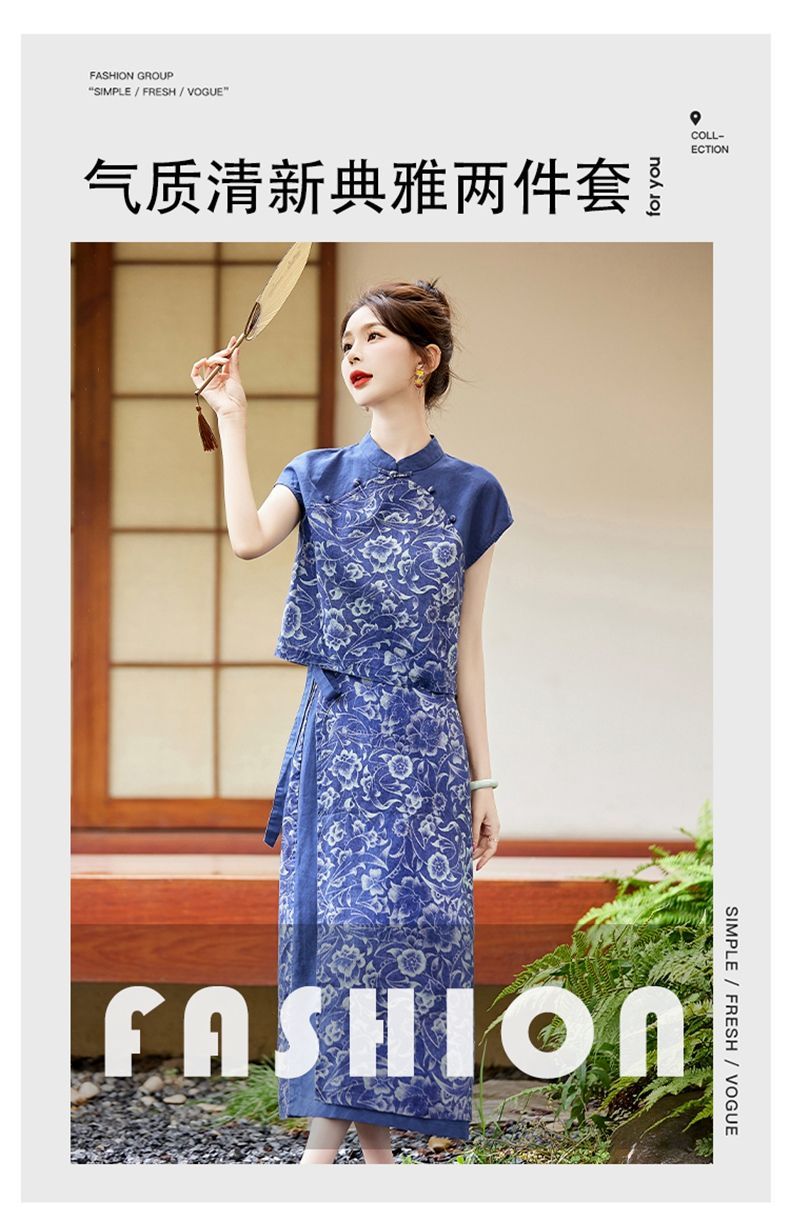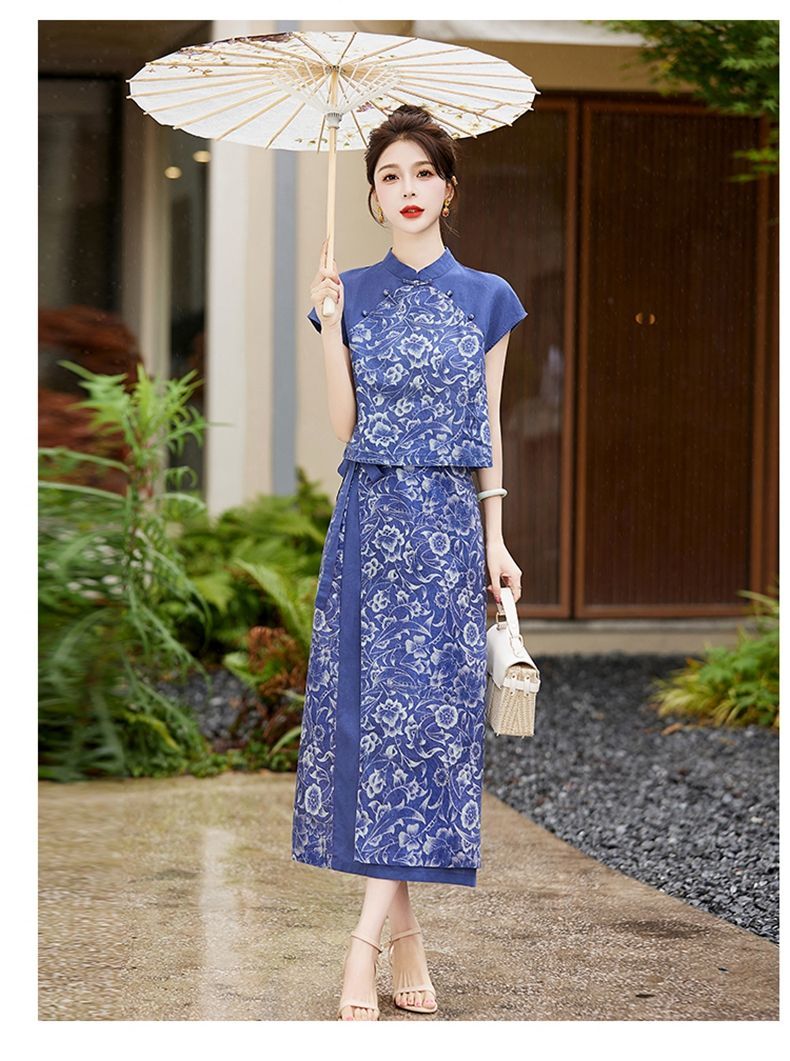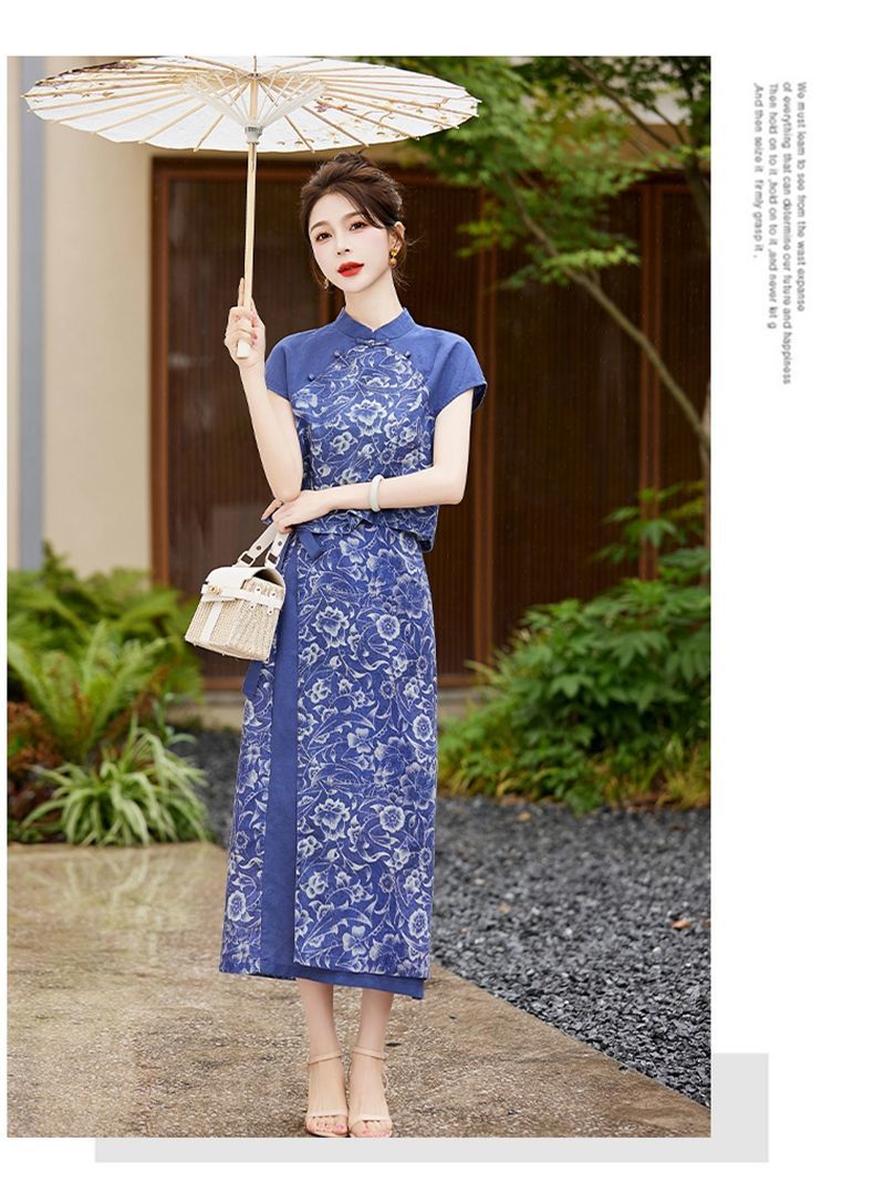 YRX888966 国风盘扣短袖印花上衣套装女2023夏季新款设计感减龄半身裙两件套