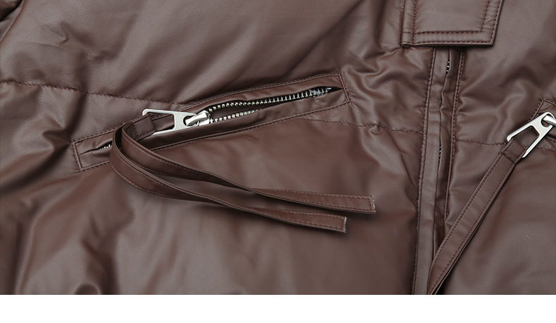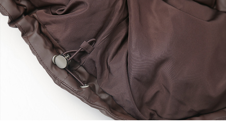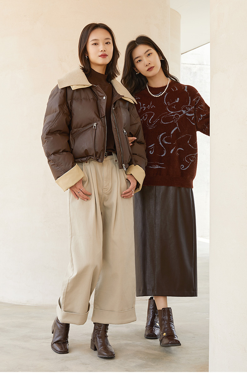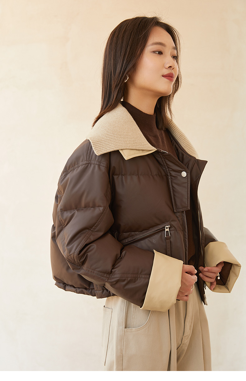 深棕色撞色针织领短款羽绒服 复古风拉链口袋皮感外套 冬季保暖显瘦个性女式上衣