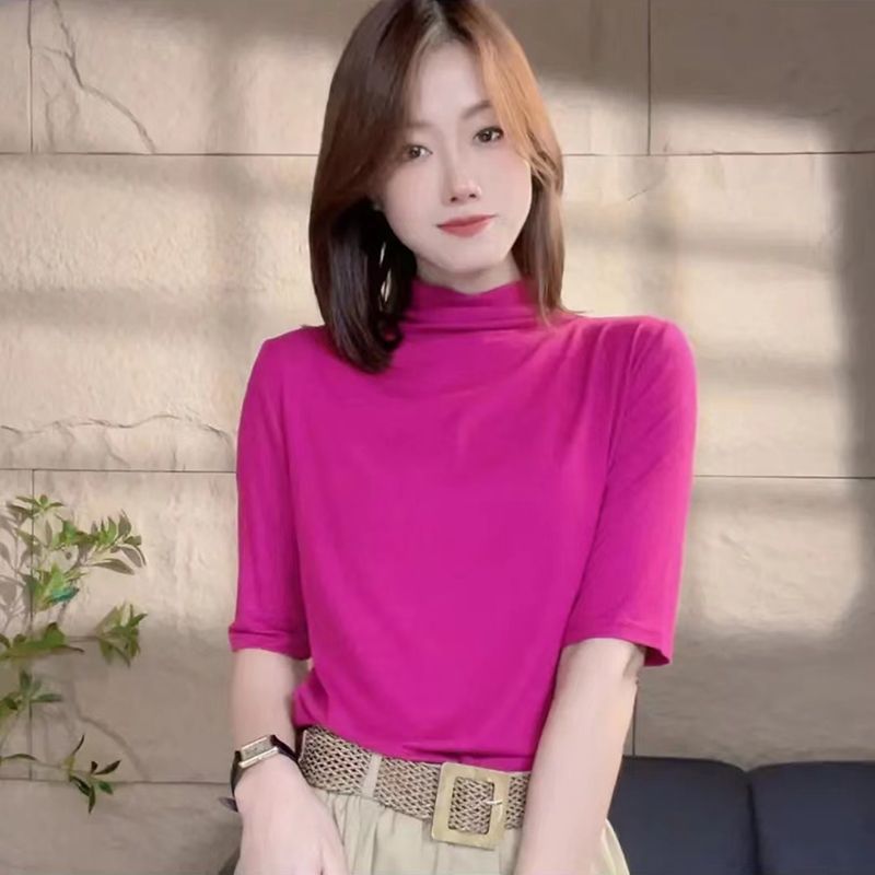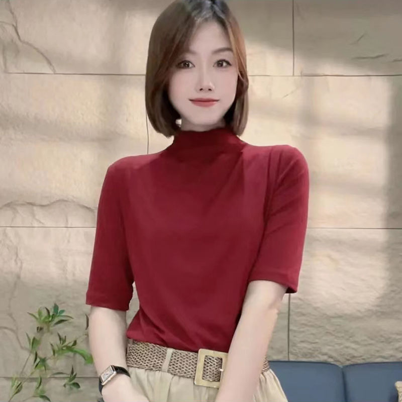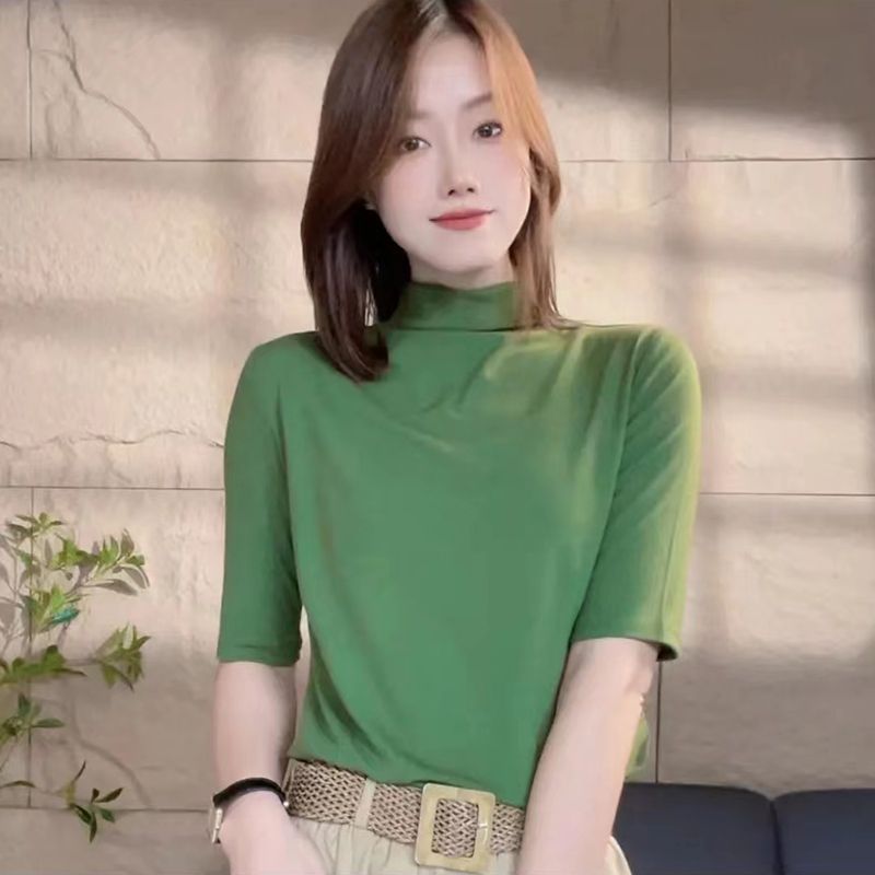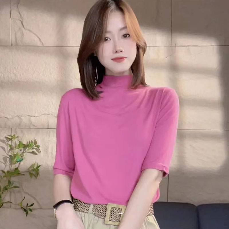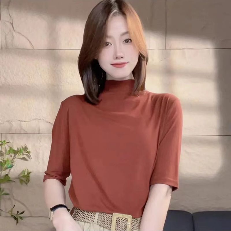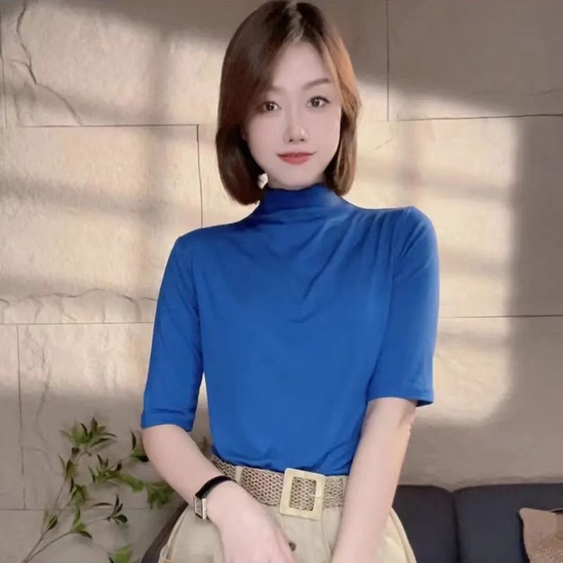 Awm-24012025早秋新款时尚半高领纯色T恤女士修身内搭上衣时尚打底衫