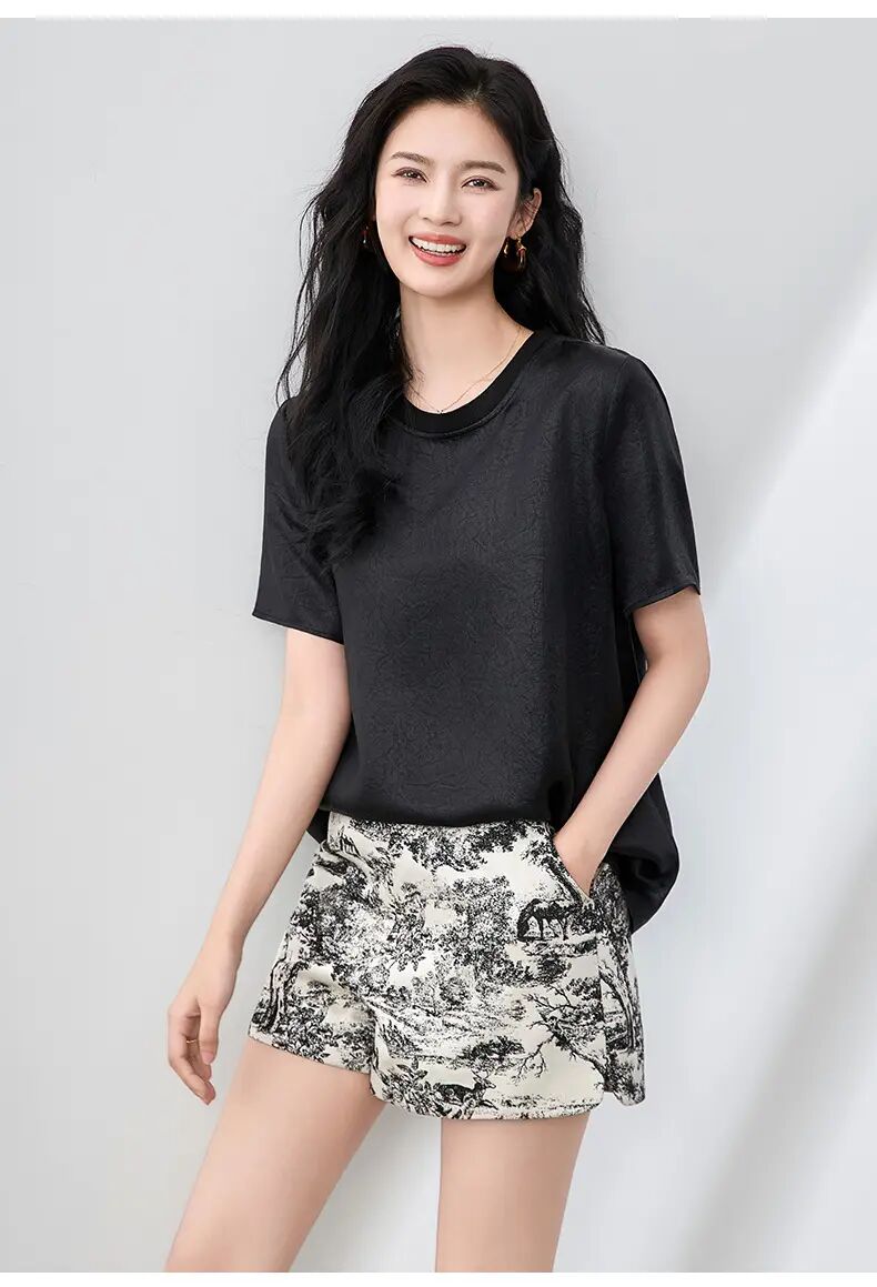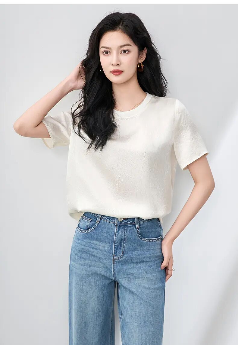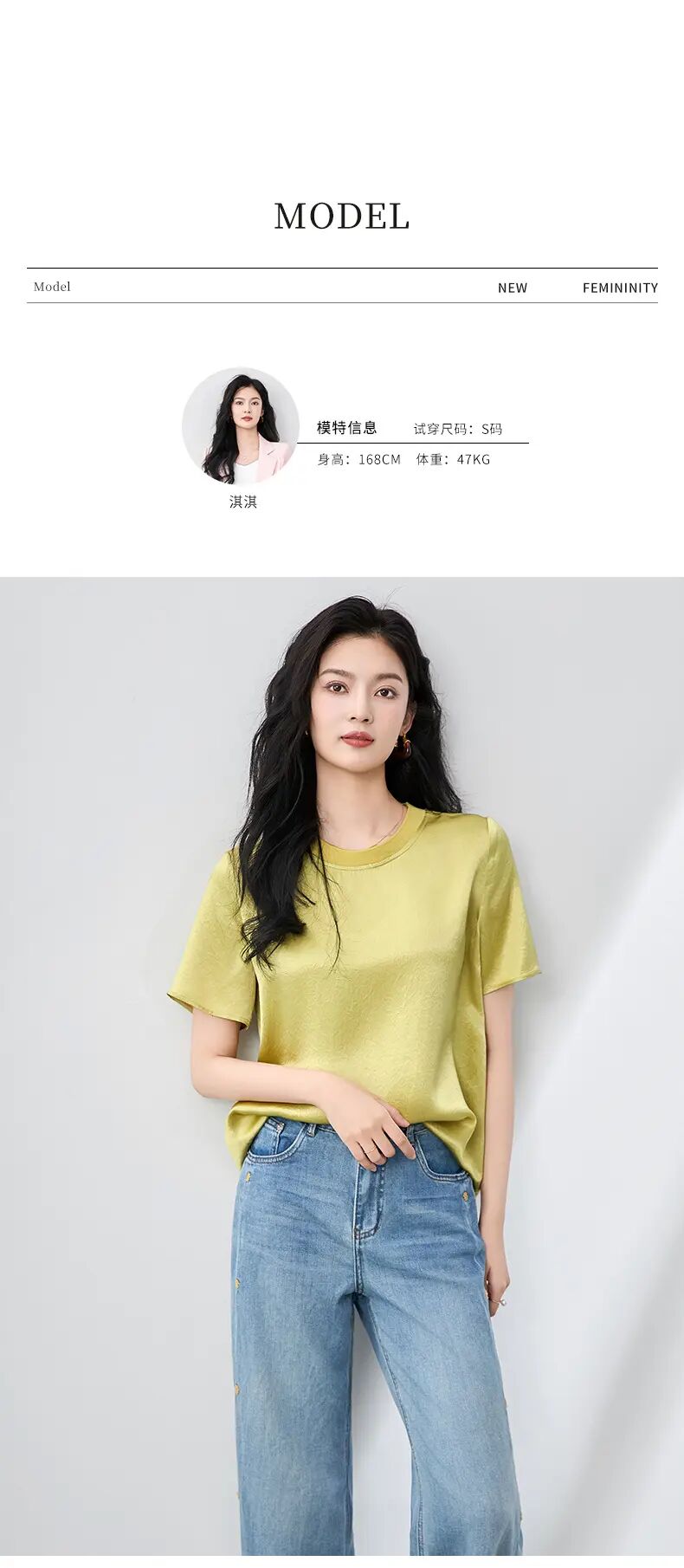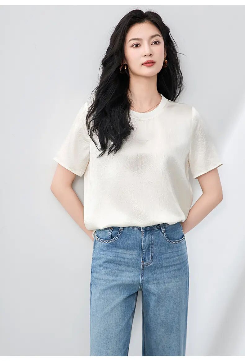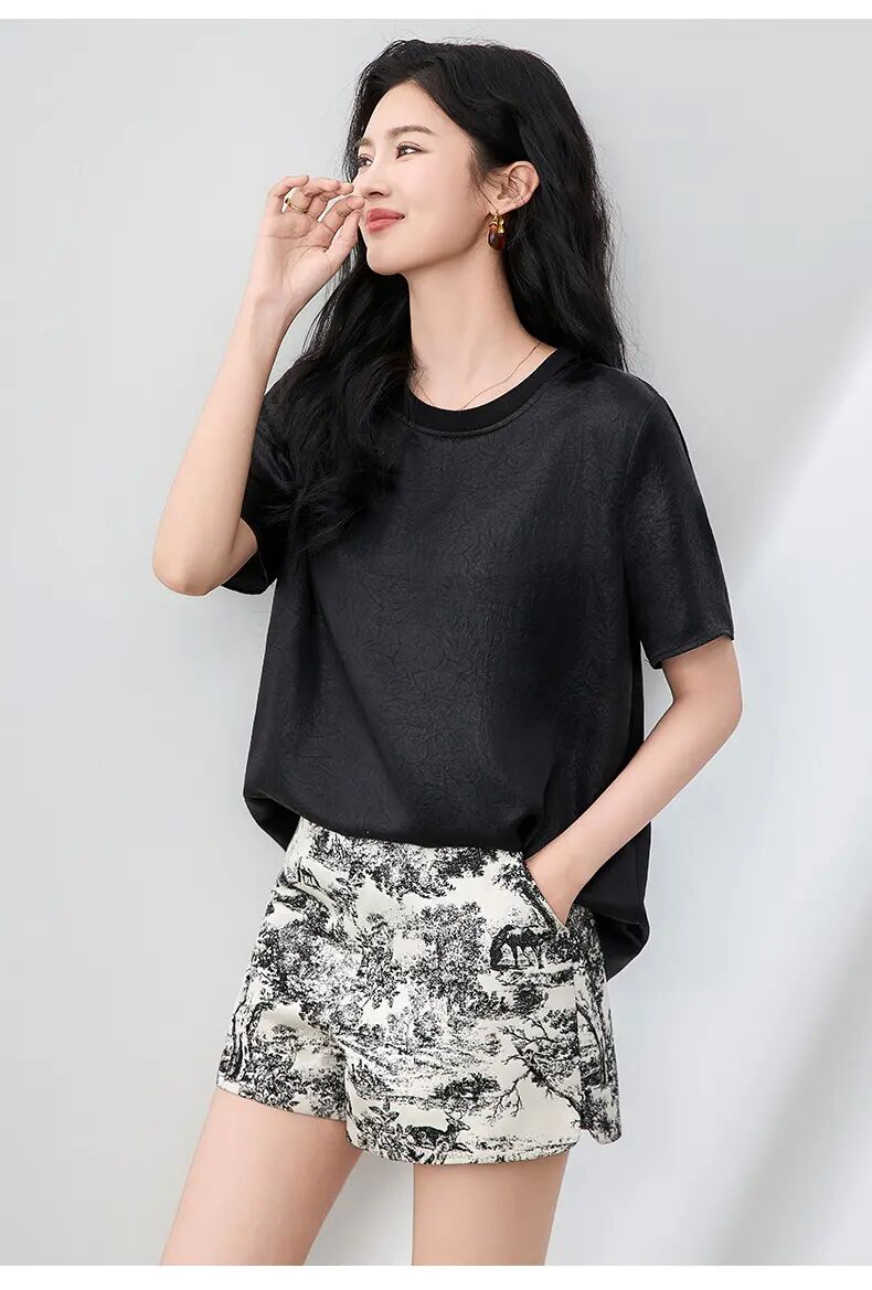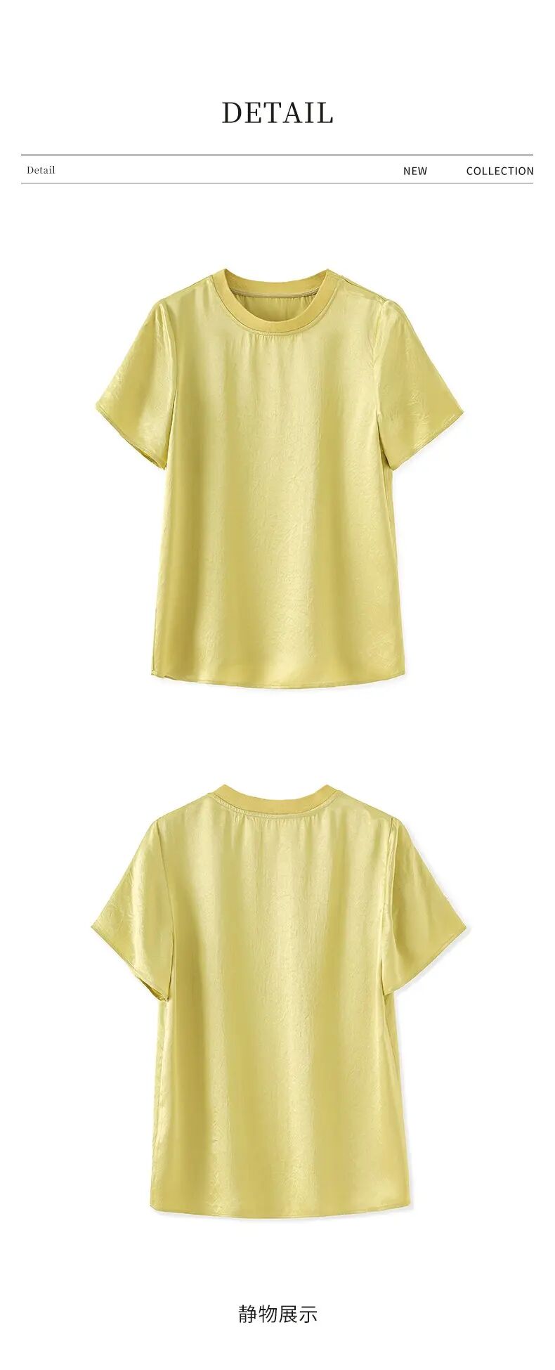 【高货wl】全新升级【铂金会员211/天猫279/差价68】(94632) 洛诗琳女夏新款时尚宽松凉感抓绉醋酸缎面T恤简约短袖上衣