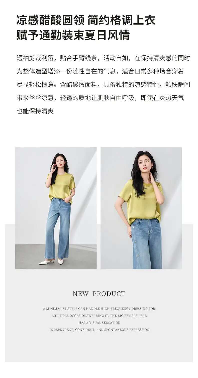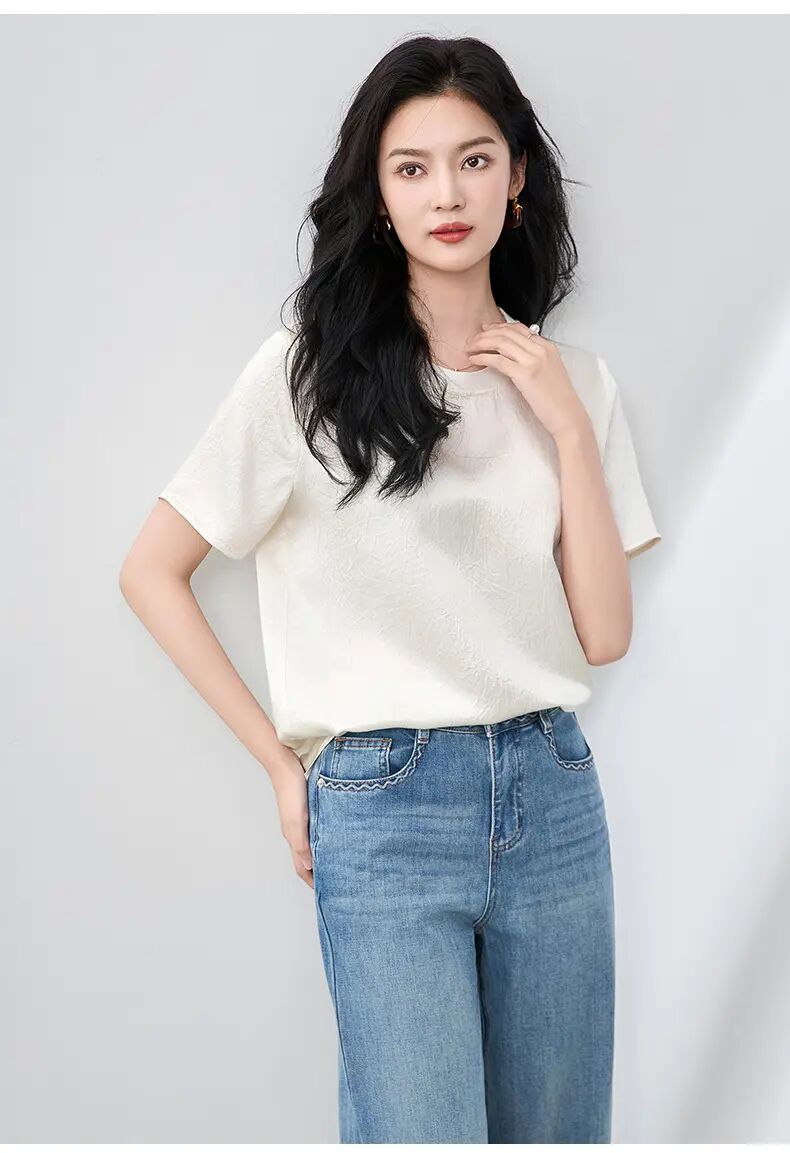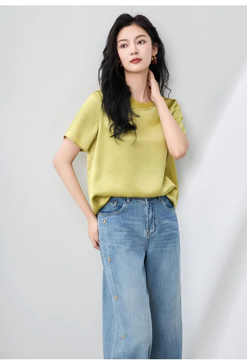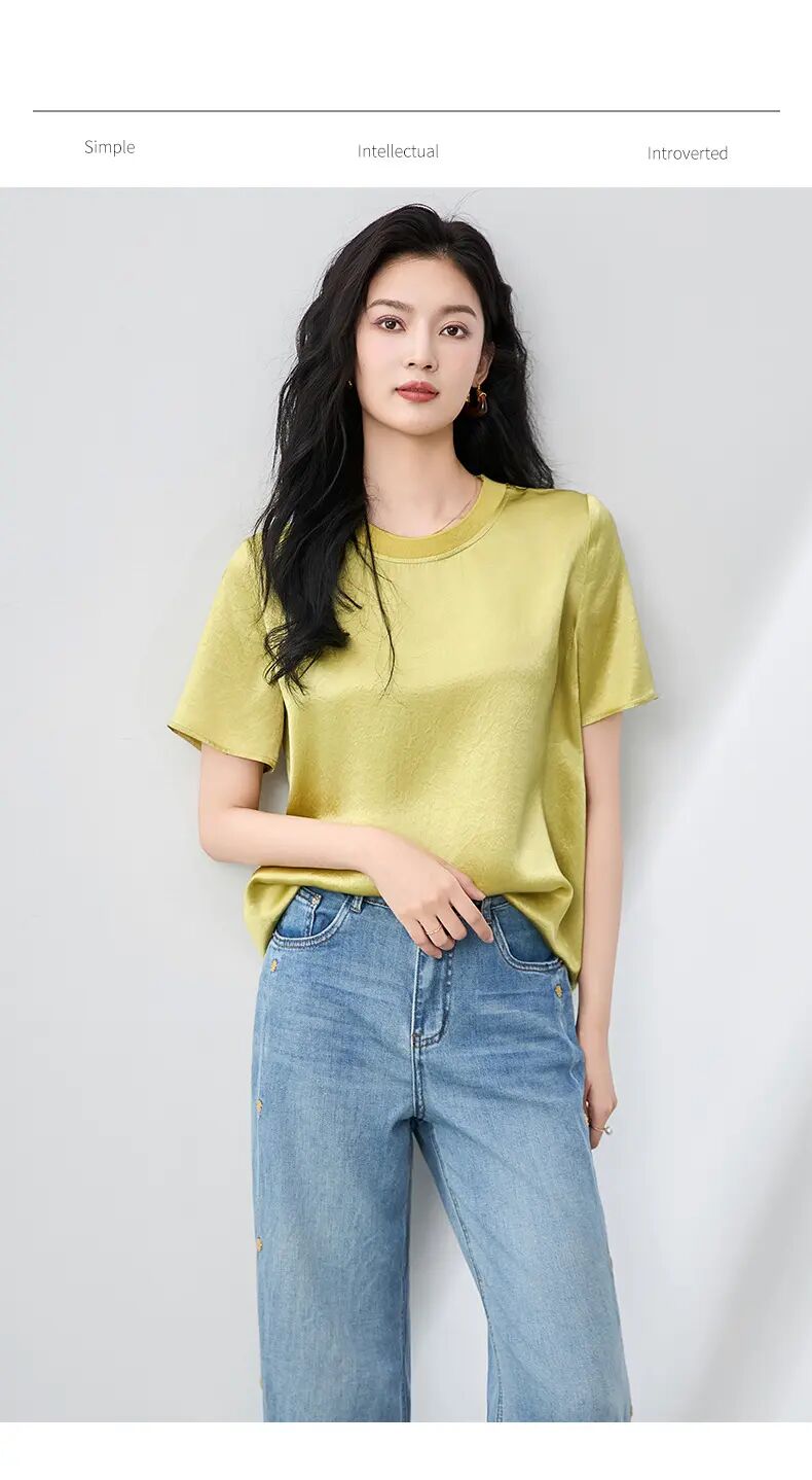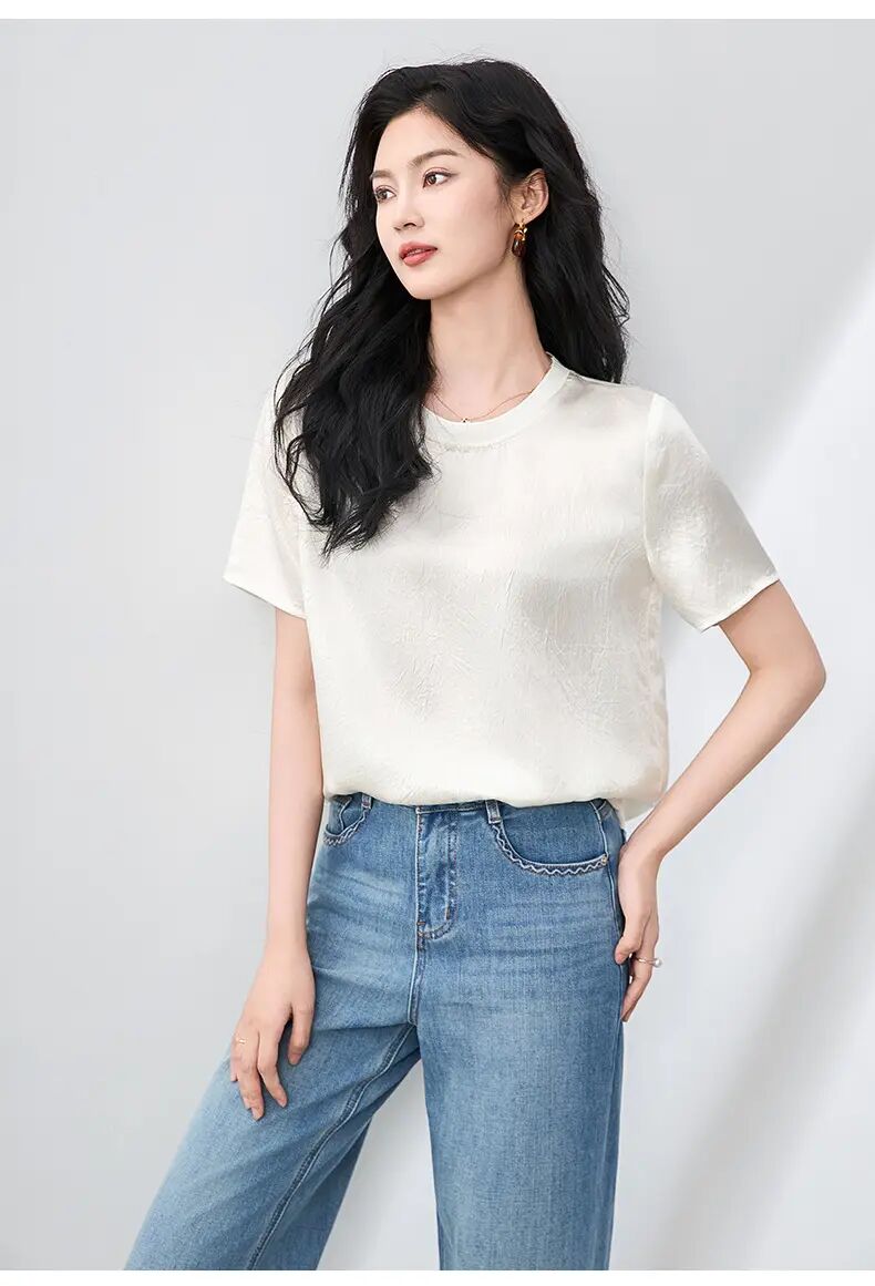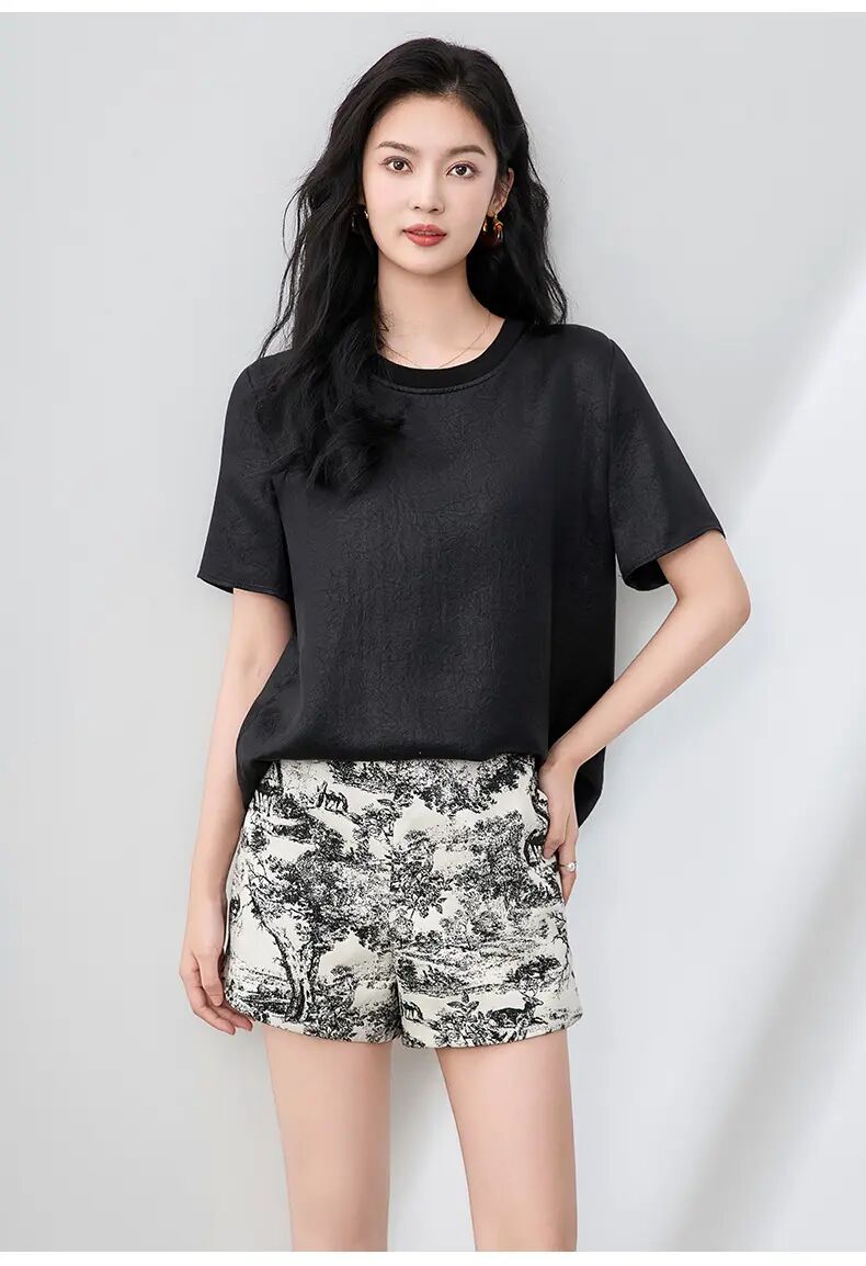 【高货wl】全新升级【铂金会员211/天猫279/差价68】(94632) 洛诗琳女夏新款时尚宽松凉感抓绉醋酸缎面T恤简约短袖上衣