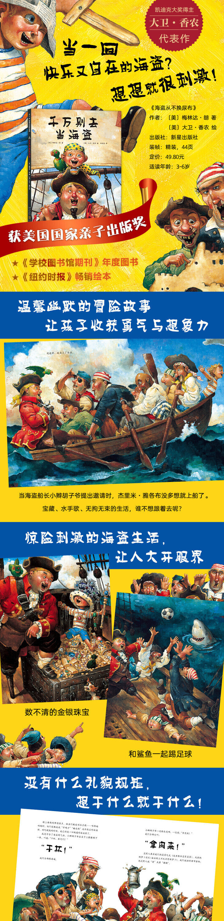 2.故事充满诙谐的元素,尤其是船长的小辫胡子和海盗们的附和声,大写的粗体很适合朗读。从海盗滑稽的绿色牙齿,到汹涌的深蓝色海面,幽默夸张,细节满满。——《书单》