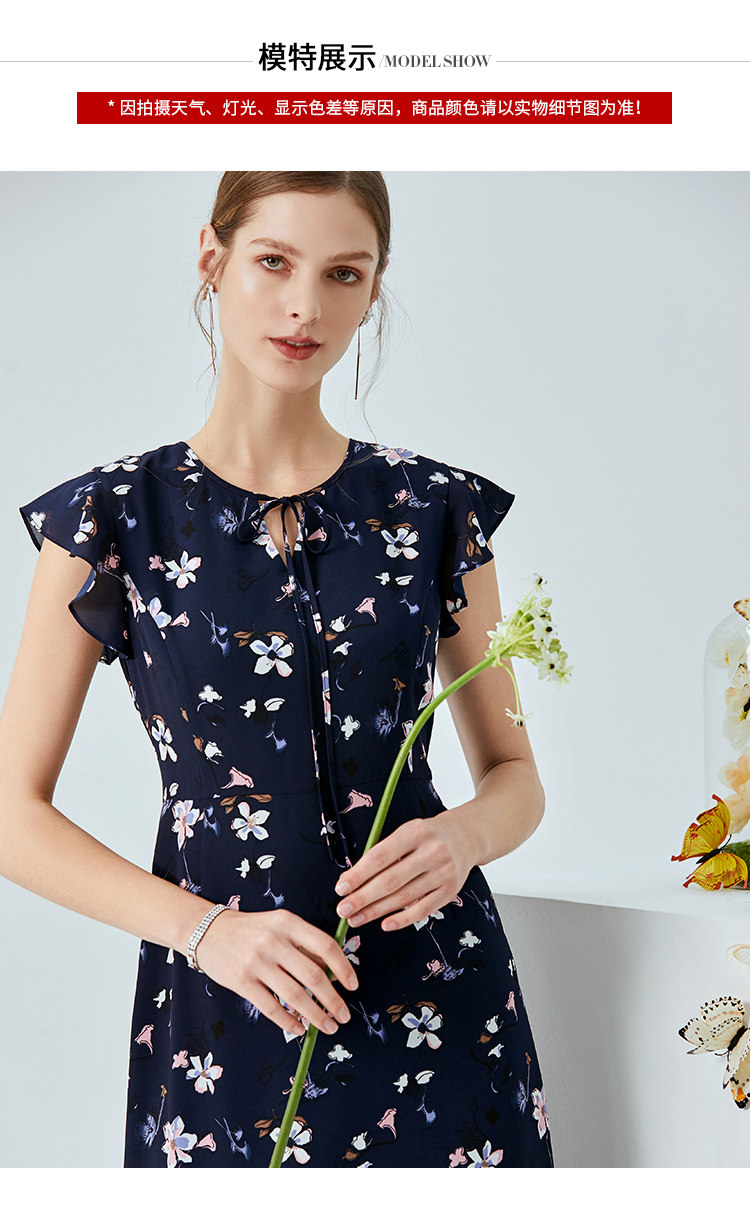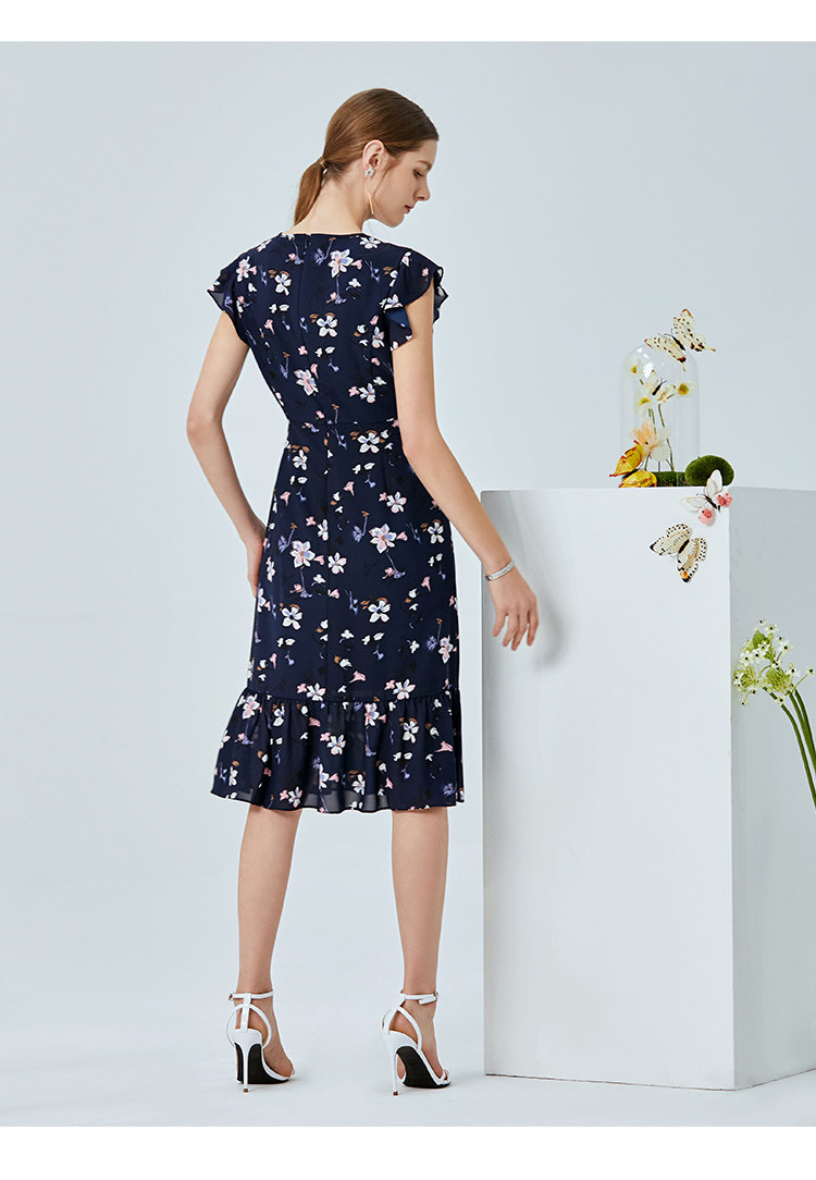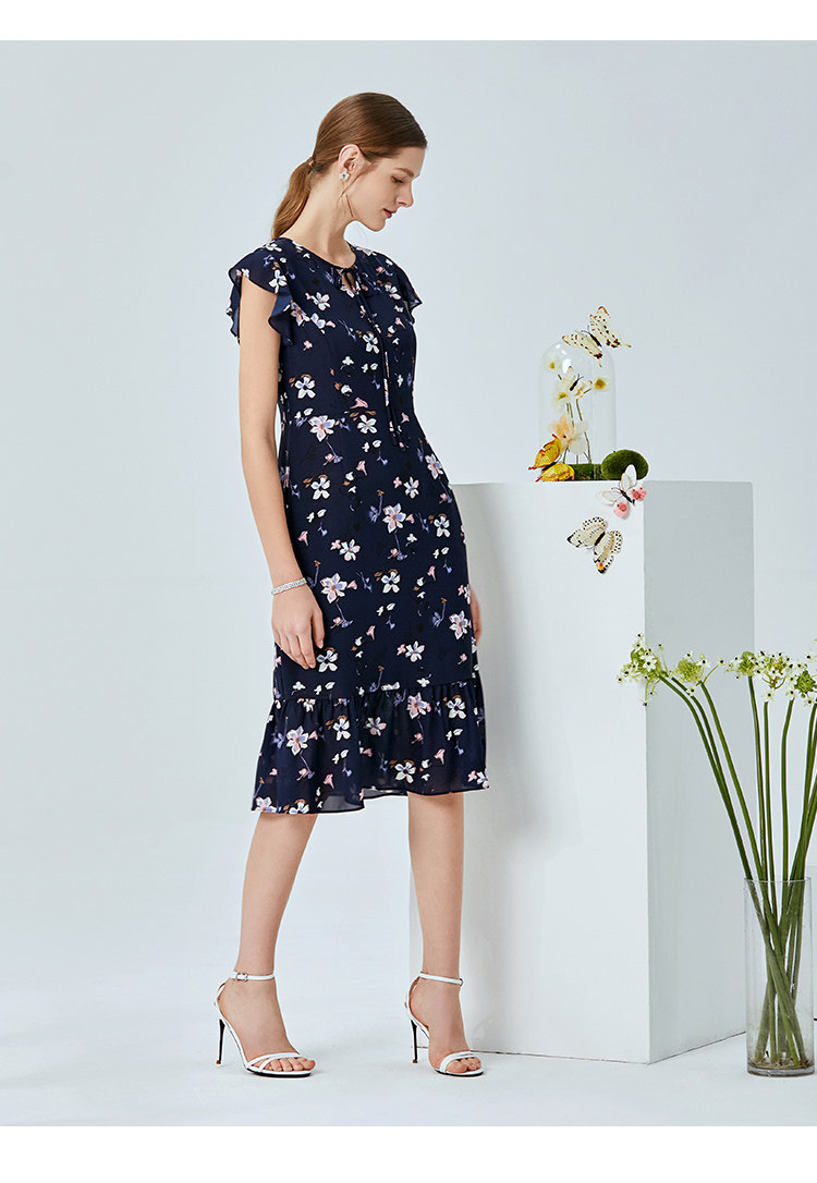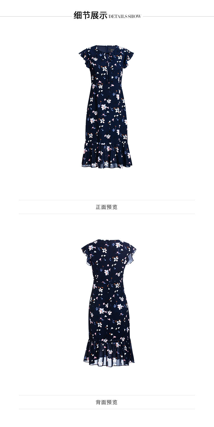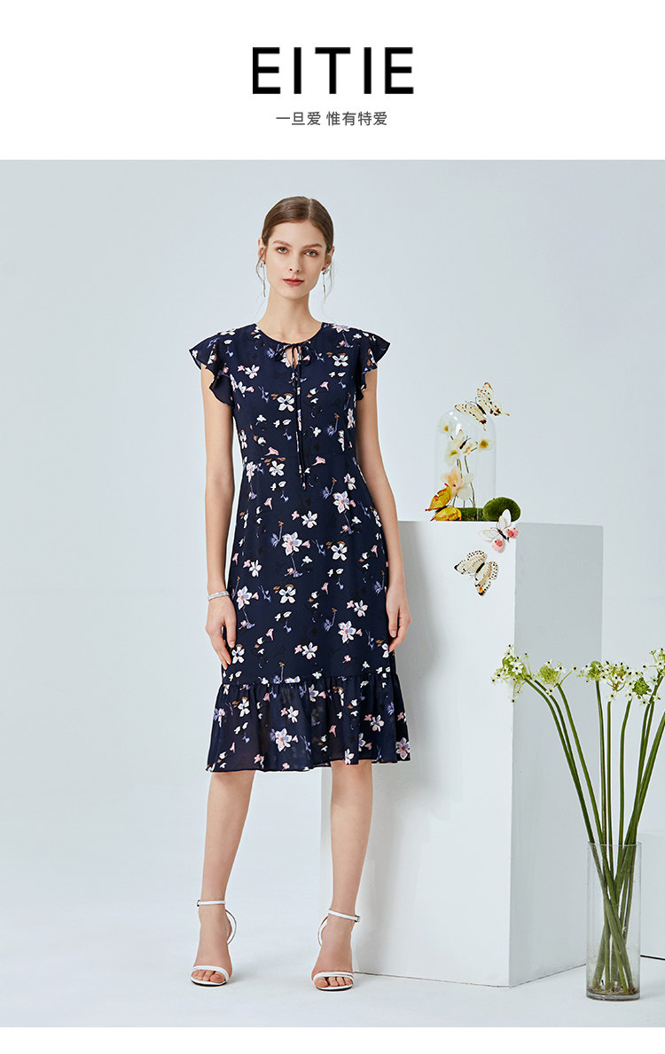 EITIE爱特爱夏季新款时尚飞飞袖系带收腰鱼尾印花连衣裙B2007440