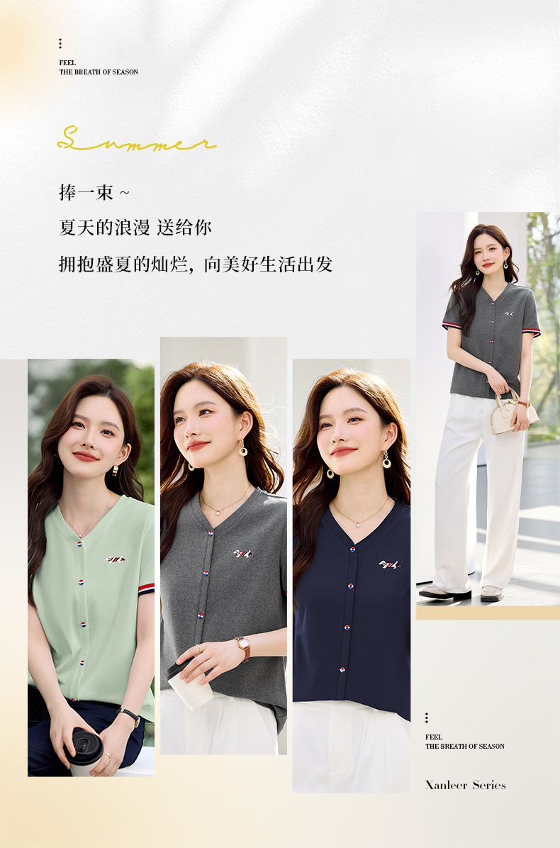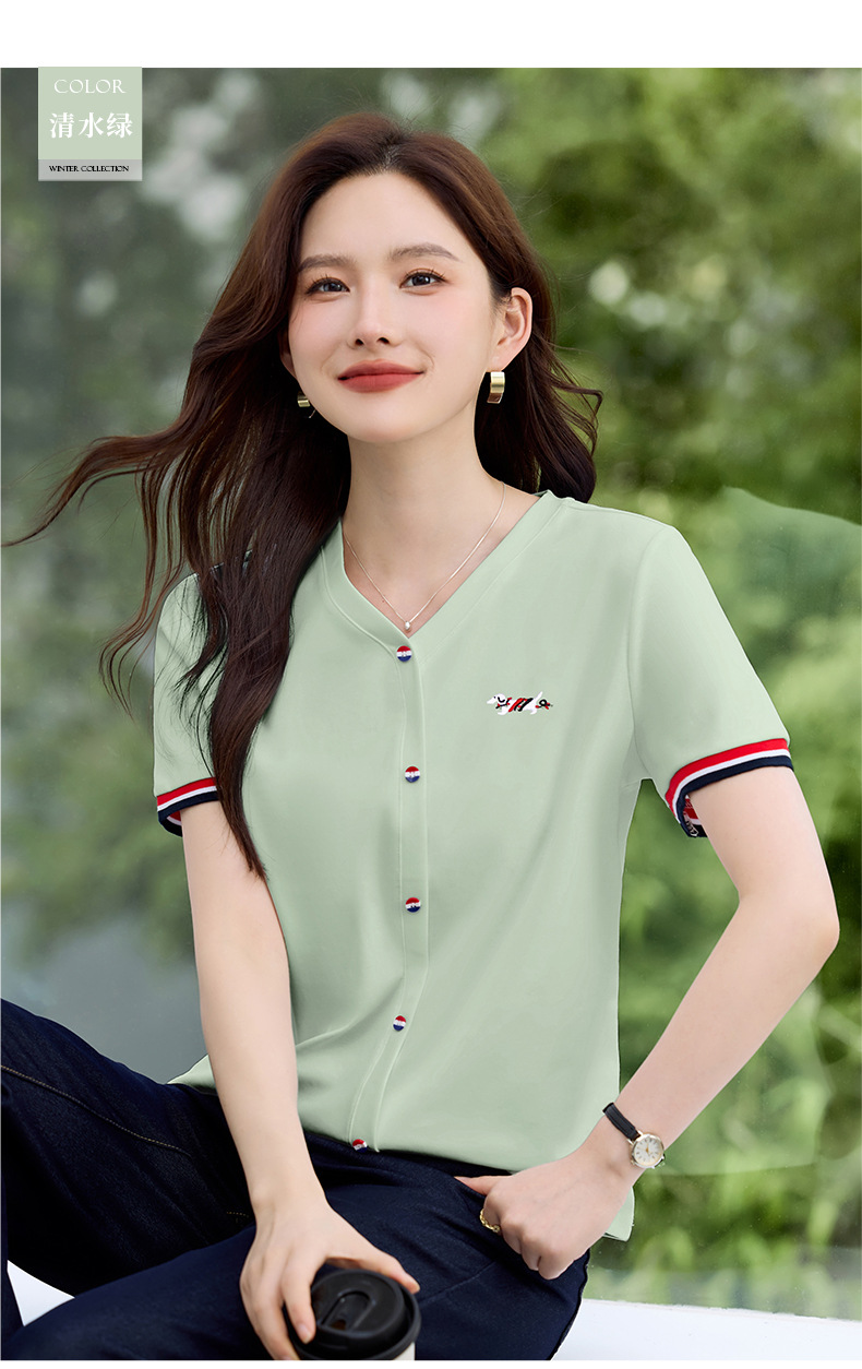 丁摩 【断码清仓】100%桑蚕丝V领真丝针织短袖T恤2039WX001