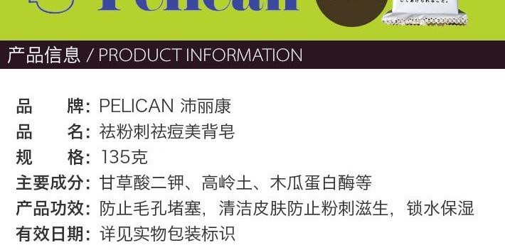 【门店直发】PELICAN 沛丽康 qu粉刺qu痘美背皂 135g