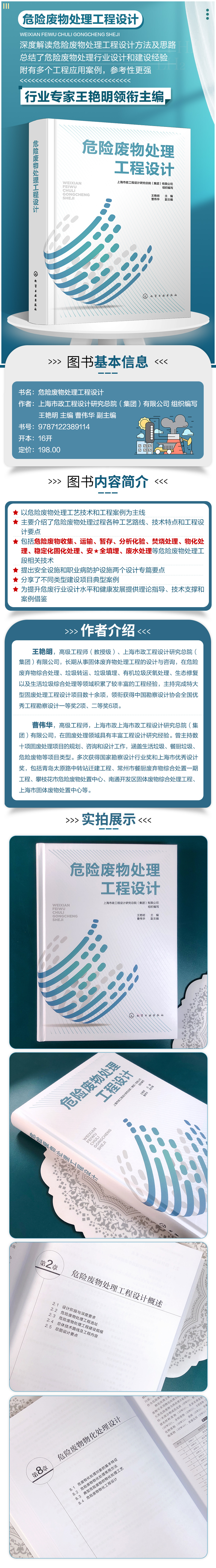 本书以危险废物处理工艺技术和工程案例为主线,主要介绍了危险废物处理过程各种工艺路线、技术特点和工程设计要点,包括危险废物收集、运输、暂存、分析化验、焚烧处理、物化处理、稳定化固化处理、安全填埋、废水处理等危险废物处理工段,提出安全设施和职业病防护设施两个设计专篇要点。并提供不同类型建设项目典型案例,旨在总结危险废物处理行业设计和建设经验,为提升行业从业人员技术能力,促进行业设计建设水平和健康发展提供理论指导、技术支撑和案例借鉴。 本书具有较强的技术应用性和针对性,可供从事危险废物处理处置及污染控制的工程技术人员、科研人员及环境管理人员参考,也可供高等学校环境科学与工程、市政工程及相关专业师生参阅。