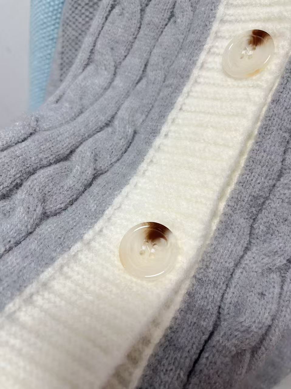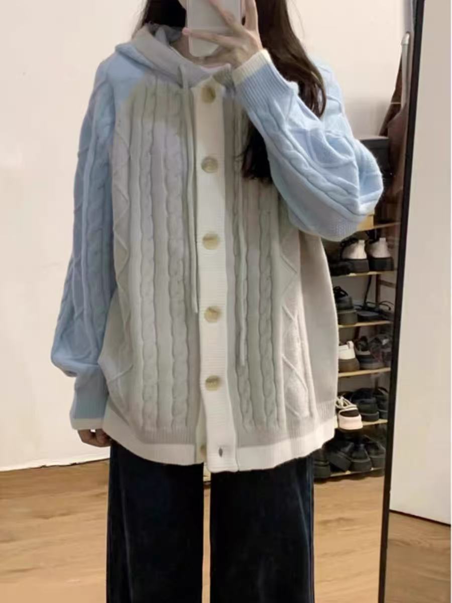 【孤品捡漏】(袖口有些脏)G20灰蓝拼色中长针织麻花连帽毛衫-喜出