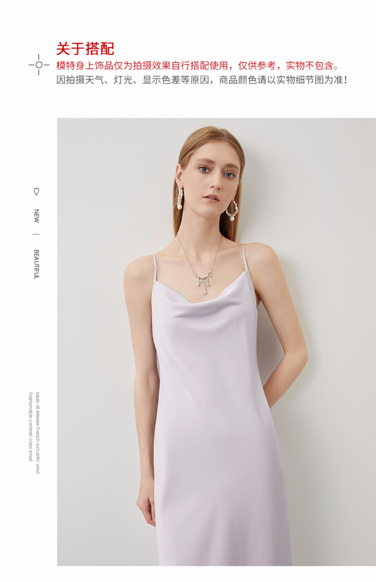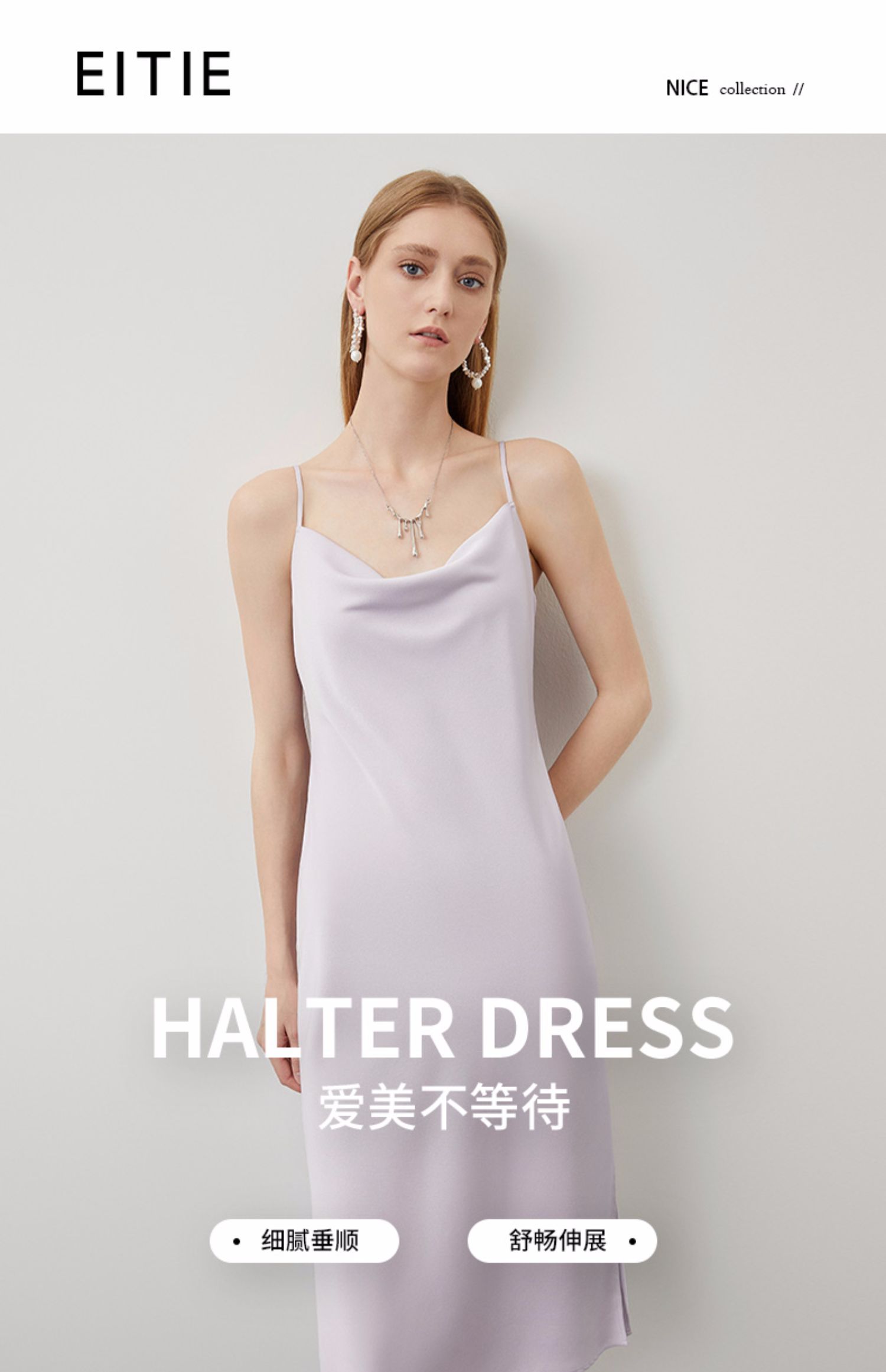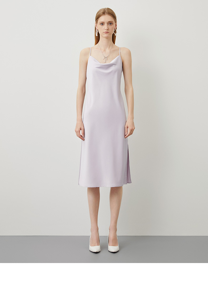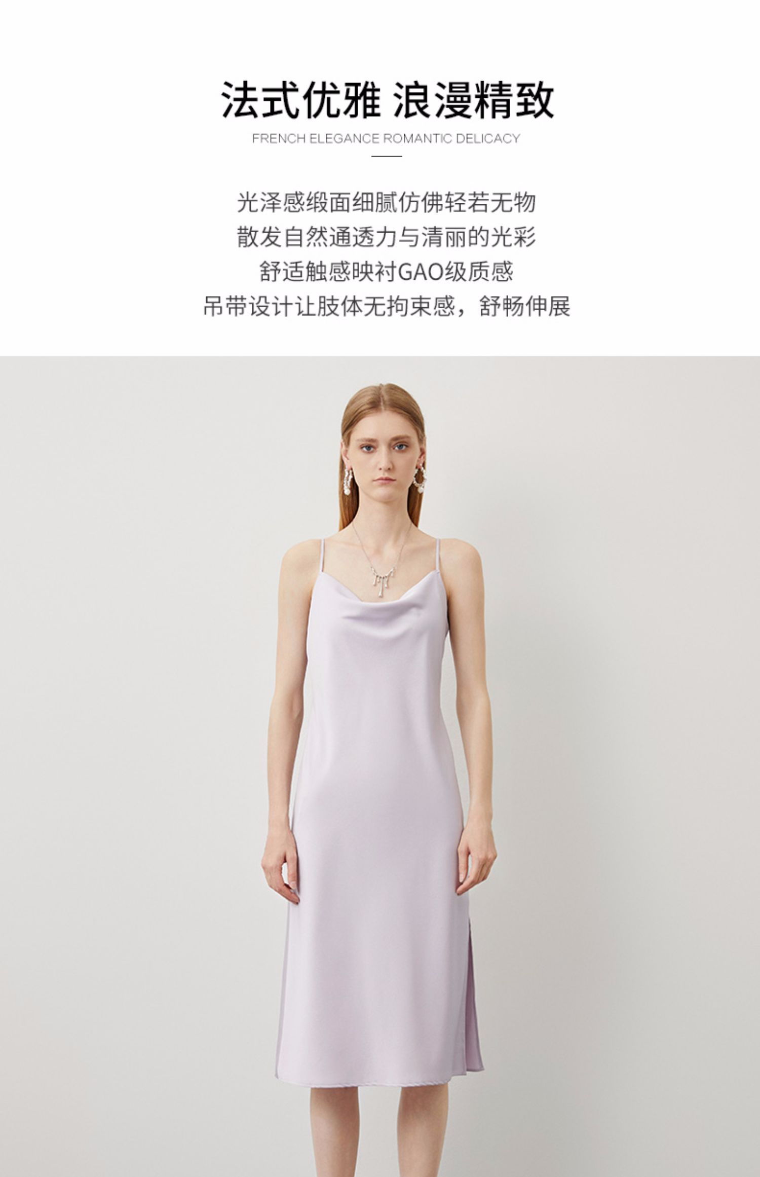 EITIE爱特爱秋季新款气质性感荡领吊带开叉缎面紫色连衣裙C2207032