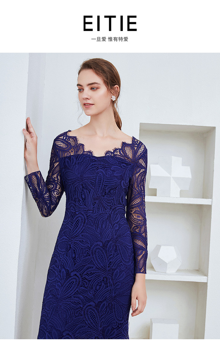 EITIE爱特爱秋季新款时尚气质V领蕾丝钩花收腰鱼尾包臀连衣裙C20075138