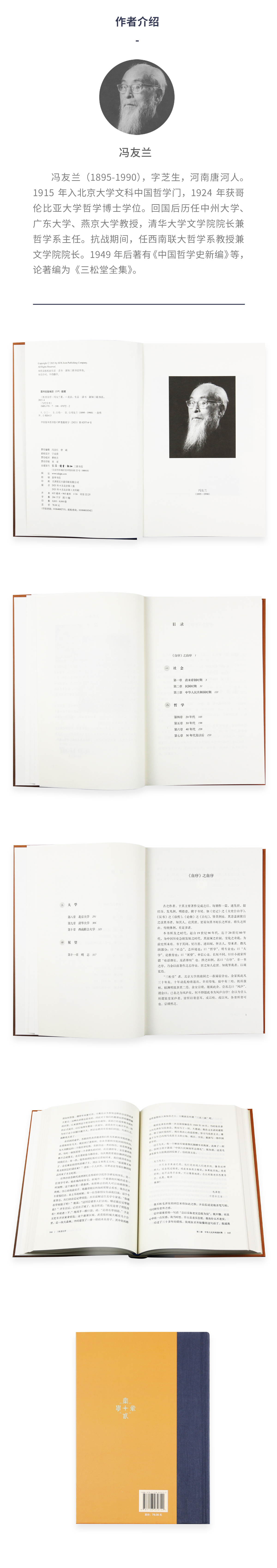 冯友兰(1895—1990),字芝生,河南唐河人。1915年入北京大学文科中国哲学门,1924年获哥伦比亚大学博士学位。回国后历任中州大学、广东大学、燕京大学教授,清华大学文学院院长兼哲学系主任。抗战期间,任西南联大哲学系教授兼文学院院长。1946年赴美任客座教授。1947年任清华大学校务会议主席。曾获美国普林斯顿大学、印度德里大学、美国哥伦比亚大学名誉博士学位。1952年后为北京大学哲学系教授、中科院哲学社会科学部委员。