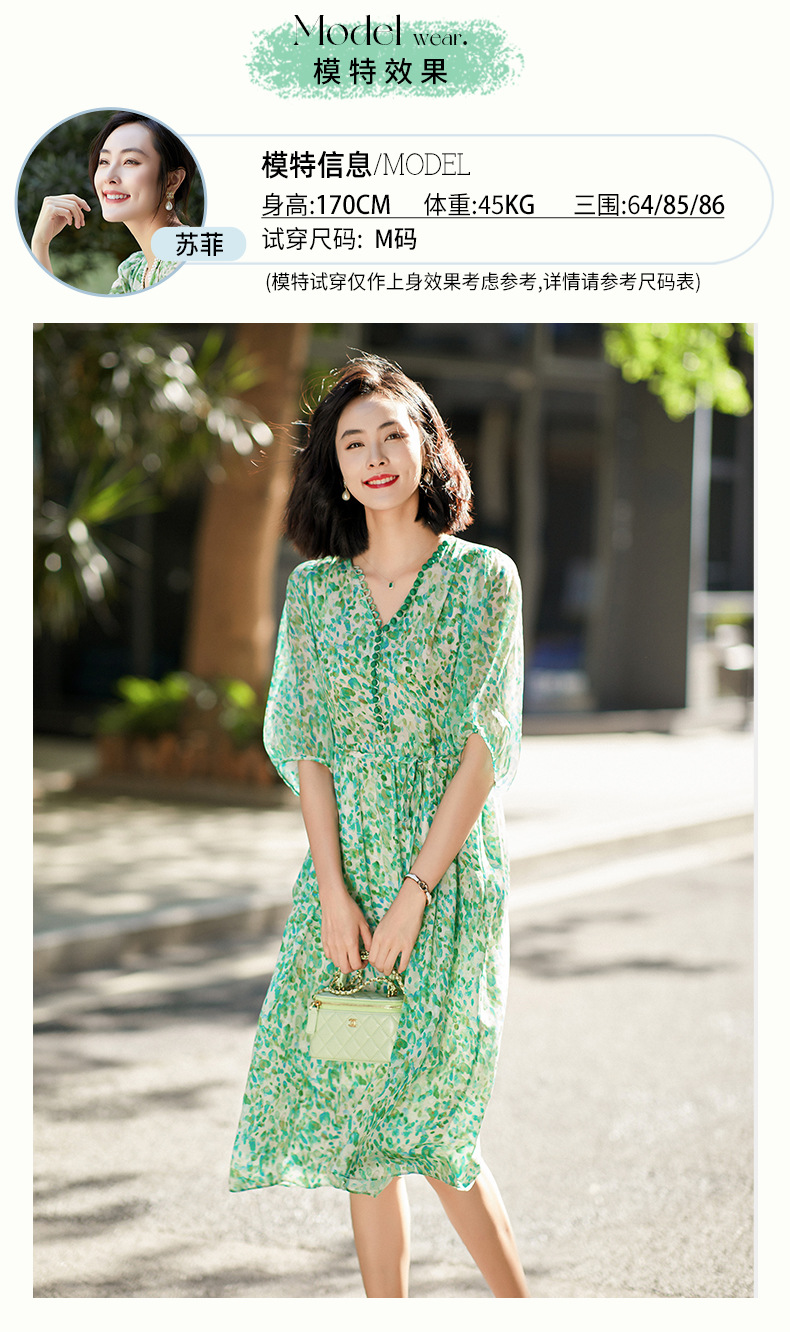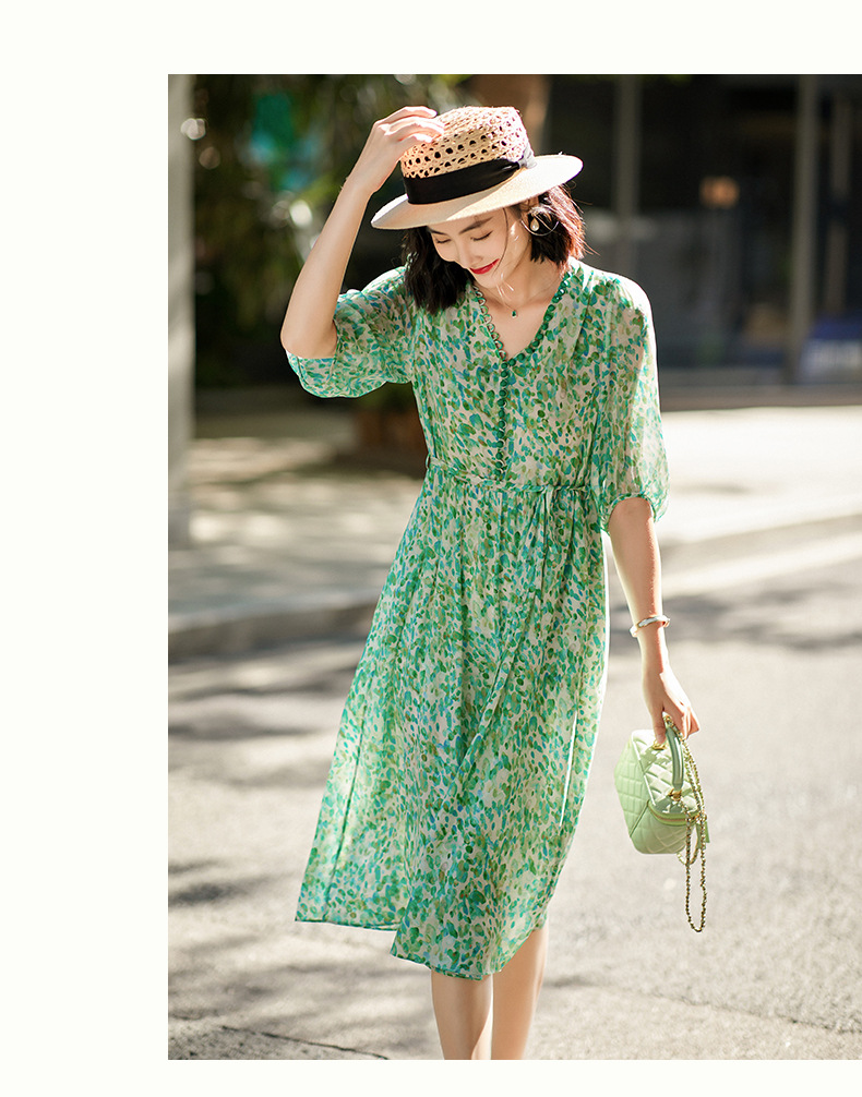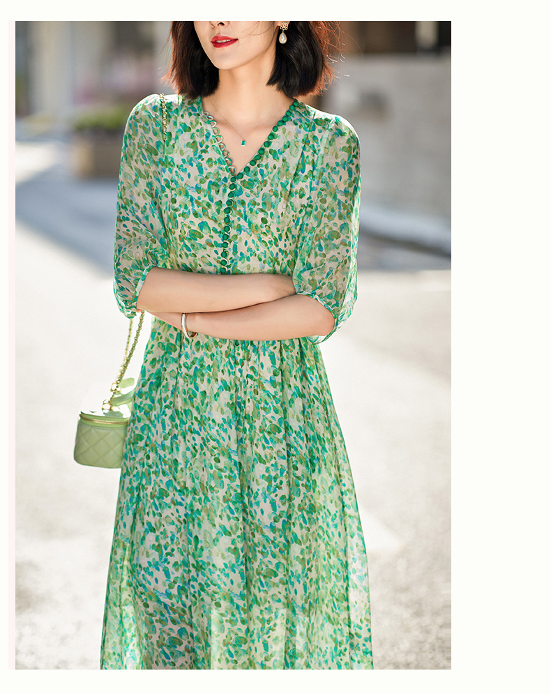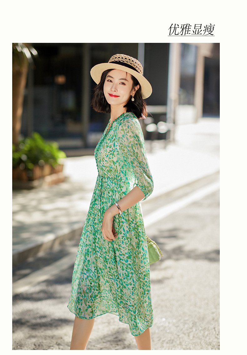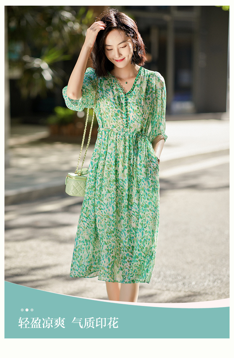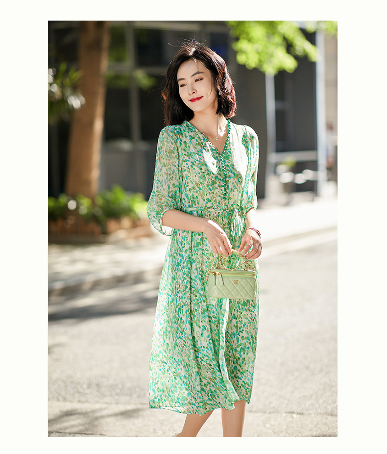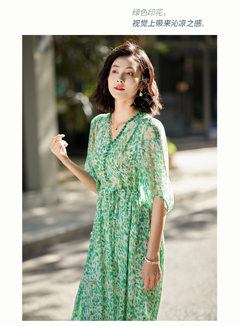 丁摩 夏季女装法式V领绿色碎花真丝中长款连衣裙子4ZF-90440