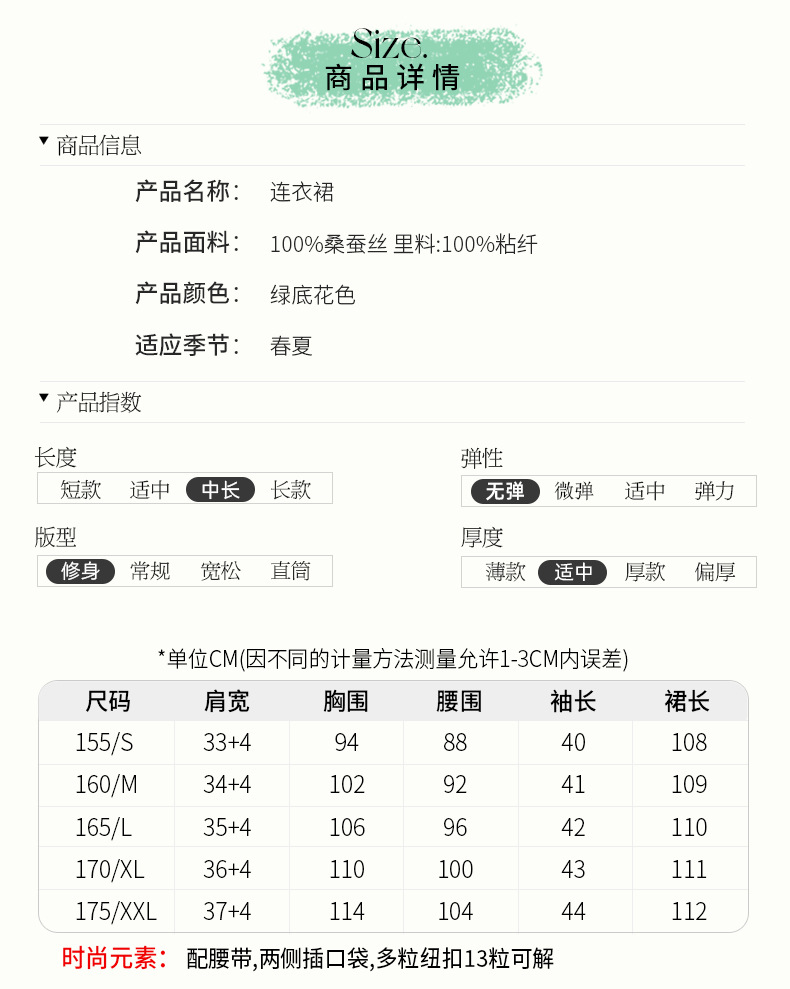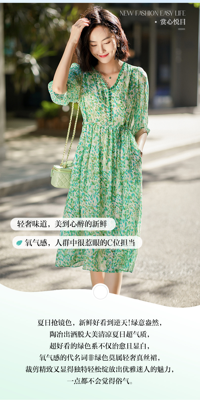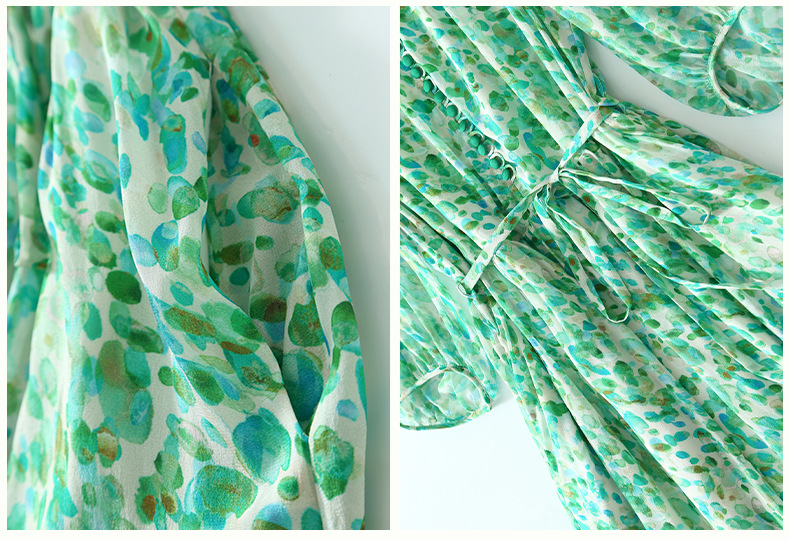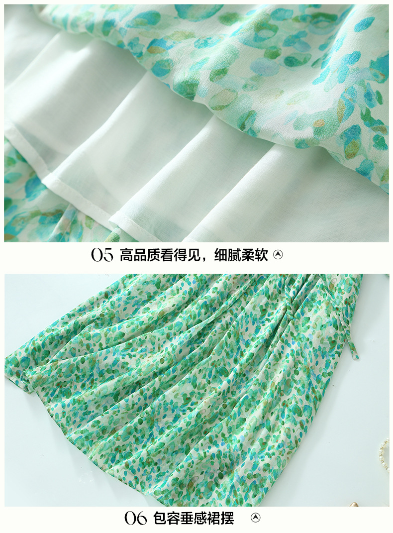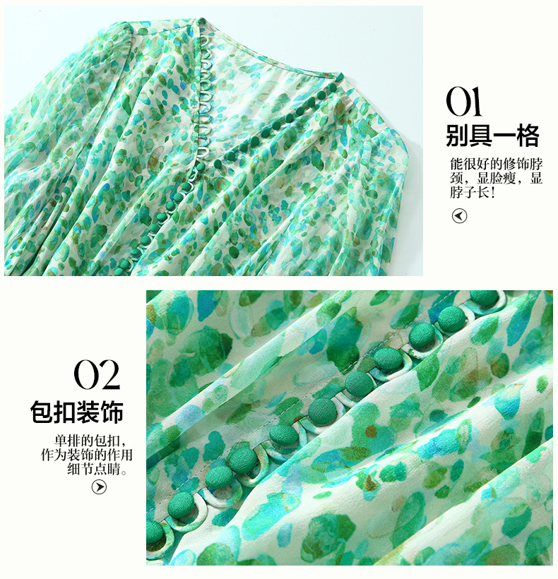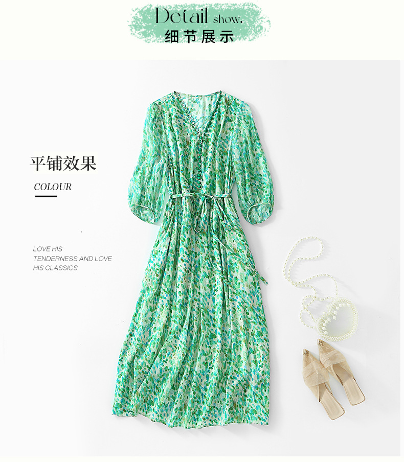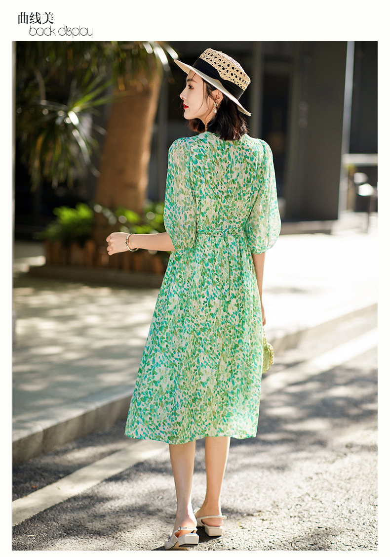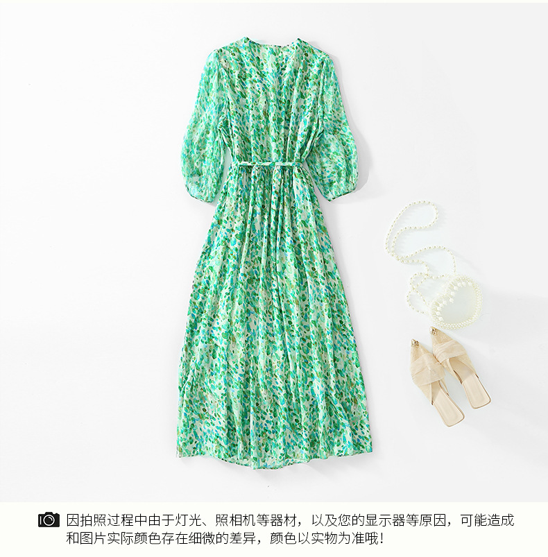 丁摩 夏季女装法式V领绿色碎花真丝中长款连衣裙子4ZF-90440