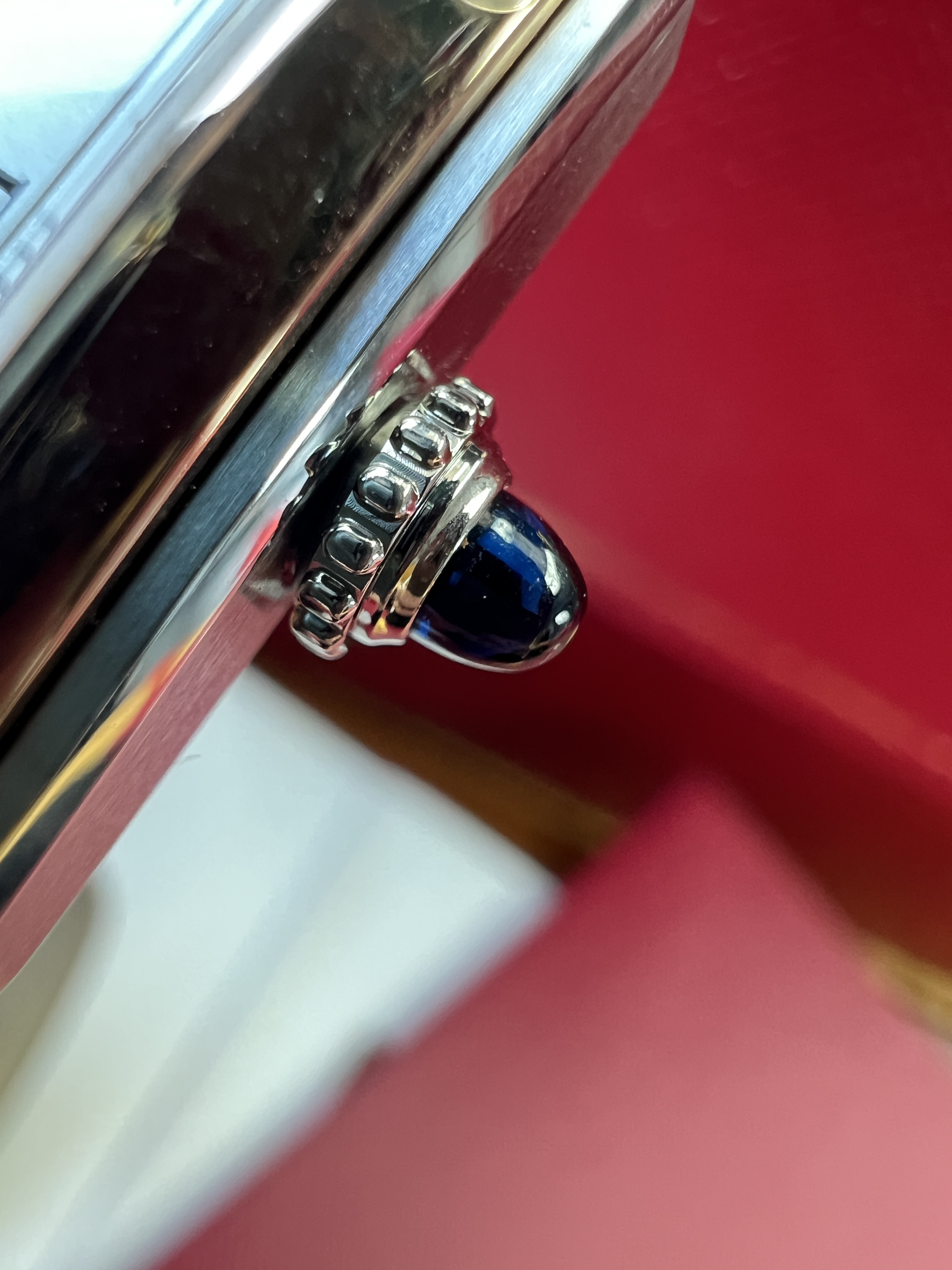 表冠是一颗蓝色天然尖晶石,搭配意大利小牛皮表带与表冠上镶嵌的蓝色圆形宝石相吻合,整体呈现儒雅、精致的绅士气质