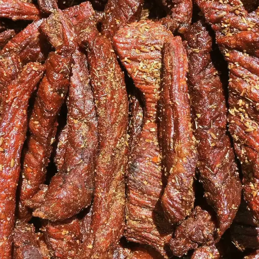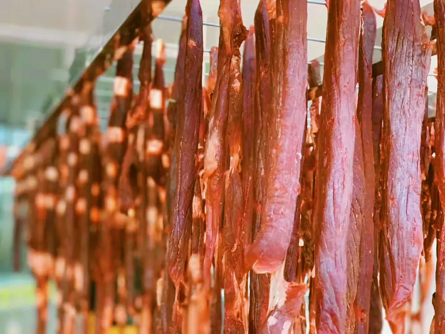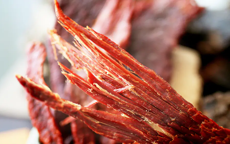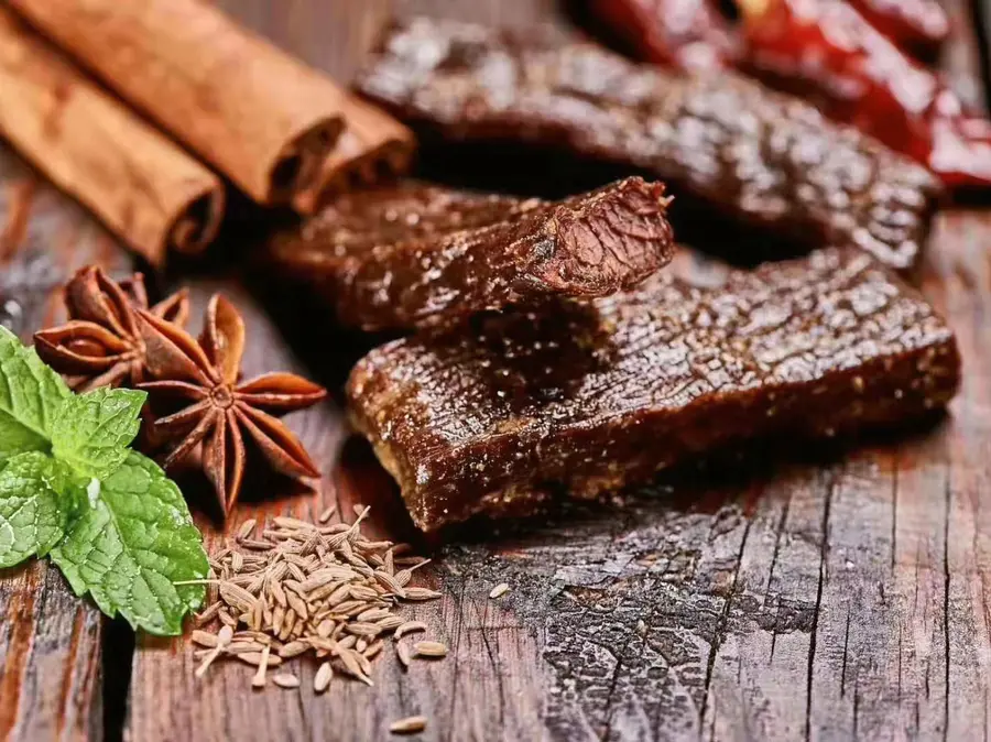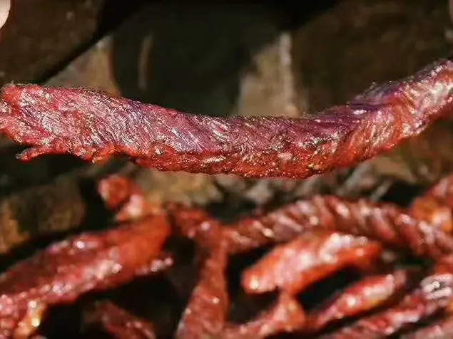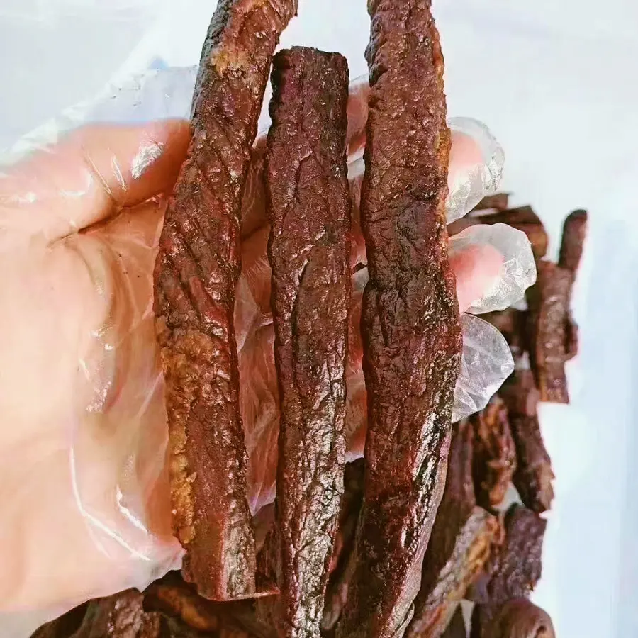 生牛肉按照牛肉纹理手工切割,用超传统的秘制配方制作出原味、孜然、香辣三种口味。