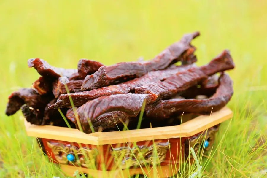 牛肉使用传统方法,仅添加食用盐进行腌制,不加任何防腐剂等,经过自然腌制与人工翻动,让牛肉充分入味。之后再进行风干,在平均湿度不到8%的干燥环境下自然风干48小时,使牛肉干充分脱水以备烘烤。最后再进行碳烤,在炭火的持续循环烘烤下,牛肉表面析出大量油脂,此时牛肉干全部熟透并且味道正佳