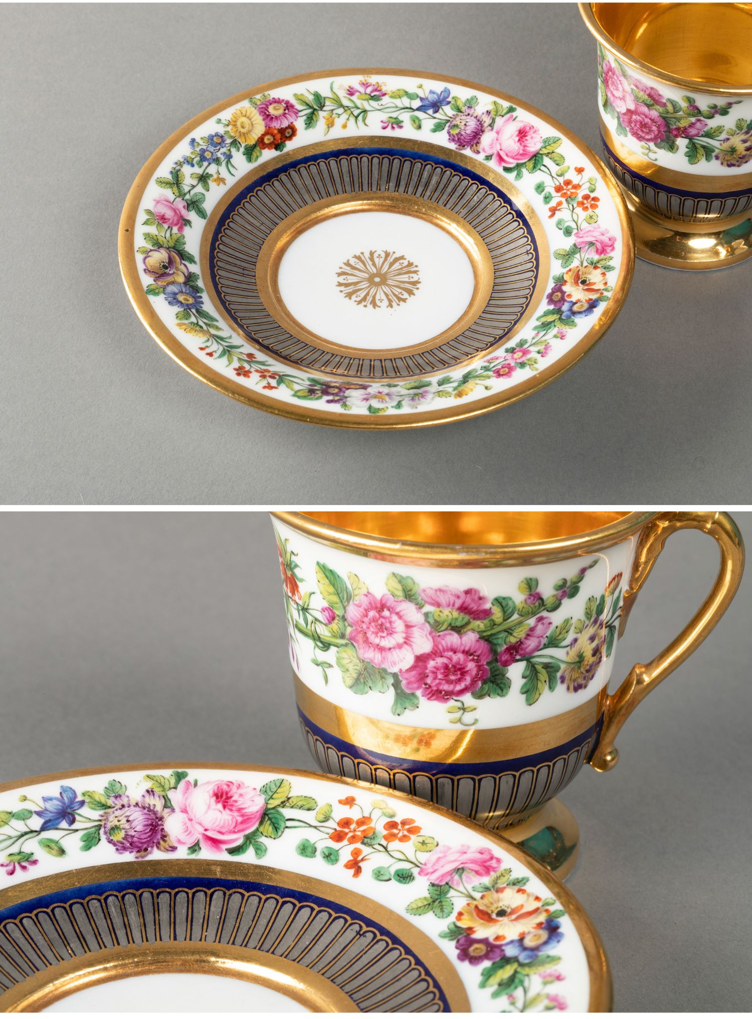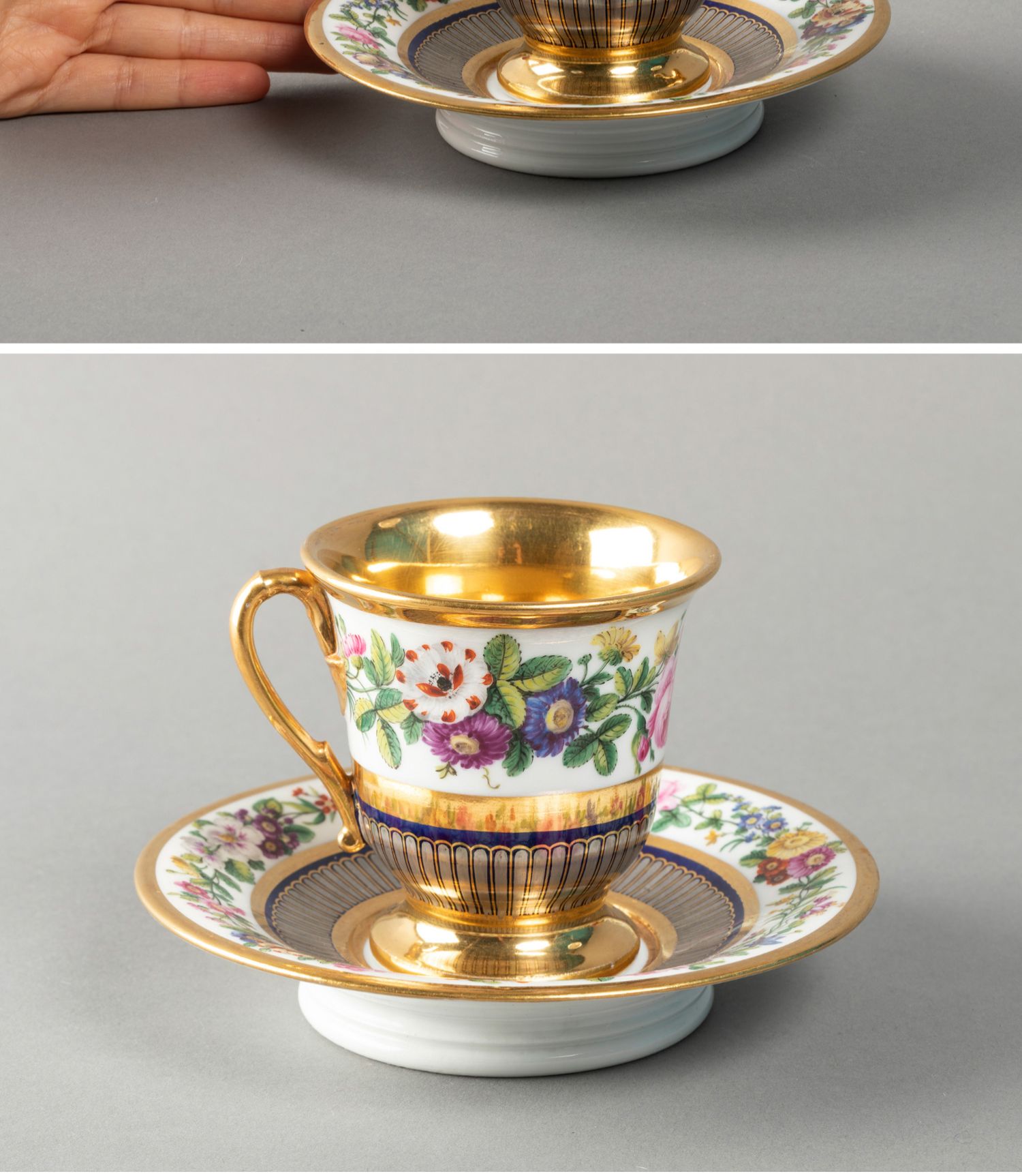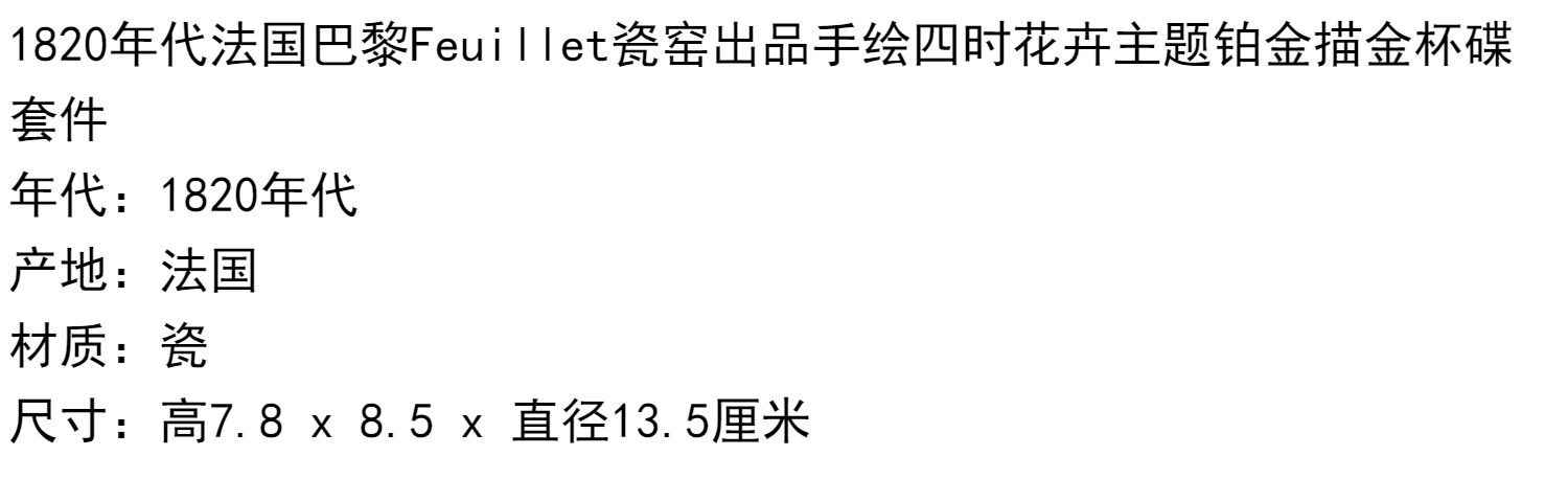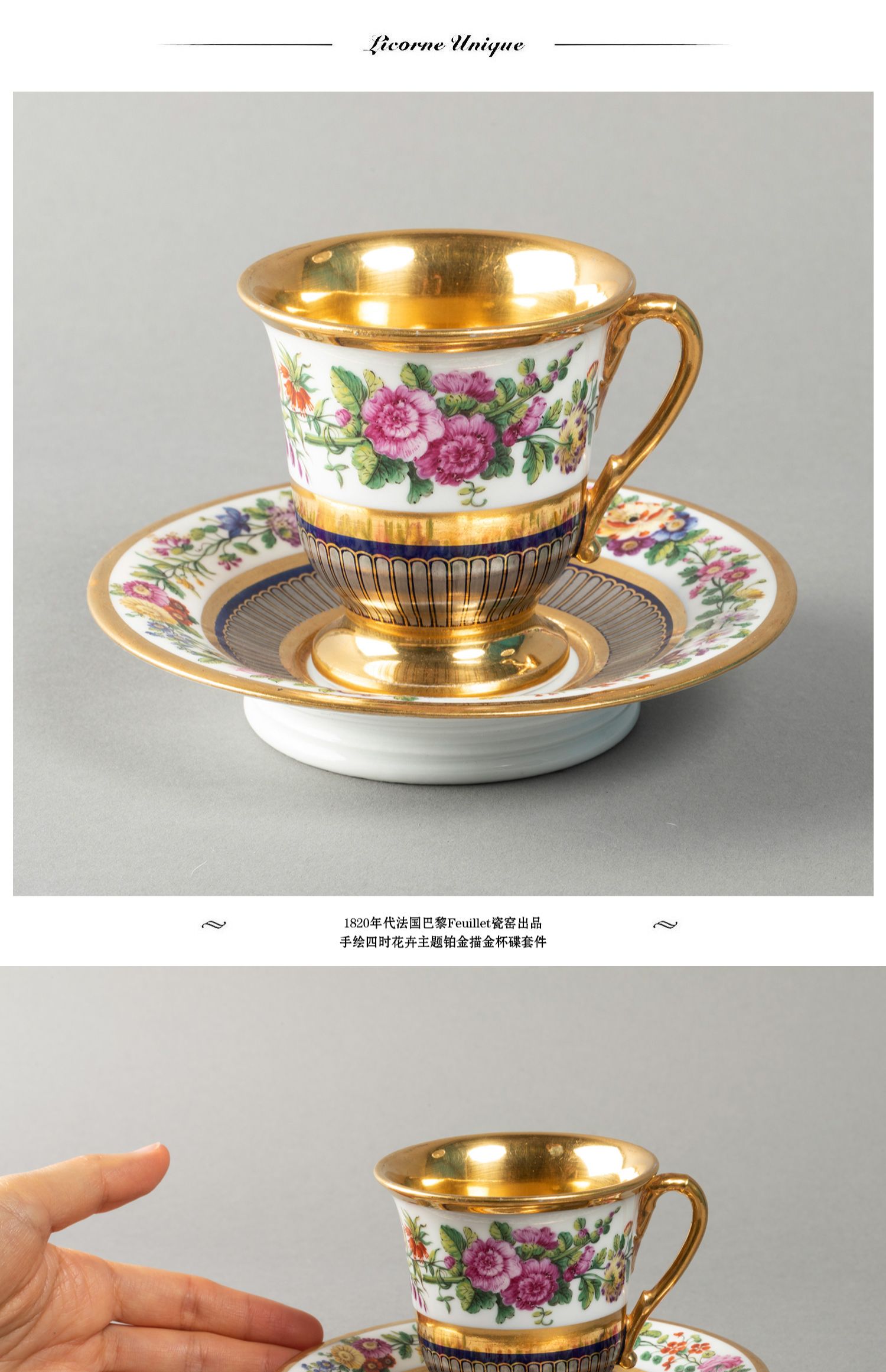 独角鹿西洋古董法国Feuillet瓷窑手绘花卉铂金描金咖啡杯碟套装