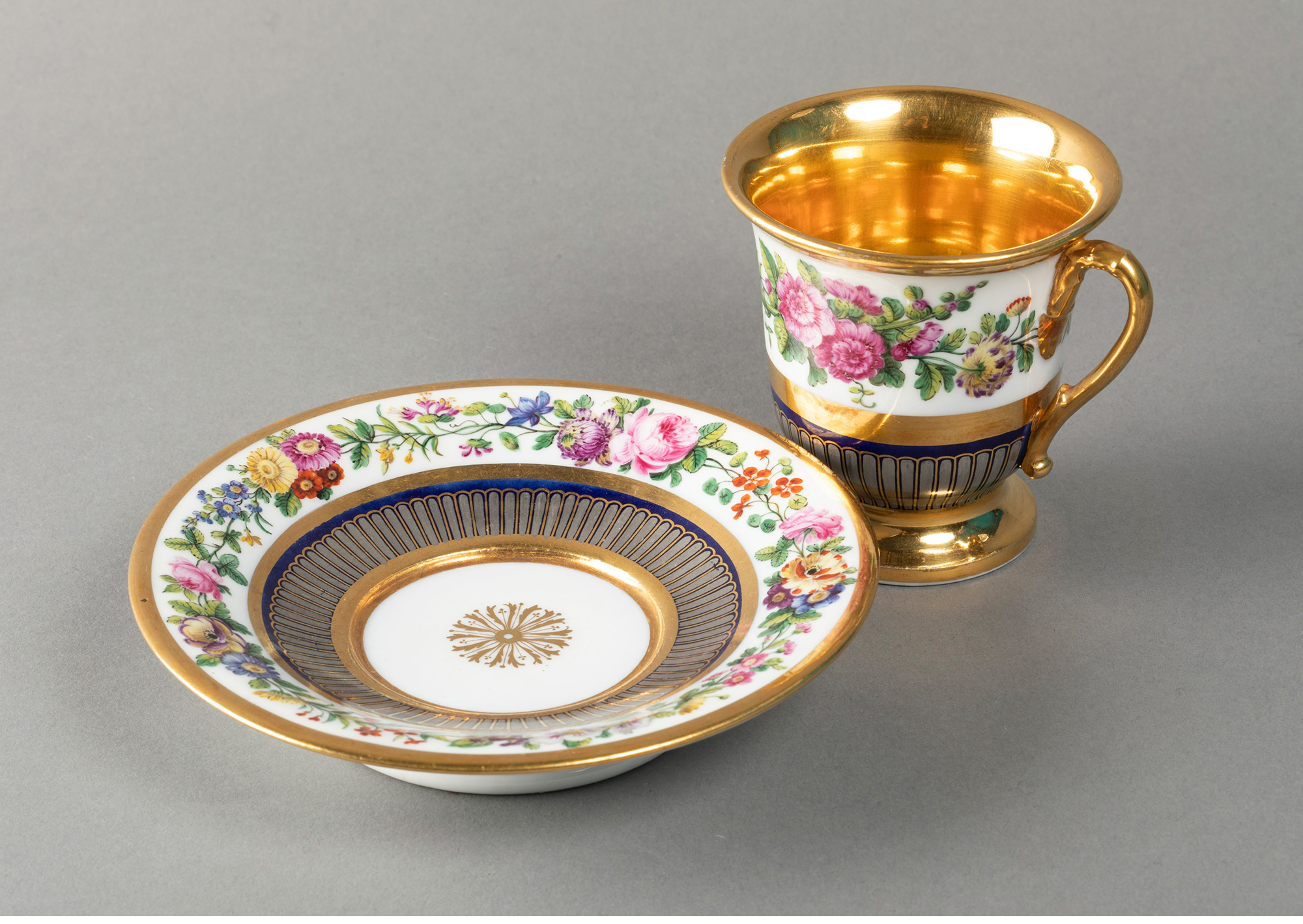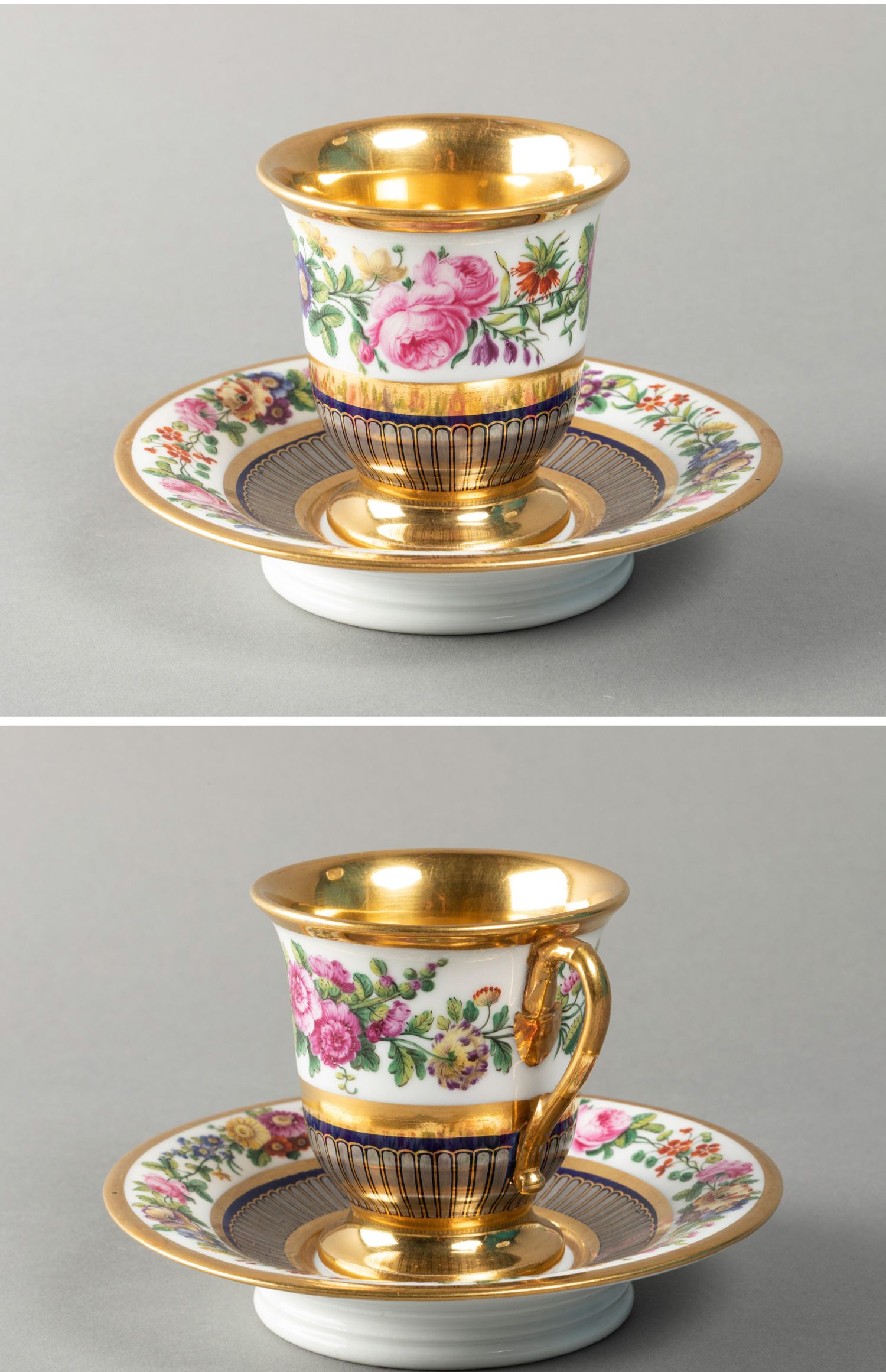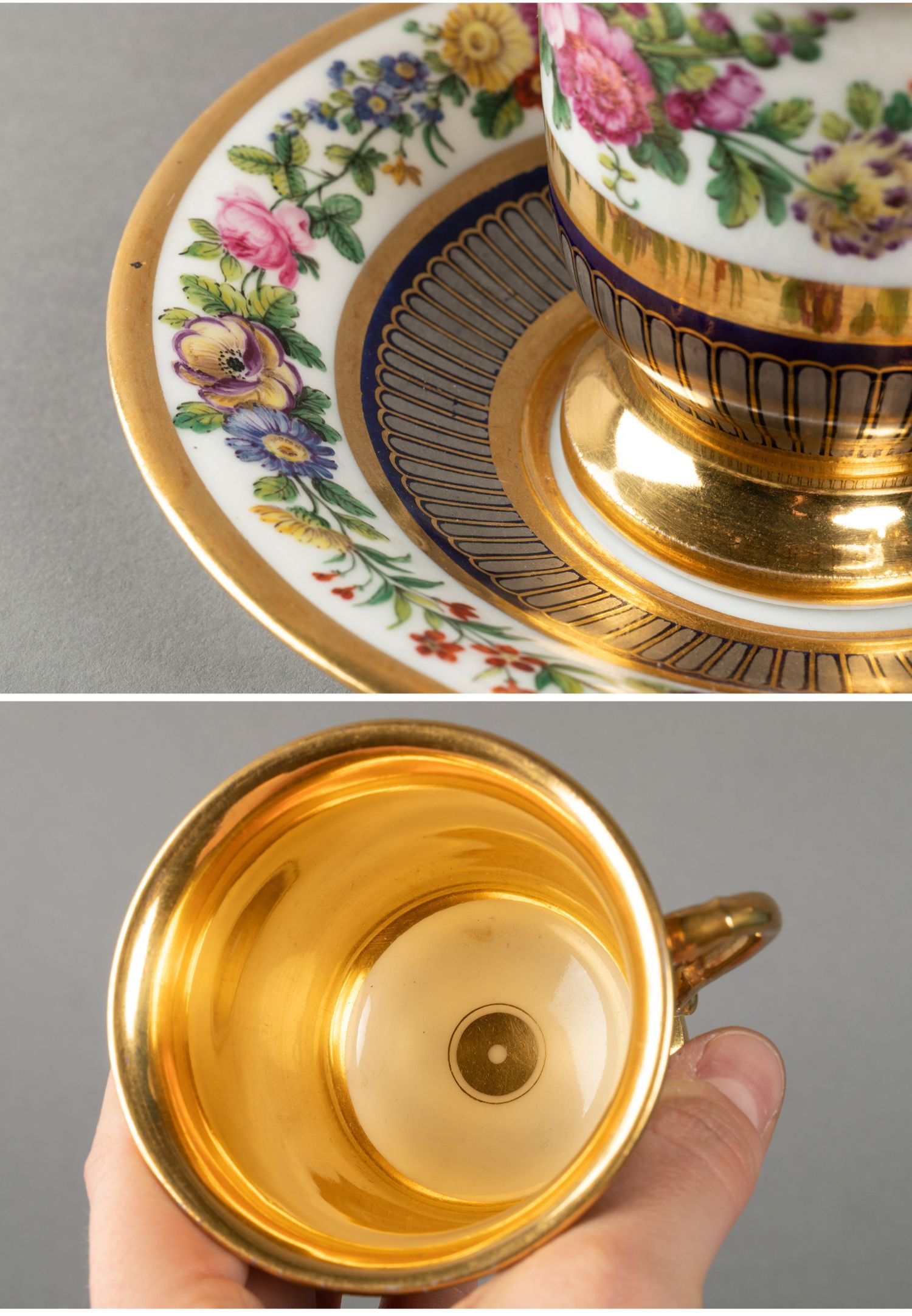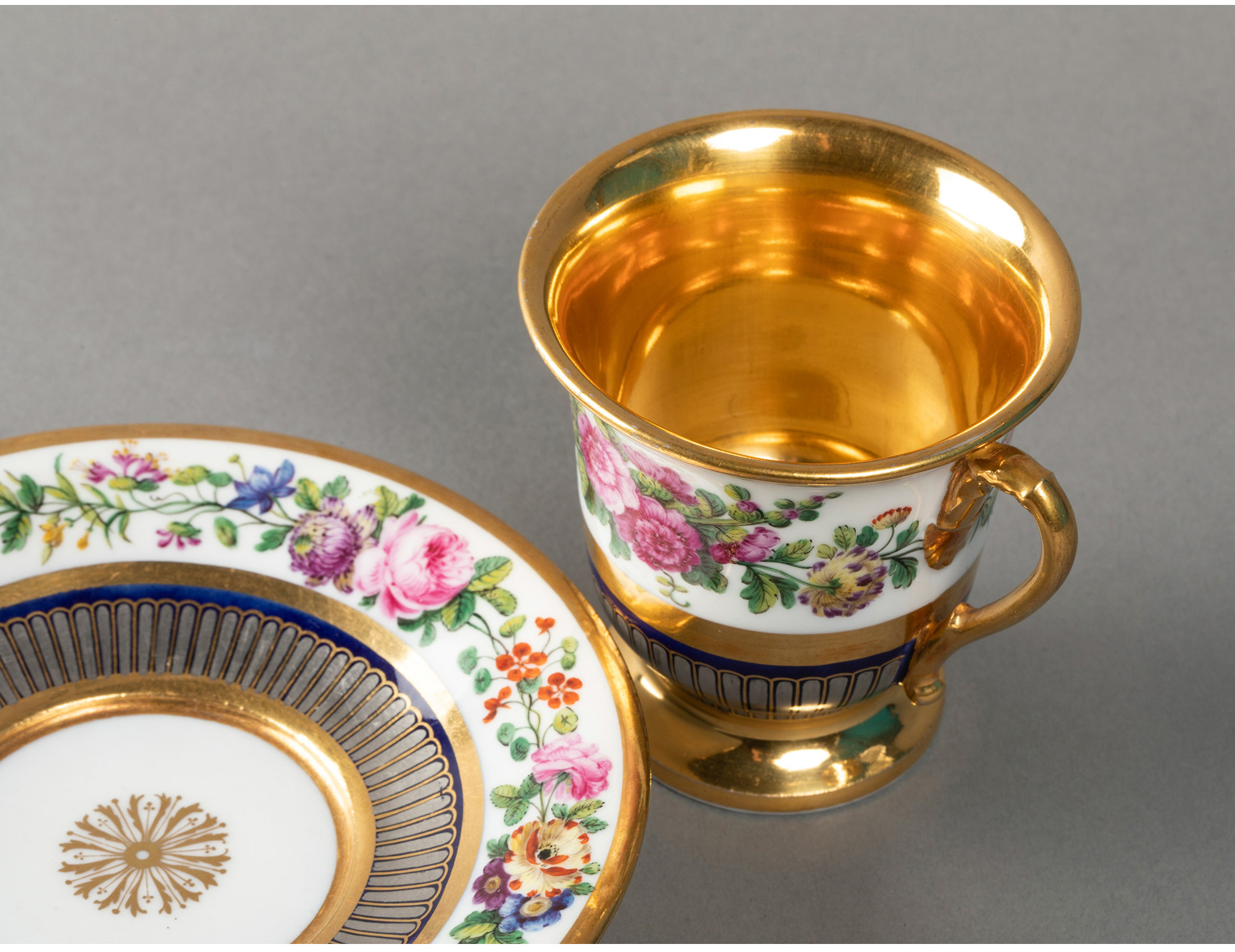 独角鹿西洋古董法国Feuillet瓷窑手绘花卉铂金描金咖啡杯碟套装