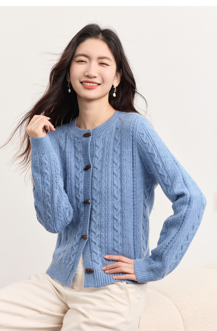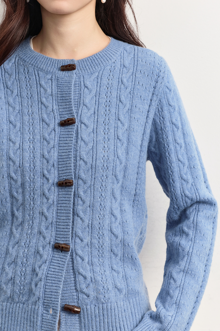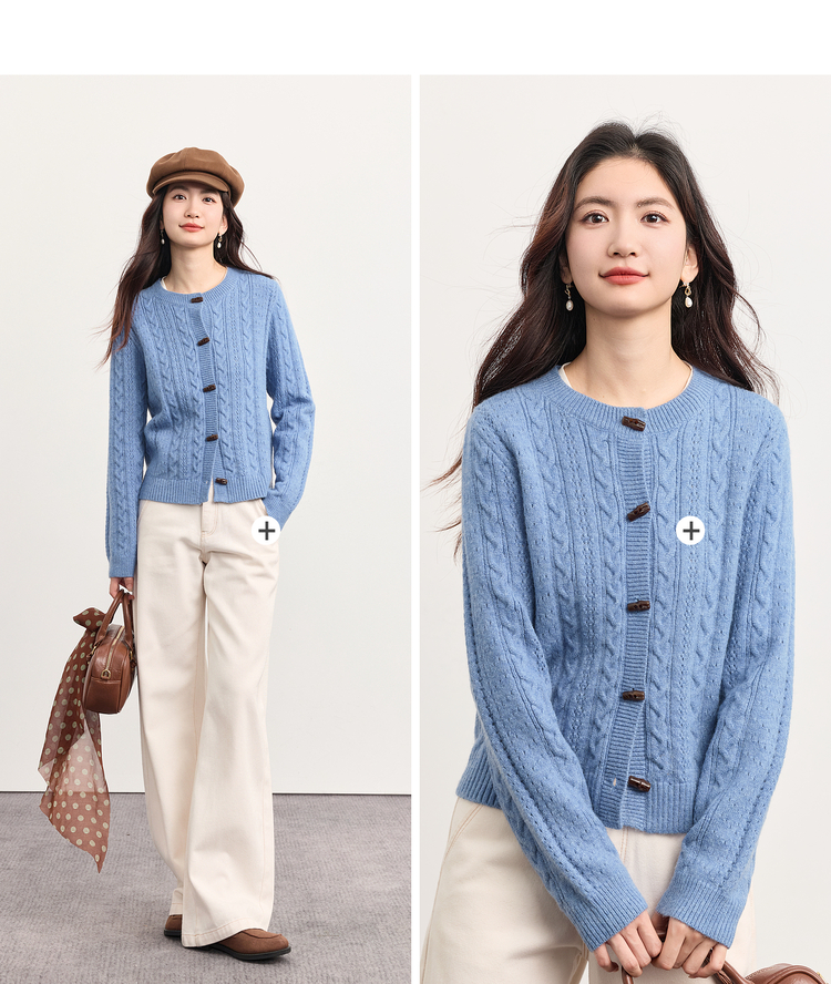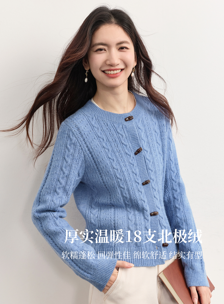 【11/14新品】熙世界超好看蓝色牛角扣毛衣开衫女秋冬圆领北极绒麻花针织短外套