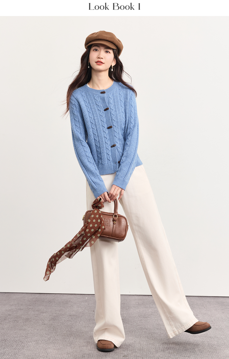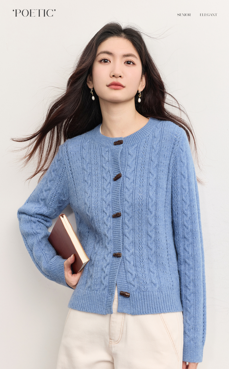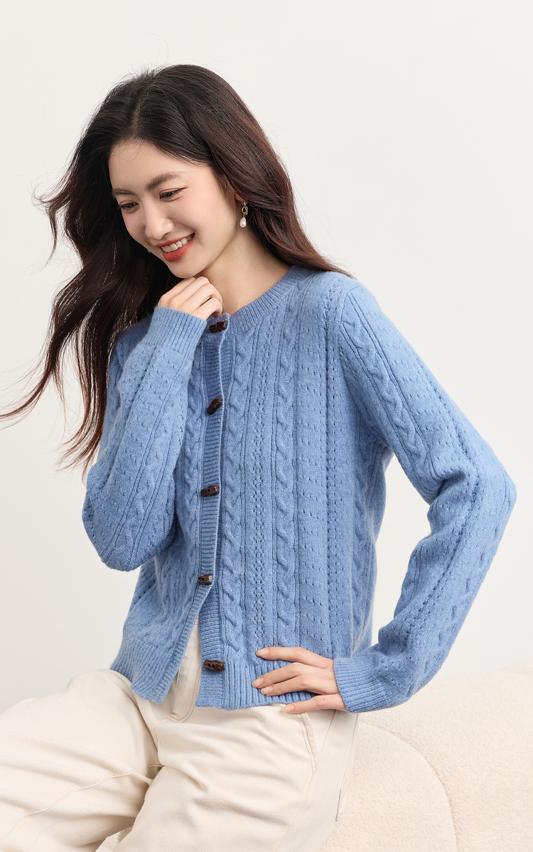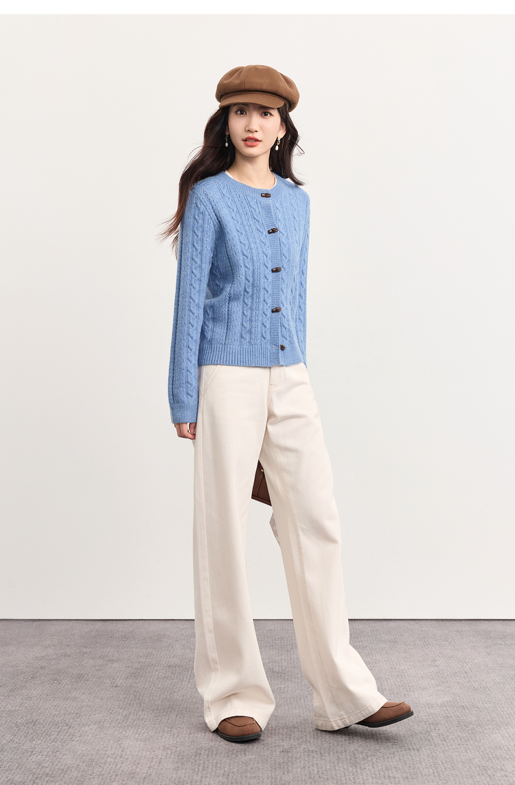 【11/14新品】熙世界超好看蓝色牛角扣毛衣开衫女秋冬圆领北极绒麻花针织短外套